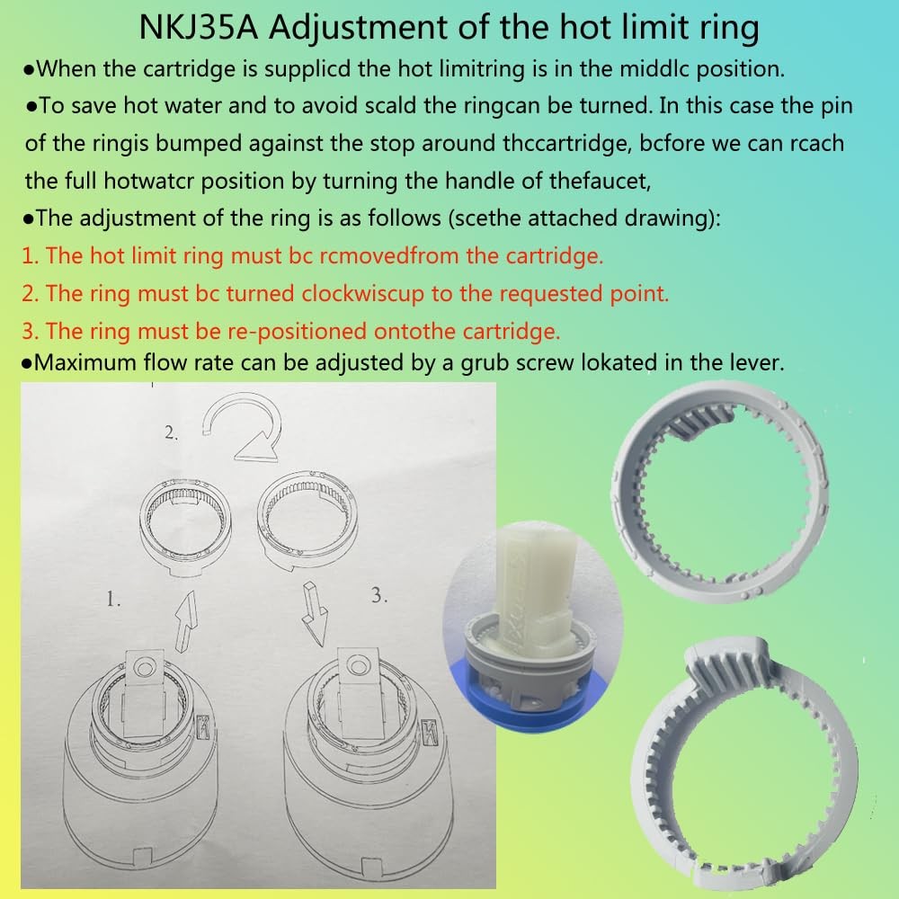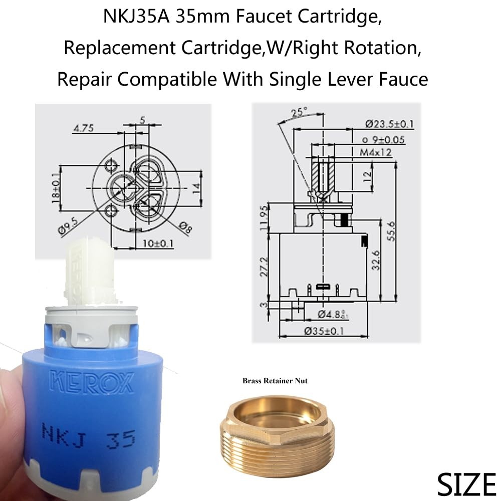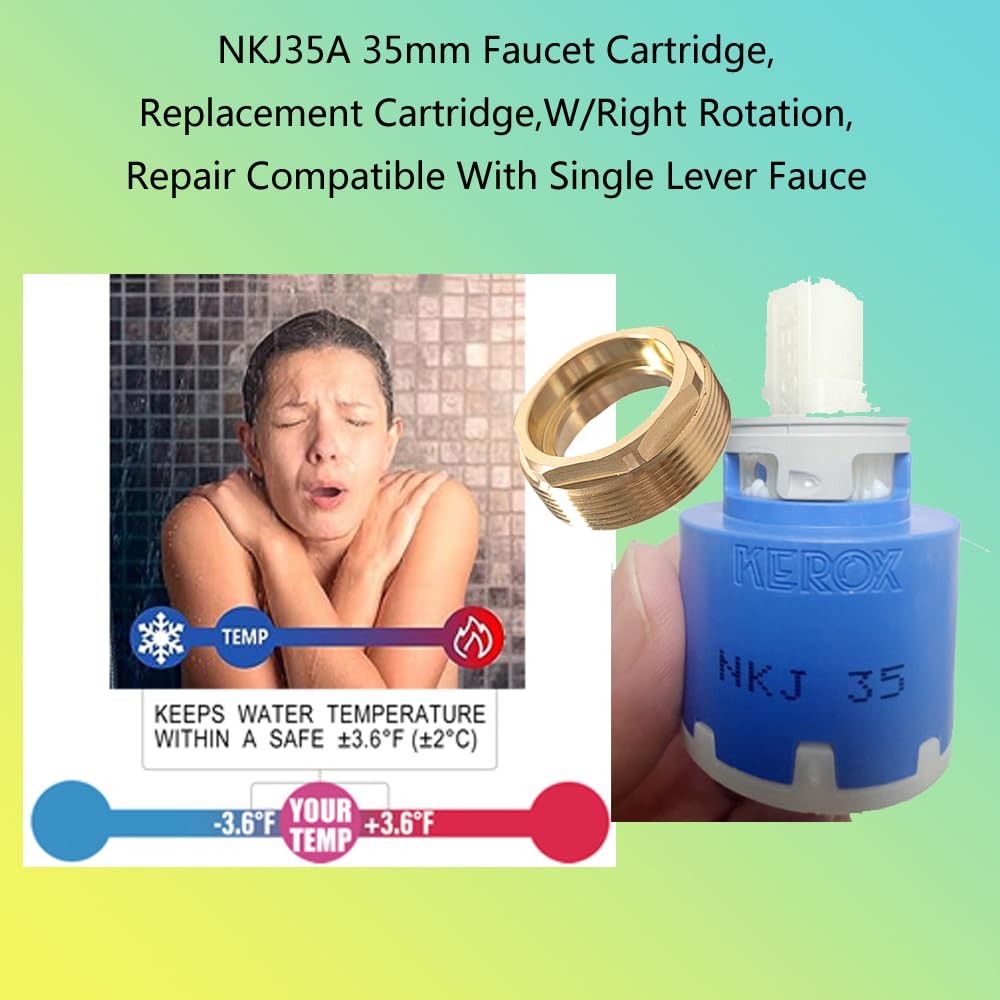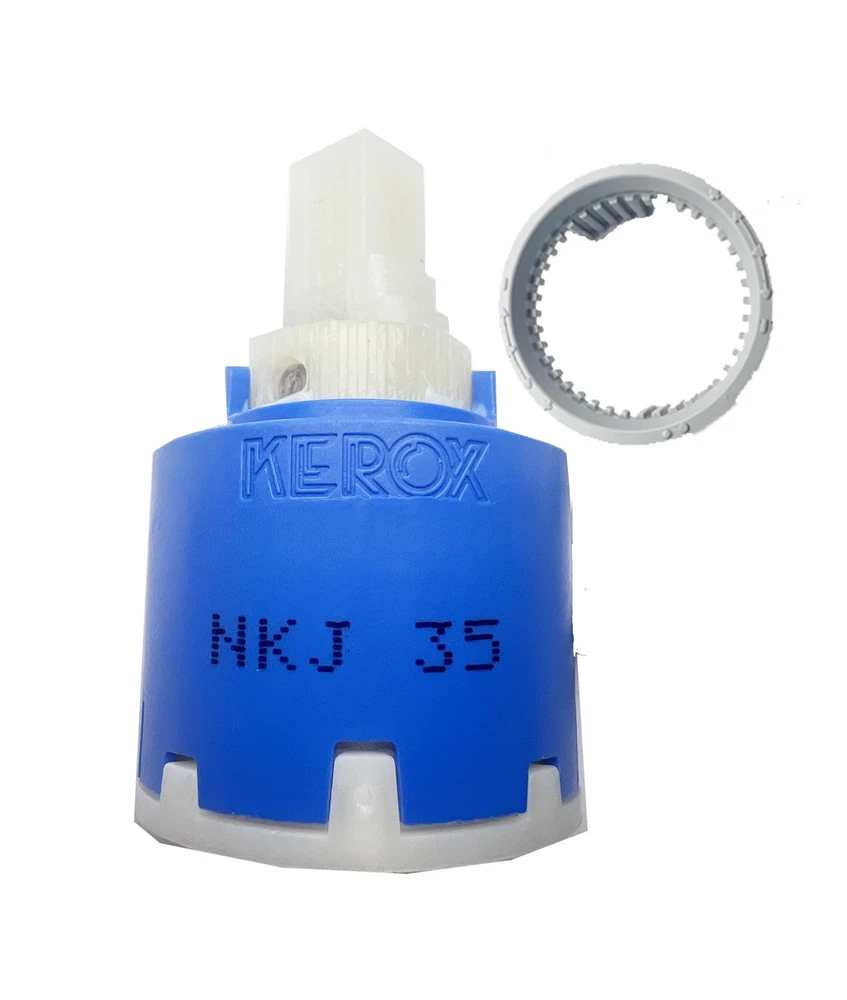 NKJ35A 35mm Faucet Cartridge, Replacement Cartridge,W/Right Rotation, Repair Compatible With Single Lever Fauce -KEROX HANDLE ROTATION: The NKJ35A single-handle faucet rotates differently than the regular K35A cartridge. The NK-35 model has either NKJ (right rotation of temperature range) or NKB (left rotation of temperature range) volume and temperature control. Both options, however, are ideal for a side-mount faucet to keep the lever from hitting the backsplash. COMPATIBILITY: The Kerox NKJ35A cartridge fits the La Torre Single Lever Faucet 12781. This repair part has flat or distributor bottom options, two (2) locating pins, and an adjustable hot limit stop. This cartridge is made of ceramic, the latest development in faucets' modern technology. Safety:This cartridge designed with pressure balance to keep water temperature within a safe ±3.6°F (±2°C), can help to protect you from sudden changes in hot or cold water pressure. Adjustment of the hot limit ring 1、When the cartridge is supplicd the hot limit ring is in the middlc position. 2、To save hot water and to avoid scald the ring can be turned. In this case the pin of the ring is bumped against the stop around thc cartridge, bcfore we can rcach the full hot watcr position by turning the handle of the faucet, 3、Maximum flow rate can be adjusted by a grub screw lokated in the lever. Easy Installation: Simple to install, allowing for a quick and efficient repair or upgrade of your shower system.