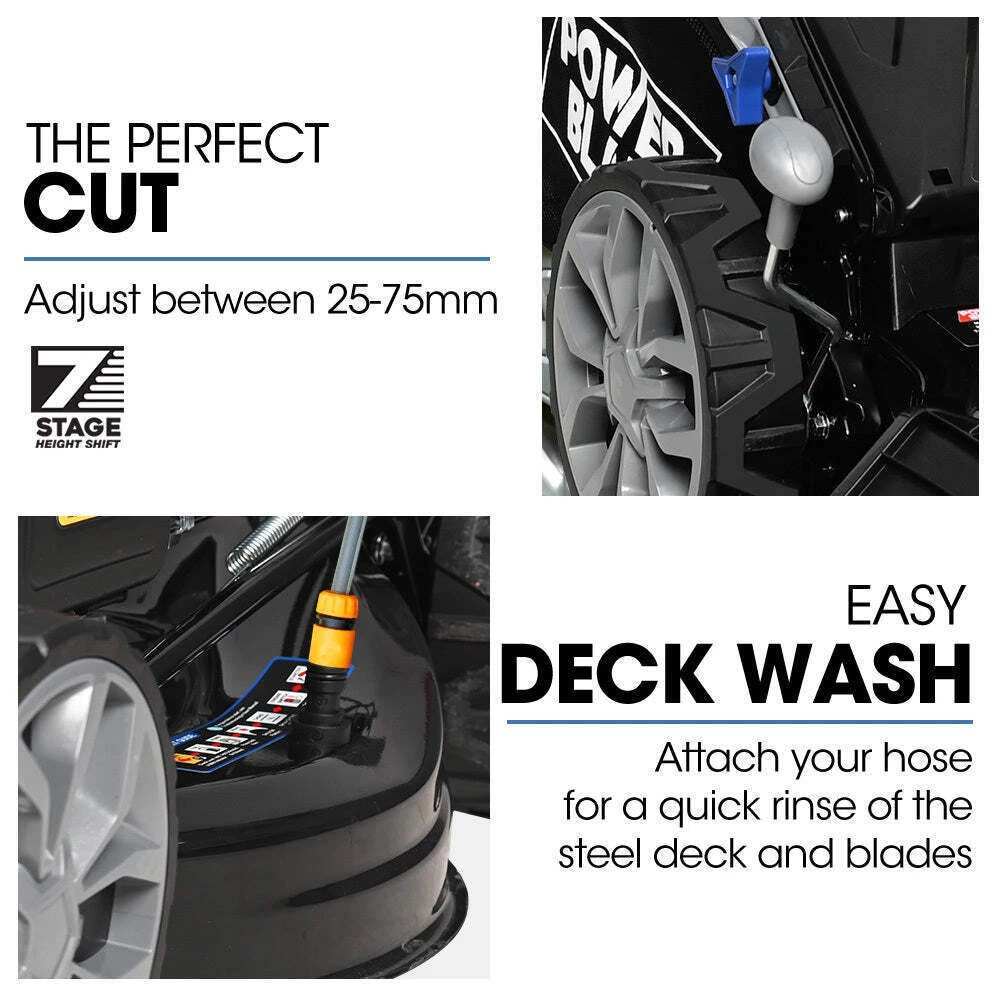 NNEMB 22' 224cc Self-Propelled Lawn Mower, Electric Start, 7 Height, Steel Deck, Deck Wash Port, OHV 4-Stroke Petrol - VS1000 Transform mowing into a walk in the park with the PowerBlade VS1000. This self-propelled beast makes every, even on sloping terrain. Powered by a robust 6.0hp 224cc OHV 4-stroke engine, simply push the electric start button and tackle your lawn effortlessly and efficiently. The durable steel deck features 7 adjustable height positions, ranging from 25mm to 75mm, allowing you to achieve the perfect cut every time. The versatile VS1000 offers three cutting options: Catch: For superior results Mulch: Use the included plug to nourish your lawn with natural nutrients Side Discharge: Attach the chute to handle tall or damp grass with ease Navigate any terrain smoothly with oversized wheels and premium bearings, while the heavy-duty quad swing blade system ensures a precise cut of a very wide 22-inch path. The swing blades are designed to protect the shaft in the event of a solid object being hit. The generous 60L catcher means fewer stops and more continuous mowing. For added convenience, the VS1000 includes a drink holder, so you can stay refreshed while you work. Maintenance is a breeze with the easy-to-use deck port – just attach your hose for a quick and thorough clean. Upgrade to the PowerBlade VS1000 and look forward to a superior lawn with less effort. Powerful 224cc OHV Euro V standard motor Self-propelled design Huge 22' cutting width Push button electric starting system Rugged steel deck for ultimate durability Catch, Mulch or Side Discharge options 7-position central height adjustment Large 60L catcher Oversized 8' and 10' wheels Quad Swing blade system Quick-release folding handle for more compact storage Deck Wash Port for an easy rinse with the garden hose Integrated drink holder Serious quality backed by a 2 year warranty Brand: PowerBlade Model: VS1000 Engine Type: Air Cooled 4-Stroke Power Type: Petrol Fuel Type: Petrol Regular Unleaded 95+ RON Engine Displacement: 224cc Starting System: Push Button (Electric) Blade Style: Rotary Blade Type: Swing Blade Qty: 4 Cutting Width: 22” Deck Material: Steel Cutting Height: 25 - 75mm Front Wheels: 8' Rear Wheels: 10' Height Adjustment System: Central, 7 Positions Warranty: 24 Months IN THE BOX 1 x PowerBlade VS1000 Self Propelled Lawn Mower 1 x 60L Catcher 1 x Side Chute 1 x Mulch Plug 1 x 20V 2.0Ah Lithium Battery 1 x Charger Note: User Manual is accessible online. Minimal Assembly Required SIZE & WEIGHT Product Dimensions (W x L x H): 71 x 160 x 108cm Product Weight: 35kg Carton Dimensions (L x W x H): 88 x 60 x 47cm Carton Weight: 39kg NNEMB 22' 224cc Self-Propelled Lawn Mower, Electric Start, 7 Height, Steel Deck, Deck Wash Port, OHV 4-Stroke Petrol - VS1000 Transform mowing into a walk in the park with the PowerBlade VS1000. This self-propelled beast makes every, even on sloping terrain. Powered by a robust 6.0hp 224cc OHV 4-stroke engine, simply push the electric start button and tackle your lawn effortlessly and efficiently. The durable steel deck features 7 adjustable height positions, ranging from 25mm to 75mm, allowing you to achieve the perfect cut every time. The versatile VS1000 offers three cutting options: Catch : For superior results Mulch : Use the included plug to nourish your lawn with natural nutrients Side Discharge : Attach the chute to handle tall or damp grass with ease Navigate any terrain smoothly with oversized wheels and premium bearings, while the heavy-duty quad swing blade system ensures a precise cut of a very wide 22-inch path. The swing blades are designed to protect the shaft in the event of a solid object being hit. The generous 60L catcher means fewer stops and more continuous mowing. For added convenience, the VS1000 includes a drink holder, so you can stay refreshed while you work. Maintenance is a breeze with the easy-to-use deck port – just attach your hose for a quick and thorough clean. Upgrade to the PowerBlade VS1000 and look forward to a superior lawn with less effort. Powerful 224cc OHV Euro V standard motor Self-propelled design Huge 22' cutting width Push button electric starting system Rugged steel deck for ultimate durability Catch, Mulch or Side Discharge options 7-position central height adjustment Large 60L catcher Oversized 8' and 10' wheels Quad Swing blade system Quick-release folding handle for more compact storage Deck Wash Port for an easy rinse with the garden hose Integrated drink holder Serious quality backed by a 2 year warranty Brand: PowerBlade Model: VS1000 Engine Type: Air Cooled 4-Stroke Power Type: Petrol Fuel Type: Petrol Regular Unleaded 95+ RON Engine Displacement: 224cc Starting System: Push Button (Electric) Blade Style: Rotary Blade Type: Swing Blade Qty: 4 Cutting Width: 22” Deck Material: Steel Cutting Height: 25 - 75mm Front Wheels: 8' Rear Wheels: 10' Height Adjustment System: Central, 7 Positions Warranty: 24 Months IN THE BOX 1 x PowerBlade VS1000 Self Propelled Lawn Mower 1 x 60L Catcher 1 x Side Chute 1 x Mulch Plug 1 x 20V 2.0Ah Lithium Battery 1 x Charger Note : User Manual is accessible online. Minimal Assembly Required SIZE & WEIGHT Product Dimensions (W x L x H) : 71 x 160 x 108cm Product Weight : 35kg Carton Dimensions (L x W x H) : 88 x 60 x 47cm Carton Weight : 39kg × × × × × × × × × × × Buy now and save! Shipping info Click the Shipping & Payments tab above the listing description for more info Click the Shipping & Payments tab above the listing description for more info! Additional delivery notes PICK UP OPTION Our items are available for pick-up. Pick up procedure is as follows: Purchase the item through eBay Email us to coordinate pickup PAYMENT Immediate payment is required upon selecting "Buy It Now" or upon checking out through the cart. We accept payment via All Major Credit Cards (Visa, Mastercard, AMEX, Discover), Google Pay, PayPal, & Apple Pay (on mobile & eBay App). Thank you for shopping w