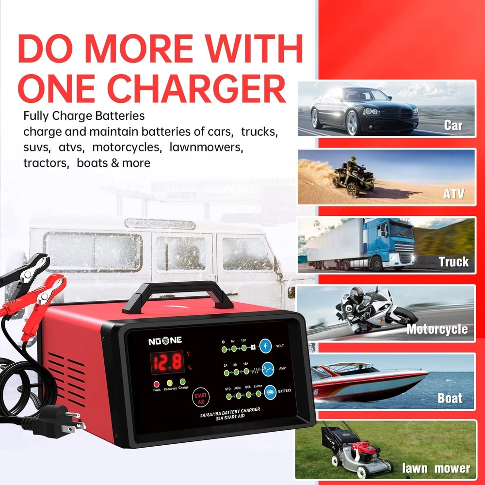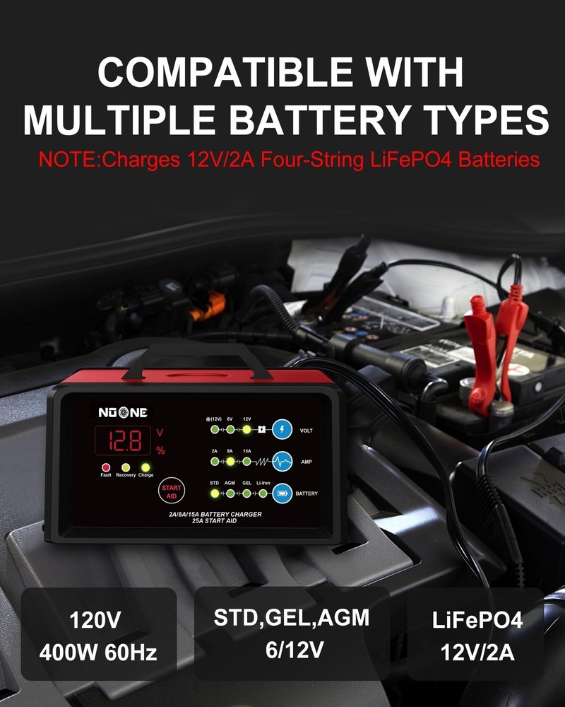 NOONE Smart Car Battery Charger: 2/8/15A Battery Chargers 6V/12V Boat Battery Chargers with Engine Start, Metal Shell, Winter Mode, Suitable for AGM, EFB,AGM, Lead Acid, Lithium (LiFePO4) Batteries Product Details Color: 2A/8A/15A Brand: Noone MPN: BTC-6015A UPC: 723884697219 EAN: 0723884697219 Brand: Noone Color: 2A/8A/15A Product Dimensions: 9"D x 8"W x 6"H Output Voltage: 12 Volts, 6 Volts Specification Met: ETL, FCC Manufacturer: NOONE Brand: Noone Item Weight: 5.14 pounds Product Dimensions: 9 x 8 x 6 inches Item model number: BTC-6015A Manufacturer Part Number: AMBT008-FBA004M Amperage: 15 Amps Date First Available: January 18, 2024 ETL CERTIFICATION AND MULTIPLE SAFETY PROTECTION :NOONE car battery charger has passed the strict ETL certification, and the charger has multiple protections such as spark, reverse polarity, overcharge/overdischarge, overvoltage, overcurrent, overload, overheat, reflow, short circuit, and so on. Protect you and your car SUPER HIGH CONVERSION EFFICIENCY : The 2A/8A/15A battery charger's adopts upgraded high frequency chip, the conversion efficiency is up to 89.3%, which is higher than other battery chargers with 65% conversion efficiency, which means the charging speed will faster than other chargers in the same charging time ENGINE START AND WINTER MODE : Engine start delivers 25A current helps activating your car battery to start your vehicle in 60 seconds. Winter mode increases the charging voltage by +0.2V based on the original charging voltage, improving battery activity for more thorough charging in low-temperature conditions LED SCREEN AND 7-STAGE INTELLIGENT CHARGING : With true 7-stage smart charging (desulfurization, soft start, bulk charge, absorption, analysis, repair, float), it optimizes battery life and repairs batteries without overcharging or damaging them. The HD LCD screen allows you to view the charging stage and charging current and voltage, keeping you informed of the charging status ALL-IN-ONE COMPATIBLE DESIGN : NOONE Battery Maintainer can test, charge and repair all 6/12-volt lead-acid, AGM, Gel, EFB or lithium (LiFeP04) batteries. The automotive battery charger is perfect for the batteries of cars, motorcycles, lawnmowers, ATVs, lawn tractors, SUVs, boats, and etc THE BRAND NAME YOU CAN TRUST :NOONE brand chargers come with a 3-year product service. If you have any questions, please feel free to contact us STEPS FOR SAFE USE :First connect the plug to the 120V power supply, second select the appropriate (charging voltage, charging current and battery type) according to the battery specifications, and finally connect the clamp to the battery to complete the charging. After use, first unplug the clamp from the battery and then unplug the plug from the 120V power supply