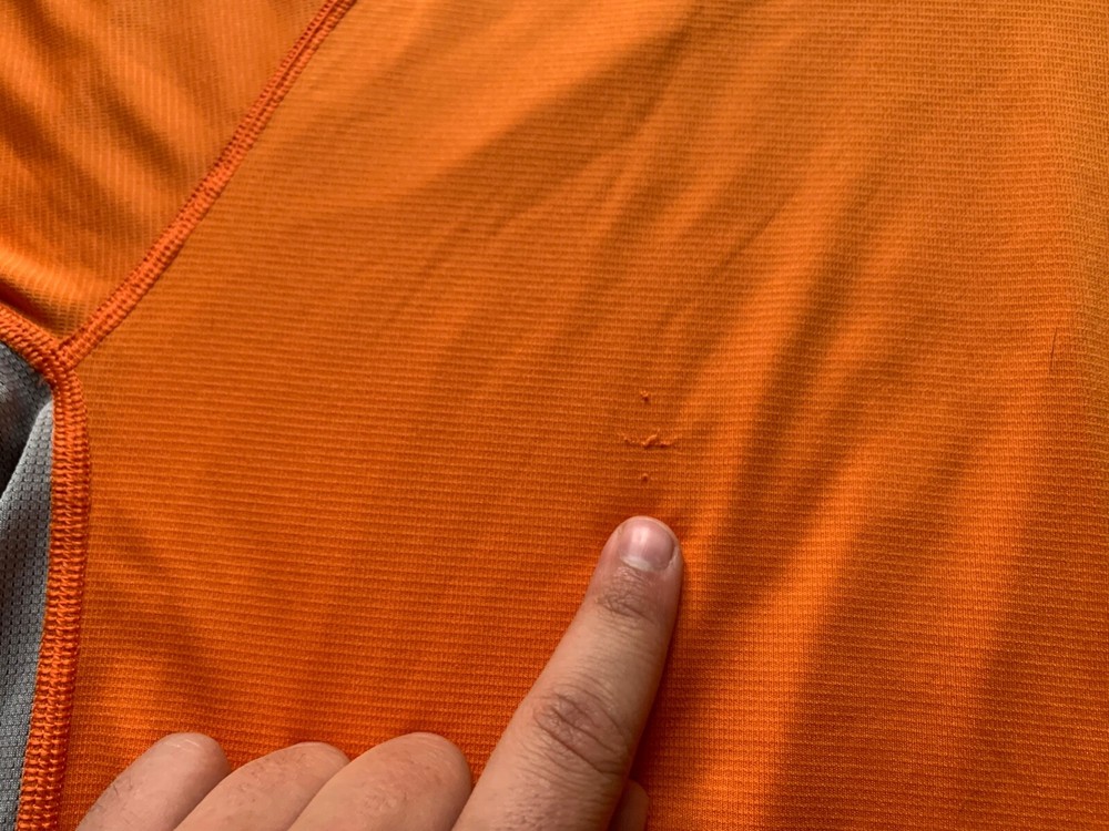 This is a men's North Face shirt in size Large, featuring a crew neckline and short raglan sleeves. It is made of lightweight and breathable microfiber polyester fabric, ideal for gym, walking, running, and other active pursuits. The orange shirt has a logo accent and is designed for outdoor and sports activities like cross training and jogging. Easy to care for with machine washable fabric. Notice small imperfections in pictures.
