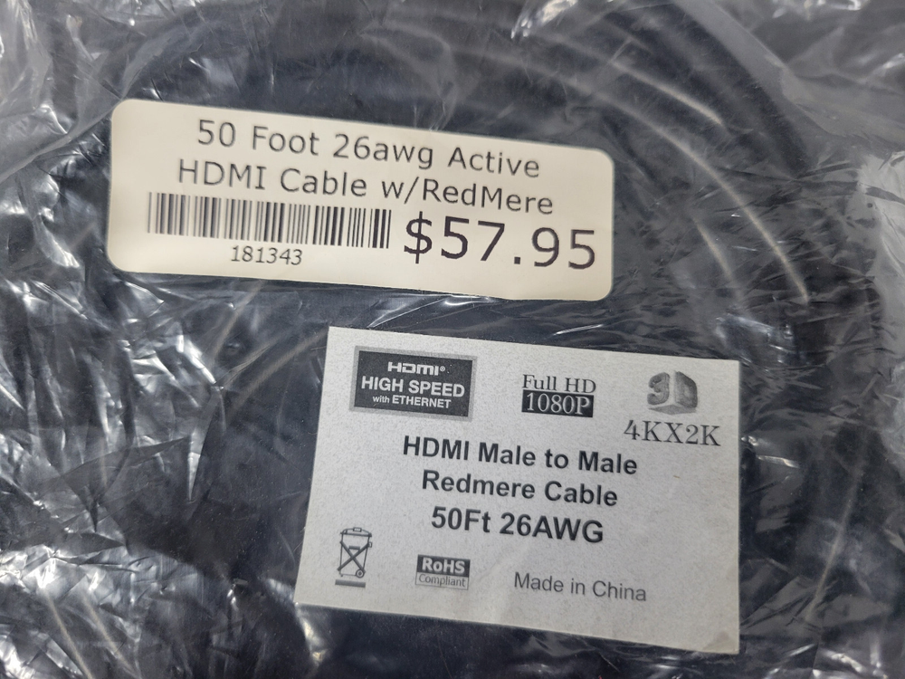 New old stock. Unbranded HDMI cable. 50 foot 26awg active HDMI cable w/redmere Male to Male Full HD 1080P 4KX2K RoHS compliant Item will ship within one business day of completed sale. I DO NOT ship media mail. All items will be securely packaged and will ship USPS Ground Advantage, Priority mail, UPS or Fedex depending on weight and size. I do offer a 30-day money back guarantee on almost every item I sell. If there are issues with your item, please return it for a refund. Refund will be issued upon return of item. Some restrictions may apply. It is always appreciated if you contact me before starting a return so that I can try and assist without the hassle of a return.