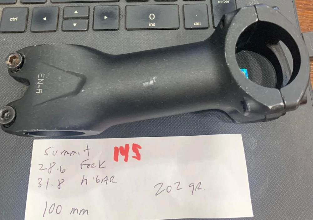 NOS Mountain Bike Black Summit Threadless Front Load Stem Gooseneck 5-degree rise, 100mm long, alloy with a 28.6 steering tube opening and bar opening of 31.8. NOS Mountain Bike Threadless Summit Stem 100mm 5 Degree 31.8 Steerer 28.6 #145 NOS Mountain Bike Threadless Summit Stem 100mm 5 Degree 31.8 Steerer 28.6 #145 Description You are buying a NOS Mountain Bike Black Summit Threadless Front Load Stem Gooseneck 5-degree rise, 100mm long, alloy with a 28.6 steering tube opening and bar opening of 31.8. Shipping will be $6.95 in the 50 states. I will ship overseas. Payment must be received before 7 days after purchase of item. Please ask all questions before buying. Add me to your Favorite Sellers View My Other Items For Sale Visit My eBay Store For Immediate Purchases And Shipping. Click images to enlarge Get images that make Supersized seem small. Showcase your items with Auctiva's Listing Templates! THE simple solution for eBay sellers. Track Page Views With Auctiva's Counter