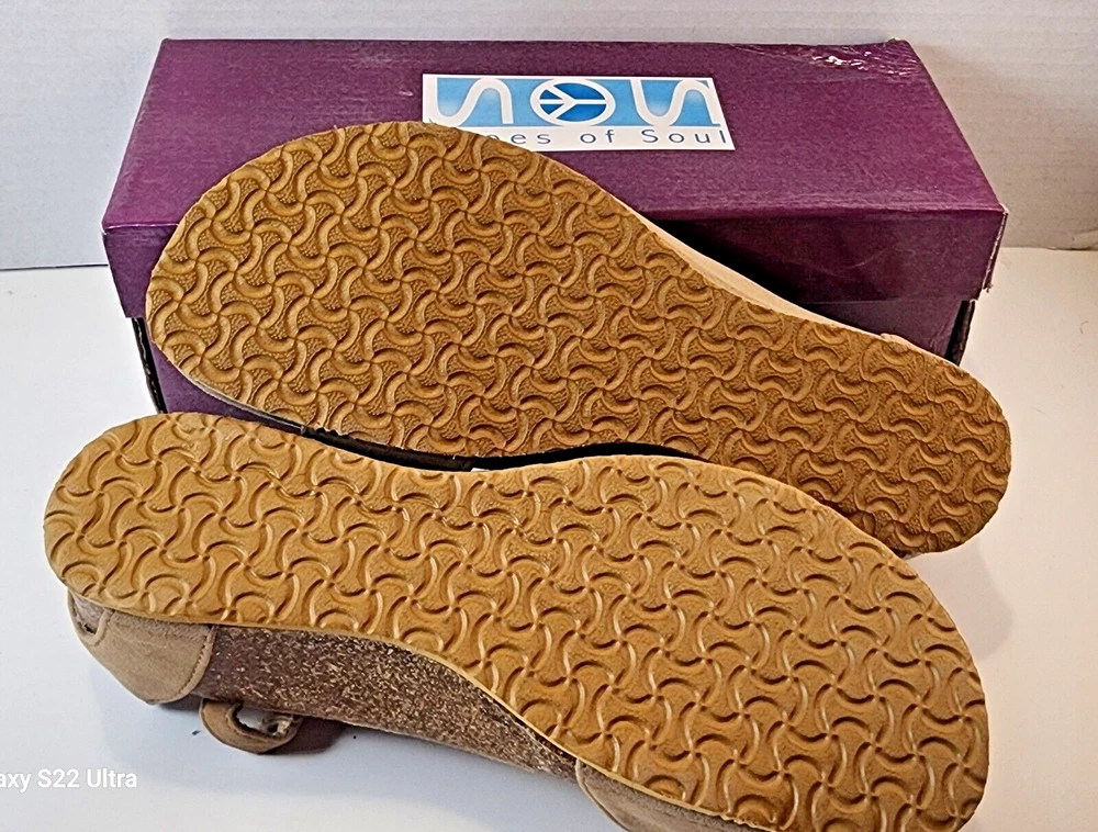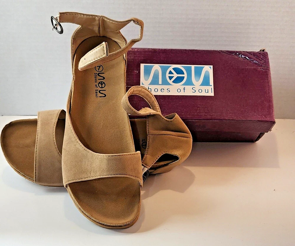 Elevate your warm-weather wardrobe with these chic NOS Shoes Of Soul sandals. Striking a perfect balance between elegance and comfort, these size 7 strappy heels flaunt a versatile tan/nude hue that seamlessly transitions from day to night. The faux leather upper provides a sophisticated finish, while the slight wedge heel offers a subtle lift. Designed with the modern woman in mind, these sandals feature an adjustable ankle strap and a secure buckle closure for a personalized fit. The open-toe style keeps your feet breezy and cool, making them an ideal choice for any summer soiree or casual brunch with friends.