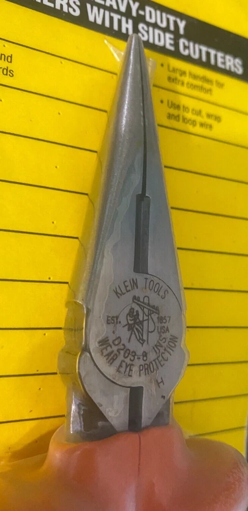 KLEIN TOOLS 8-IN 1000V INSULATED HEAVY-DUTY LONG-NOSE PLIERS WITH SIDE CUTTERS RARE, NEW OLD VINTAGE STOCK QTY:( X1) MODEL: D203-8-INS AGE: COPYRIGHT DATE 1995 (Stamped "H") MADE IN USA HIGH QUALITY REDUCE RISK WITH WORK UP TO 1000V COMPLIES WITH IEC 900 AND ASTM F 1505-94 STANDARDS EXTRA-HEAVY DESIGN FOR EASIER CUTTING LARGE HANDLES FOR EXTRA COMFORT USE TO CUT, WRAP, AND LOOP WIRE Condition: New Vintage Old Stock: I've been storing these since I closed my tool store in 2005. Some bends on the cardboard packaging. and wear along the packaging edges. The pliers are in new condition. I don't see any signs of rust. Shipping Costs: Since most of my tools are vintage. I ship them in boxes with really good packing. If you need a better shipping rate, I might be able to package your item(s) in a padded envelope instead which should cost much less, but it will not be as protected. If you need me to ship in an envelope instead please reach out and I will revise my listing so you can save $$ on shipping. Product Condition: The tools I am selling are all surplus new old stock that has been moved around a lot over the years since I owned my tool store. Some of the items were taken out of the box for photos. The original boxes and packaging might be in rough condition. Some tools might have some wear, scuffs, scrapes, and minor surface rust spots. The photos are of the item(s) the winner will receive, and no additional item(s) not pictured in the photos are available to include in the auction. Please review all of the photos and descriptions carefully. T erms of Sale: Please read these terms and conditions carefully. Refunds & Concerns: My listings show that I do not accept refunds. Please contact me immediately if you have concerns about your product or need a refund. My customers are important to me, and I care about them and my feedback score. There is very little that can't be resolved by a quick message to me versus writing a negative review. Please allow me the opportunity to resolve any concerns you might have. Payments: All auctions are prepaid only. I accept Pay online payments through PayPal. I accept credit/debit card payments via PayPal. I do not accept personal/business checks, wire transfers, or ACH payments. Sales Tax: The customer is responsible for payment of all applicable state and local sales taxes. All Idaho residents, please add 6.0% sales tax. C ustomers who want to claim tax exemption must send a tax-exempt form to eBay. eBay collects all sales tax; I have no control. To send your tax-exempt form to eBay, copy and paste the following link into your browser: https://www.ebay.com/help/buying/paying-items/paying-tax-ebay-purchases?id=4771#section2 Shipping Terms: Items will ship within 1-3 business days (excluding holidays). Any listings that I offer free shipping are only applicable to the US lower 48 states. Please enter your zip code (or country) and quantity in the shipping tab for an accurate quote. Need it urgently? Next-day and Second-Day Air Services are available. Message me, and I will do my best to get it to you quickly. I ship USPS, UPS & FedEx. I choose the carrier. The shipping price listed is the price to ship this item to a residence or a business. If you are a multiple auction winner, I will happily combine shipping. If you have multiple winning auctions, please message me before making payments so I can properly invoice you for shipping. I am generally available 9 am-5 pm Pacific Standard Time Monday through Friday to answer questions. International buyers are responsible for customs fees and duties on items shipped internationally by local laws and regulations. Whether these fees are due at the time of the purchase or on delivery of the item is determined by the shipping method that I (the seller) offer or that the buyer chooses at the time of purchase and the local laws and regulations. Product Compliance and Suitability: Jurisdictions have varying laws, codes, and regulations governing the construction, installation, and/or use of products for a particular purpose. Certain products may not be available for sale in all areas. The seller does not guarantee compliance or suitability of the products it sells with any laws, codes, or regulations, nor does the seller accept responsibility for the construction, installation, and use of a product. The Customer is responsible for reviewing the product application and all applicable laws, codes, and regulations for each relevant jurisdiction to ensure that the products' construction, installation, and/or use are compliant. Seller makes no representations as to the quality, condition, danger, adequacy of warning labels, adequacy of installation or operating manuals, performance, safe operation of, or latent or unknown defects respecting the goods; and Buyer assumes the entire risk as to all of same upon Buyer taking possession of the goods. Seller also states, and Buyer acknowledges, that the goods may bear or contain hazardous chemicals or materials which may be indirectly or directly hazardous to life, health, or property; Buyer assumes the entire risk as to all of same upon Buyer taking possession of the item