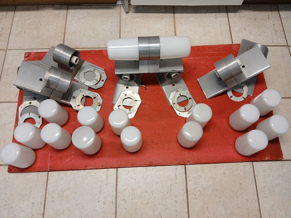 The NOS Vintage Prescolite MCM Atomic WB 2-2 Wall Sconce is a stylish and unique lighting fixture that showcases a Mid-Century Modern design with a brushed aluminum and opal white glass finish. This wall-mounted sconce adds a touch of retro charm to any indoor space, especially in a bathroom or porch setting. Manufactured by Prescolite, this cylindrical shaped wall sconce priced as one pair features a silver and white color scheme, making it a standout piece for those looking to add a vintage flair to their home decor. 7 more individually priced. not a package deal unless purchases made.