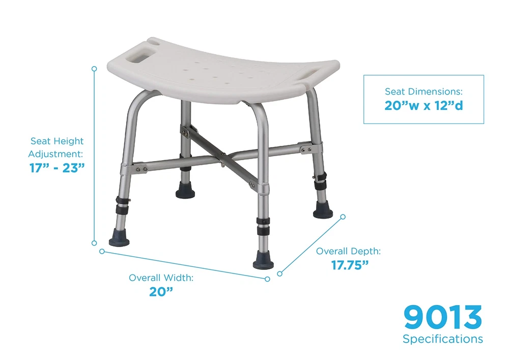 NOVA Medical Products Heavy Duty Shower Bath Chair 500 lb. Weight Capacity Quick Easy Tools Free Assembly Lightweight Seat Height Adjustable Great for Travel, White, 1 Count Heavy duty 500 lb. Weight capacity shower and bath chair has a reinforced frame for strength and durability. Shower chair also available with back (NOVA heavy duty shower chair with back 9023) Shower or bathe in comfort and safety on a bath chair with dual sided handles and hand held shower holders. Assembles in minutes – Tools free assembly. Push button - snap together design requires No tools and assembles and un-assembles in just minutes. Great for storage or travel. Durable & lightweight design is made of blow molded plastic and rust proof aluminum. Skid resistant rubber tips have a wide base and drainage holes. Specifications: weight capacity: 500 lbs., seat dimensions: 20"W x 12"D; seat height adjustment: 17"-23", footprint on lowest adjustment - 18.5"W x 16.75"D, footprint on highest adjustment – 19.75"W x 18"D; overall dimensions on lowest adjustment - 20"W x 16.75"D, overall dimensions on highest adjustment - 20"W x 18"D, product weight: 5 lbs. 9013 features: -heavy duty blow molded seat. -Aluminum anodized frame. -Weight capacity: 500 lbs. -Bathroom 365 collection. Product type: -shower Chair. Weight capacity: -500 pounds. Adjustable: -Yes. Corrosion resistant: -Yes. Dimensions: -seat depth: 12". Overall Width - side to side: -20". Overall depth - Front to back: -18.25". Overall product weight: -5 lbs. Overall Height - Top to bottom: -15.5". Overall Height - Top to bottom: -21". Shipping We offer FREE shipping on all orders! We use a selection of shipping services such as UPS, FedEx, USPS etc. We only ship to the lower 48 states, no APO/FPO addresses or PO Boxes allowed. Local pickups and combined shipping options are not provided at this time. Return You can return a product for up to 30 days from the date you purchased it. Any product you return must be in the same condition you received it and in the original packaging. Please keep the receipt. Payment We accept payment by any of the following methods: PayPal Please pay as soon as possible after winning an auction, as that will allow us to post your item to you sooner! Feedback Customer satisfaction is very important to us. If you have any problem with your order, please contact us and we will do our best to make you satisfied. Contact Us If you have any queries, please contact us via ebay. We usually respond within 24 hours on weekdays. Please visit our eBay store to check out other items for sale! Thank you for shopping at our store.