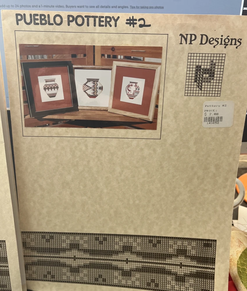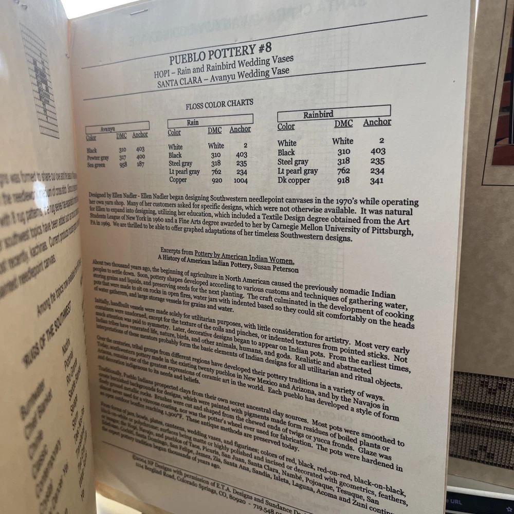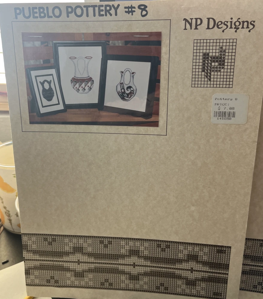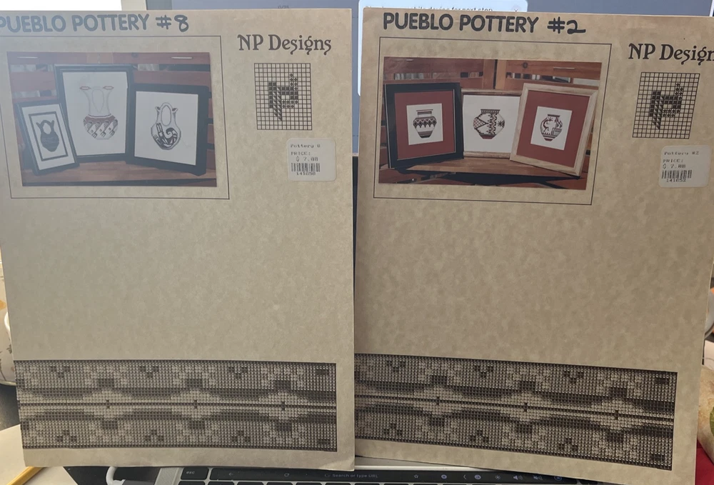 NP DESIGNS Counted Cross Stitch Pair- Pueblo Pottery #2 Flute Player, Geometric polychrome and Contemporary Designs 2004 Pueblo Pottery #8 Hopi Rain and Rainbird Wedding Vases Santa Clara Avanyu Wedding Vase 2004
