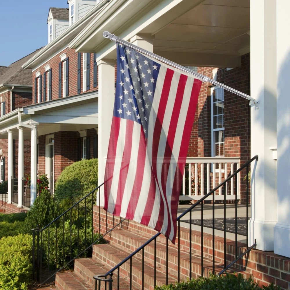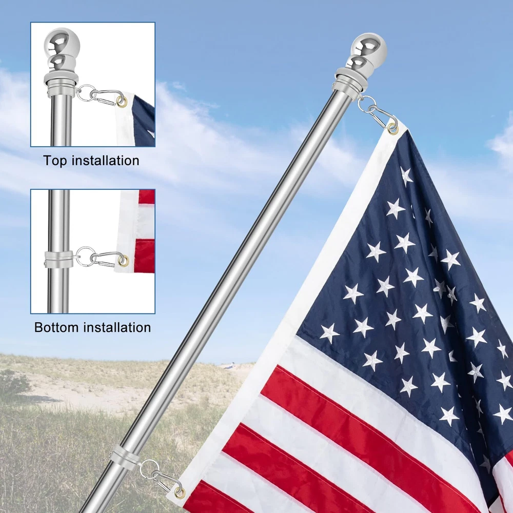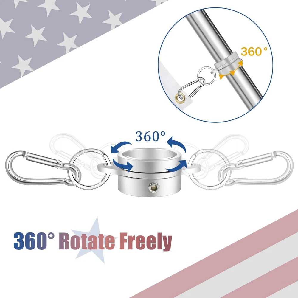 Designed for flags with grommets only, We add a chain ring in order to make the best stabilizer clips for keeping flags in place and hang your flag more conveniently.The flag can be rotated 360 degrees freely, and it will not be twisted or folded in the wind. Rust Free Material: The ring and carabiner are made of aluminum alloy,the chain Ring is made of zinc alloy, the adjustable screw is made of Stainless Steel, which can adapt to all kinds of bad weather, and is not easy to deform or rust, can be used for a long time. Suitable for 1 inch Flagpole DiameterThe inner diameter of this rotating ring is 1.06 Inch fits most standard 1 Inch diameter flagpole, just put the pole in the ring and fasten the screw by wrench Specification: * Material: Aluminium Alloy * Color: Silver * Outside Diameter: 1.6 inches * Inner Diameter: 1.05 inches * Height: 1.2 inches Package: * 2 x Aluminum Flagpole Rotating Rings * 2 x Aluminum Carabiners * 2 x Zinc Alloy Chain Rings * 2 x Stainless Steel Adjustable screws * 1 x Hexagon Wrench * 1 x Manual Note: More Than 1.05 Inches Outside Diameter of the Flagpole Can't Be Used The small parts may include, please use it carefully and keep away from children. Do not stretch the flag too tight after install our rings New Upgraded Design - The mounting rings have a 360 degrees rotating anti-wrap ring, and we add a strong chain ring in order to make the best stabilizer clips for keeping flags in place and hang flag more conveniently. It allows flags to fly freely in the direction of the wind, and preventing the flag from wrapping around the flagpole. Durable Aluminium Alloy Material- Our flag pole ring is made of aluminum alloy, which can adapt to all kinds of bad weather, and is not easy to deform or rust, can be used for a long time. 1 Inch Diameter with Adjustable Screw - The inner diameter is 1.05 Inch, compatible with any flagpoles that's 1 Inch Diameter & designed for flags with grommets.Please choose the right size before buying. Meticulously Crafted - Equipped with two carabiner and two chains to connect the flag pole and flag, just hang the carabiner between the flag pole hole and the chain to reduce installation difficulty. Feel free to display your favorite flag, whether it's a national flag, a team flag, or a cultural flag. Support your favorite sport or cause.