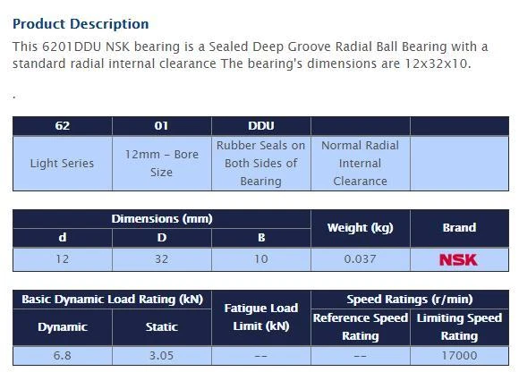 Description: Item: 6201-DDU Bearing Type: Single row deep groove ball bearings SKU: 6201 2RS Bearing Inner Ring Diameter (bore): 12mm Inner Ring Tolerance: 0~-10mm Outer Ring Diameter: 32mm Outer Ring Tolerance: 0~-13mm Width: 10mm Clearance: 0~10µm Basic Dynamic Load Rating Cr: 7.28 kN Basic Static Load Rating Cor: 3.1 kN Grease Lubrication: 15000 Brand: NSK Closed with rubber seals Grease lube Equal 62012RS Equal Koyo 62012RS Equal Nachi 62012NSL Equal BCA 201DD Equal Fafnir Torrington 201PP Equal Federal 1201RR Equal Hoover 99201 Equal NTN 6201LL Equal MRC 201SZZ Equal Norma Hoffman 201NN Equal New Departure 99501 Equal FAG 62012RS Equal NSK 6201VV Package Include: ONE (1) NSK 6201 DDU BEARING