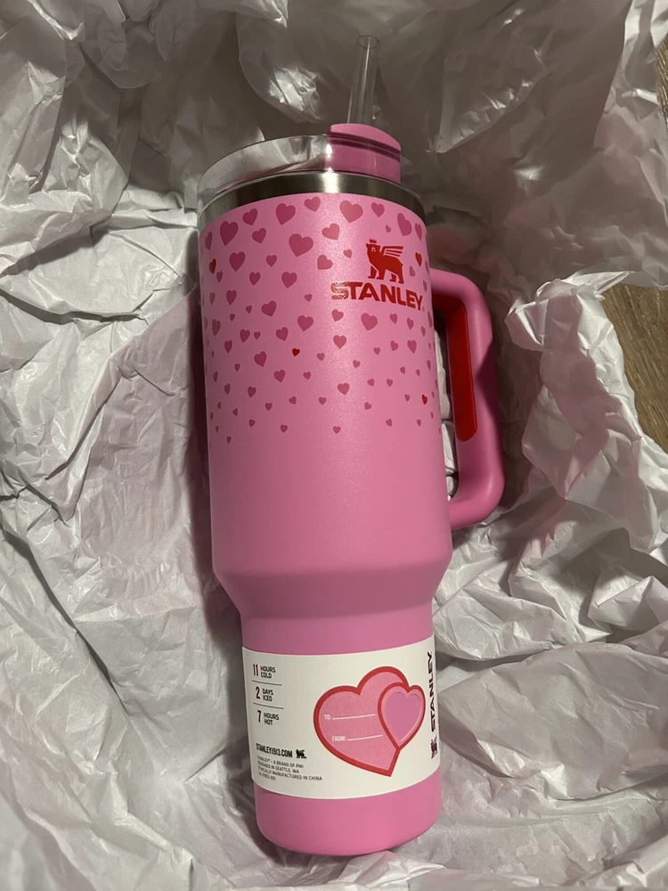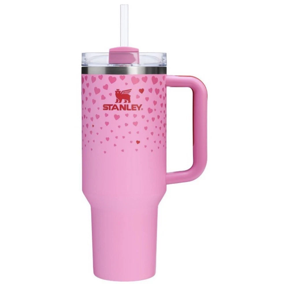 This is a Stanley Target Exclusive Valentine's Day 2025 Sweet Hearts Pink 40oz Tumbler featuring a Hearts pattern and themed around Valentine's Day. The tumbler is designed with a Heart shape and The Queen of Hearts character, perfect for Teens, Adults, and Girls. It has a capacity of 40 oz and is suitable for both hot and cold beverages. The tumbler comes in a vibrant pink color, with a lid and straw for convenience, and is insulated to keep drinks at the desired temperature. Ideal for Valentine's Day celebrations or as a thoughtful gift.