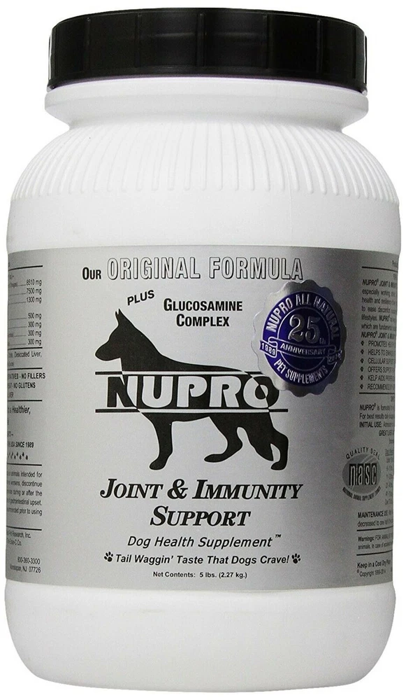 N UPRO ® Joint & Immunity Support D og H ealth S upplement Treat Your Best Friend to a Healthier, Happier Life! N UPRO ® J oint & I mmunity S upport Dog Health Supplement adds Glucosamine Complex, MSM, and Ester-C ® to enrich our Original "Gold" Formula, especially for the Active and/or Senior animal. Your dog now has the benefit of a scientifically balanced combination of select ingredients specifically formulated to support normal joint structure, function and flexibility as well as promote optimal overall health and well-being. N UPRO ® J oint & I mmunity S upport helps to maintain the health and resiliency of joints, muscles and connective tissues, and to ease discomfort associated with normal daily exercise and active lifestyles. N UPRO ® J oint & I mmunity S upport is not just for Senior Dogs or those who may have joint issues! Active athletes (agility dogs, surfing dogs, dock-diving dogs, weight pulling dogs), show dogs, working dogs (police, arson, search and rescue K-9s), sled dogs, hunting dogs, herding dogs, AND large breed dogs, as well, will benefit from the addition of Glucosamine to their daily regimen. N UPRO ® J oint & I mmunity S upport's combination of raw, unprocessed ingredients with the added extras makes for a superior product from which ALL adult dogs will reap the rewards! G lucosamine C omplex (600 mg. per 1 oz. scoop) Our own special blend of Glucosamine (500 mg) and Chondroitin (100 mg) is an easily absorbed natural substance that stimulates the production of proteoglycans. These molecules play a major role in the maintenance and resiliency of healthy connective tissues and the restoration of damaged cartilage cells. Glucosamine Complex also helps to promote production of synovial fluid - a necessity for the proper lubrication and comfort of joints. M S M (300 mg. per 1 oz. scoop) A natural source of bioavailable sulfur, essential to support growth and maintenance of healthy tendons, cartilage and other connective tissues. MSM helps to maintain healthy fluid pressure of soft tissues. *E st e r- C ® C helated M ineral B lend (200 mg. per 1 oz. scoop) Developed by veterinarians to provide dogs with extra Vitamin C to support a strong immune system and healthy joints by boosting absorption of Glucosamine Complex & MSM and promoting collagen formation. N UPRO ® J oint & I mmunity S upport also contains Norwegian kelp, organic cold-milled whole ground flaxseed, yeast cultures, desiccated liver, amino acids and enzymes, garlic, calcium citrate, lecithin and Lactobacillus acidophilus. Please see the "dog formula" page for more detailed info on these ingredients. N UPRO ® formulas are made using only fresh, premium quality ingredients. N UPRO ® products contain no wheat, corn, fillers, grains, artificial sugars or preservatives, glutens or by-products of any kind.