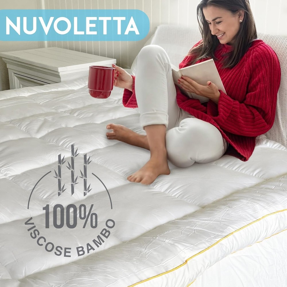 NUVOLETA Queen Mattress Topper, 100% Viscose Bamboo Cooling Queen, White Product Details Brand: NUVOLETTA Color: White Size: Queen Fabric Type: 100% Viscose Bamboo Special Feature: Pillow Top Closure Type: Pull On Product Care Instructions: Dry Clean Only Water Resistance Level: Not Water Resistant Age Range (Description): Child Manufacturer: Summit Jump Product Dimensions: 22 x 16 x 7 inches Item Weight: 13.07 pounds Country of Origin: China Cooling Technology - Stay cool and comfortable all night with our advanced cooling technology. The breathable bamboo fabric wicks away moisture, ensuring a refreshing and sweat-free sleep experience. Extra Thick Padding - Our mattress topper features an extra-thick design for added cushioning and support. Ideal for back pain relief, it helps alleviate pressure points and enhance sleep quality. Hypoallergenic Material - Made from premium hypoallergenic materials, our topper is perfect for those with allergies. It provides a clean and healthy sleep environment, free from allergens and irritants. Secure Fit - The deep-pocket design ensures a secure fit on your king-size mattress. It stays in place throughout the night, providing consistent comfort without shifting or bunching. SLEEP ON CLOUD LIKE COMFORT - Experience unparalleled softness with our Luxury Cooling Down Alternative Mattress Topper. Designed to provide plush support, it transforms your king size bed into a cozy haven. Introducing the NUVOLETTA Luxury Cooling Down Alternative Mattress Topper, the ultimate solution for transforming your king size bed into a haven of comfort and luxury. This king mattress topper is meticulously crafted to provide an unparalleled sleeping experience, combining the plushness of a pillow top with advanced cooling technology to ensure you rest in blissful serenity every night. Designed for those who crave the perfect balance of softness and support, our king size pillow top mattress topper is generously filled with premium down alternative fibers. This extra thick mattress topper king size offers a cloud-like feel, enveloping you in sumptuous comfort while alleviating pressure points, making it ideal for back pain relief. The cooling mattress topper king size is engineered with breathable materials that regulate temperature, ensuring you stay cool and comfortable throughout the night. The NUVOLETTA Luxury Cooling Down Alternative Mattress Topper is not just about comfort; it's also about convenience and durability. The king mattress pad topper is easy to install and stays securely in place, thanks to its deep pockets and elasticized edges. This king bed topper is also hypoallergenic, making it perfect for those with allergies or sensitive skin. Plus, its machine-washable design ensures effortless maintenance, so your bed topper king remains fresh and clean. Elevate your sleeping experience with the NUVOLETTA Luxury Cooling Down Alternative Mattress Topper. Whether you're looking for a king size bed topper, a plush mattress topper king, or a cooling mattress topper king, this versatile product meets all your needs. Invest in your sleep quality and indulge in the luxurious comfort that only NUVOLETTA can provide.