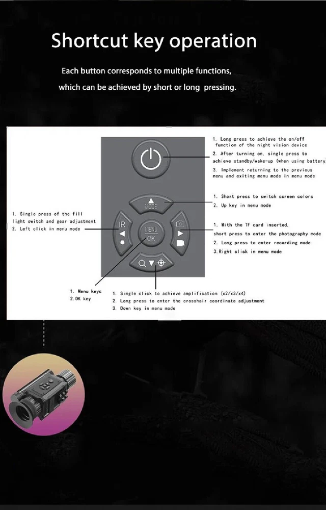 NV002 Night Vision Rifle Scope / Handheld Monocular 4X - 14X Magnification With Built-in Crosshair Reticle Offer Details: Brand Name: LUXUN Model Number: NV002 Reticle: Yes - Crosshair Color modes - 5: Green & black, white & black, yellow & black, blue & black, rainbow Size: 120 x 50x98 mm Weight: 260g Focusing minimum: 3cm Type: Monocular Magnification: Digital Zoom 4X-14X Effective Visual Distance: 300m Operating Voltage: 3.7v Infrared wavelength: 850nm Infrared power: 3w Video format: MP4 Storage type: TF Card Transmission method: TYPE C Infrared range: 200m - 250m Video resolution: 1920*1080 Photo resolution: 3072X1728 Battery: 18650 rechargeable Display resolution: 454x454 Frame rate: 30fps This Exclusive eBay Offer Includes: NV002: 1x Monocular ($200 Value) 1x High Powered IR Torch ($40 Value) 1x Rechargeable battery ($10 Value) That's over $250 in value! That's pretty good considering this offer is comparable to a $2,600 Gen 2+ Military Grade night vision device. Shipping: Free USPS Priority Shipping (2 - 3 Business Days Average - $15 value) *Please note this device is banned from international export. Only U.S. citizens with a U.S. address are legally permitted to purchase this device. **Signature confirmation is automatically included and required for all orders. If you are not available, a slip from USPS will be left for you to sign and acknowledge that you want your parcel left where you specify on the slip. This is a courtesy I add free of charge for you so your order is not stolen. Hey there Friend, My name is Scott, and I was recently awarded my "Top Seller" eBay rank... This is a brand new offer of mine I am excited to offer you. I have been searching for the best affordable night vision devices to offer my customers. This is by far the best bang for your buck that you will find on the internet as of today! I check my eBay messages at least once a day, so please private message me with whatever is on your mind and I promise I will get back to you! -Scott https://www.ebay.com/usr/goldstaroffers