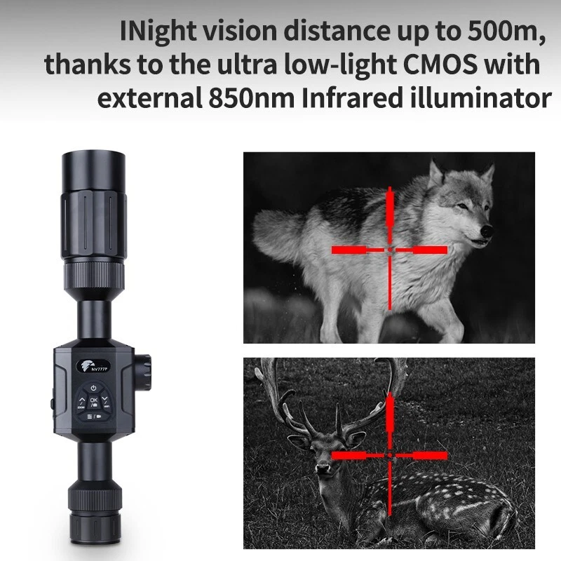 1080p video and 1280x960 dots 0.39'' high resolution display Professional hunting scope, infrared night vision scope, good result in day and night. 1: All housing material are aluminum and lenses material are glass, not plastic material. So strong enough to support impact resistance > 1000G/1ms. 2: Built-in WIFI allows real-time video streaming at your smartphone (default Wi-Fi Password: 12345678), Connect with Smartphone using Roadcam App,support IOS and Android. 3: 1280X960 dots high resolution 0.39'' display, made in Japan. 4: Night vision distance up to 500m, thanks to the ultra low-light CMOS with external 850nm Infrared illuminator 5: High quality Japanese CMOS sensor with photo resolution at 3072X1728 pixels, record video at full HD resolution at 1080P. 6: 5X~ 20X magnification. 7: Compatible to common mounts and fixtures, can also be used with standard 21mm. 8: Eye relief up to 60mm 9: To adjust position of reticle (both day & night mode), simply tap the menu button and enter the "Reticle" > "Reticle adjustment" menu. Then you can adjust the crosshairs in both X and Y directions 10: 18650 Lithium battery is not included due to shipping regulations Hap Hawk scope 1080P digital scope has Sony 1080p CMOS sensor and high resolution 1280x960 dots 0.39" display made in Japan, providing full-color clarity in daytime – with classic emerald or black and white viewing options. It has classic shape and small size shape. Classic shape with 30mm rings to fix and a removable 850nm or 940nm IR Illuminator. All material are Aluminum and glass, impact resistance more than 1000G, 9800J. One shot zeroing Aim at the target, shot, if the bullet hole is not at the center of target, then adjust reticle, make sure the yellow reticle is at the center of target, then adjust the red reticle to the bullet hole, click OK. 360m away