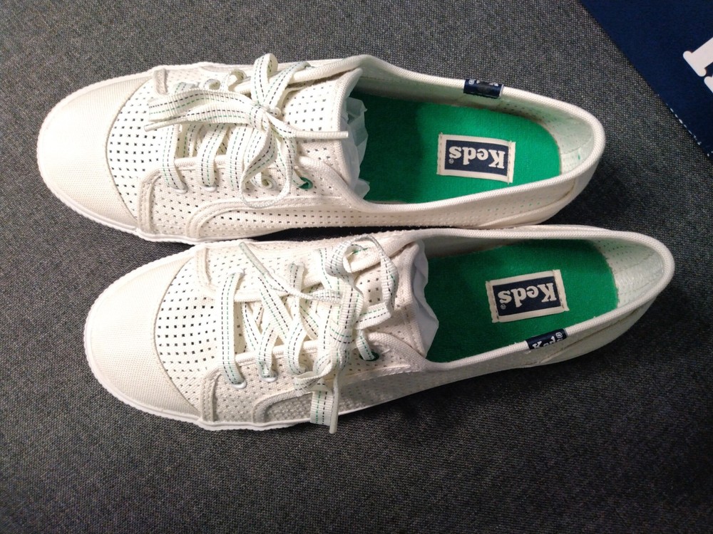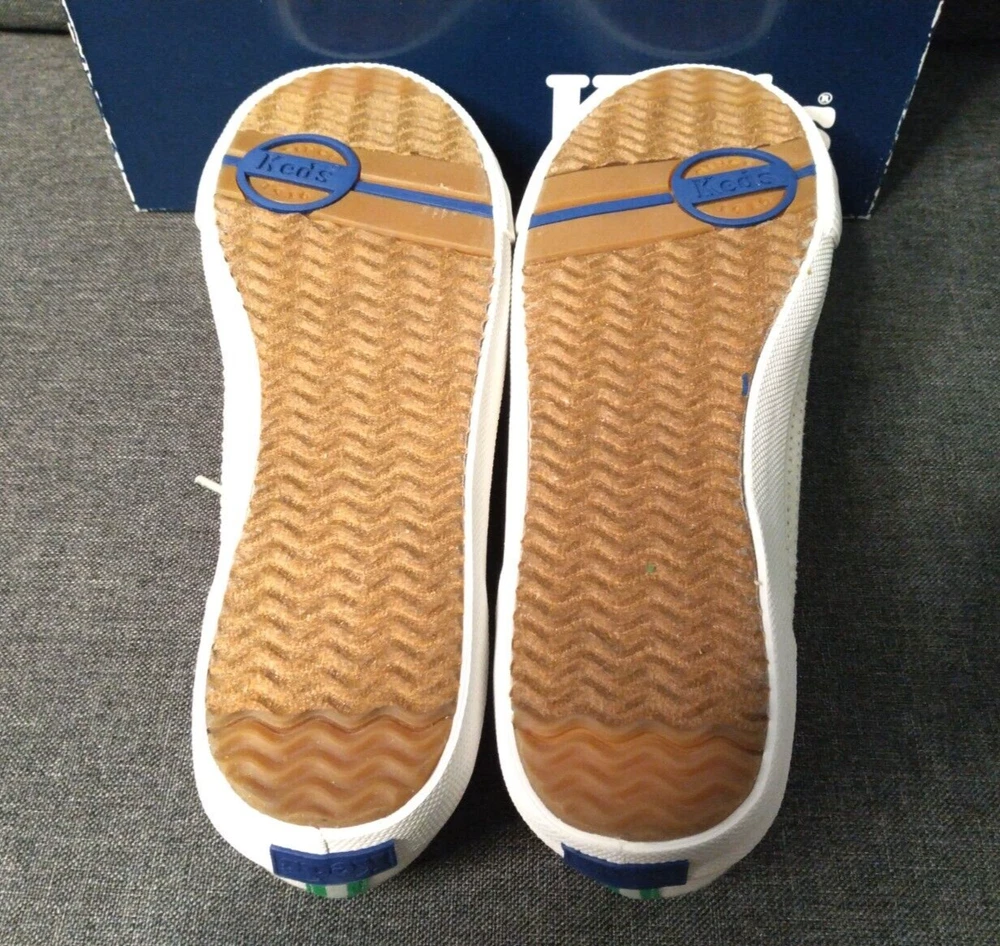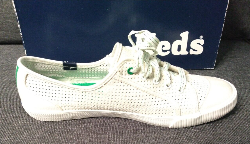 The product is a pair of Keds Celeb Perforated sneakers for women in size 8, featuring an off-white ivory color and lace-up closure. The shoes are made of canvas fabric and are designed with a casual athletic style. They are new in the box and are suitable for everyday wear. The box has a lot of scuffs. The box has scuffs and scrapes, but the shoes are in new condition.
