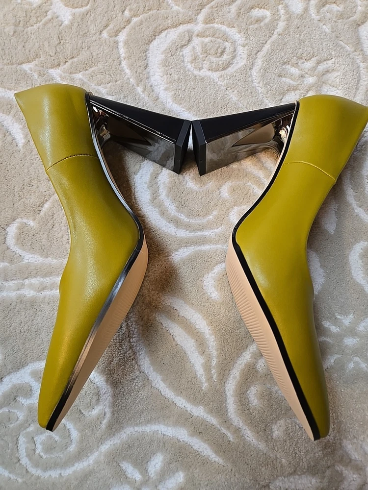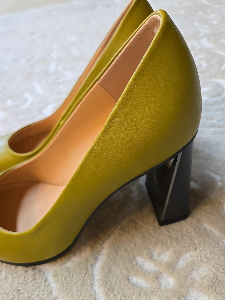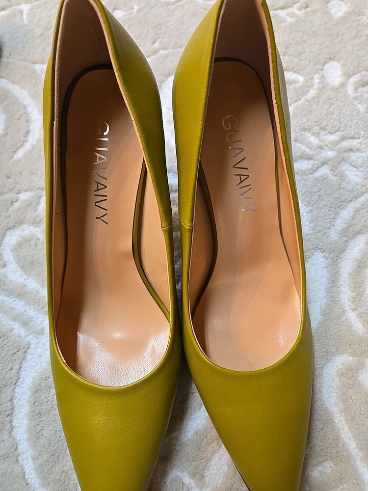 Add a touch of sophistication to your outfit with these stylish Guavaivy pointed toe heels. The olive green color and slip-on closure make them perfect for both business and party occasions. The high block heel is both comfortable and chic, with a rubber outsole for added support. These size 9.5 pumps are made of synthetic upper material and have a standard shoe width. They are suitable for all seasons, including winter, summer, fall, and spring. Don't miss out on this timeless addition to your shoe collection! New Without Box 3.75" heel Please see photos for measurements and details :)