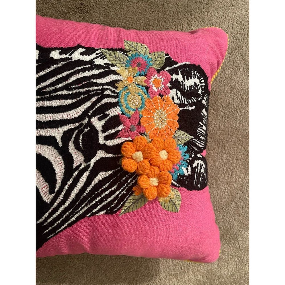 Transform your living room into a vibrant oasis with this artistic pillow. Featuring a playful zebra adorned with a floral headband, this pink pillow adds a touch of whimsy and elegance to any space. Crafted from high-quality fabric with exquisite embroidered details, it’s perfect for adding a splash of color to your home decor. Whether you're hosting a casual gathering or simply relaxing with a book, this 16 x 16-inch square cover is a delightful addition. Spot clean only to maintain its charm. Condition: Brand new without tags. Keywords: pillow, zebra, floral, artistic, pink, embroidered, living room, home decor, square, high-quality fabric, whimsical, elegant, vibrant, new condition, spot clean. Type: Pillow Brand: Unbranded Theme: Animal, Floral Style: Artistic Color: Pink Pattern: Zebra with Floral Headband Material: High-quality fabric, Embroidered details Size: 16 x 16 in Shape: Square Features: Embroidered Room: Living Room Department: Home Care instructions: Spot Clean Only