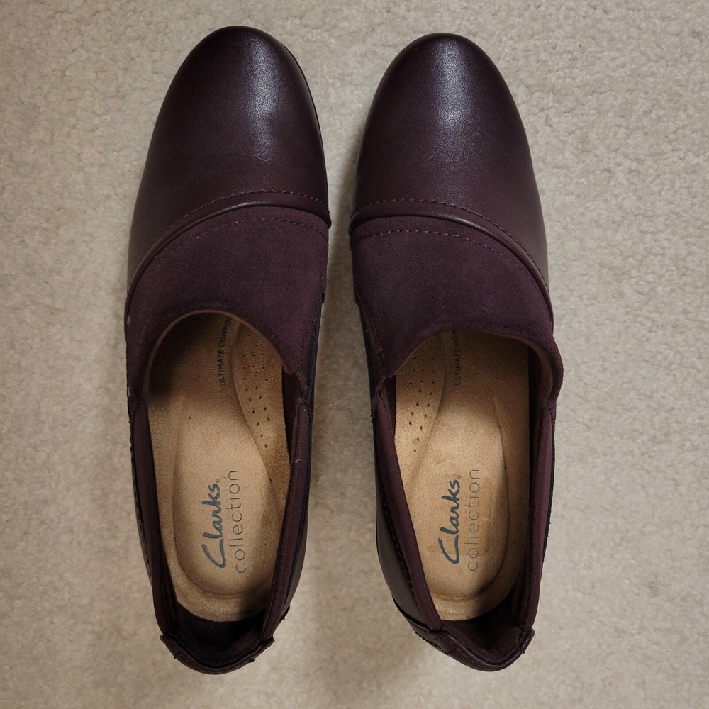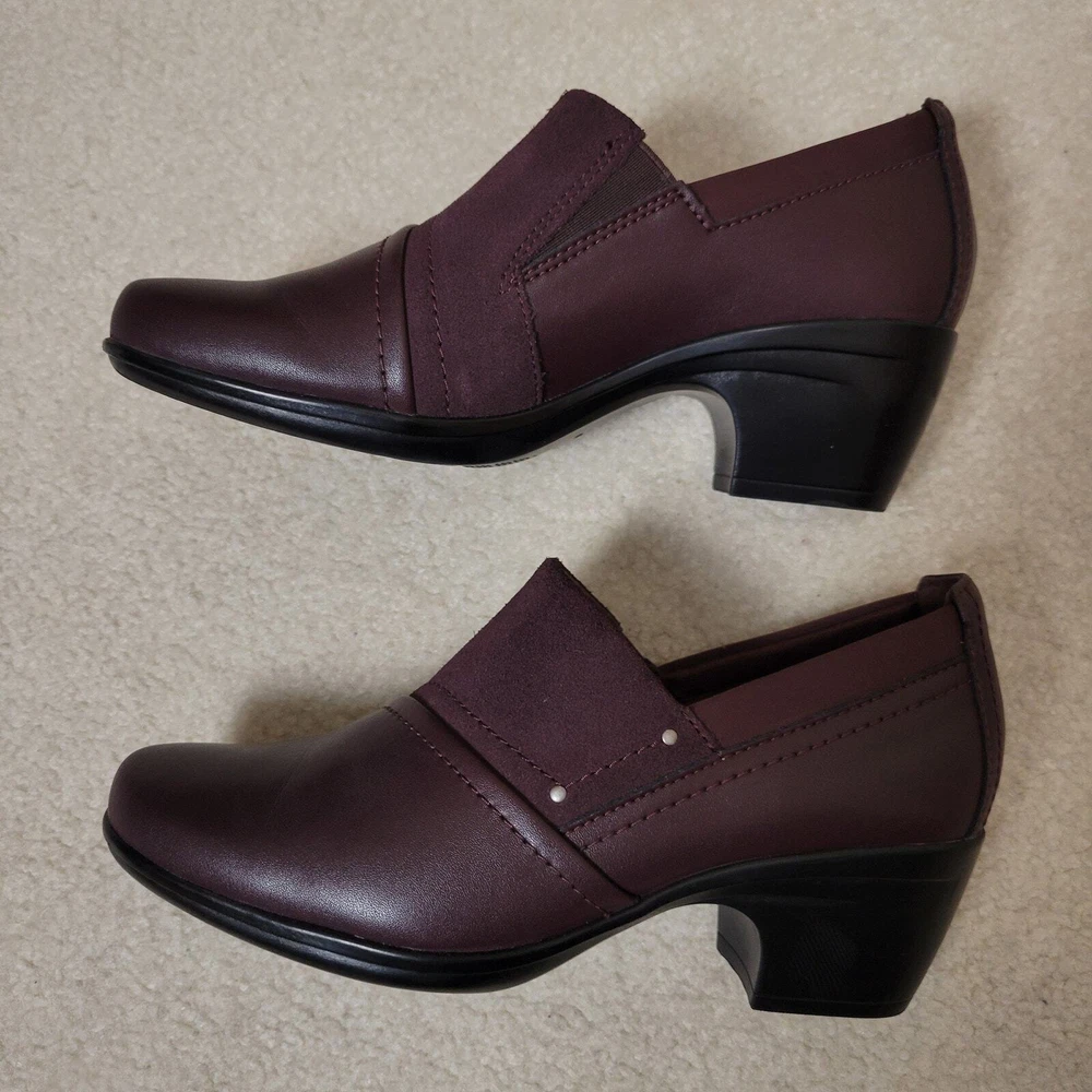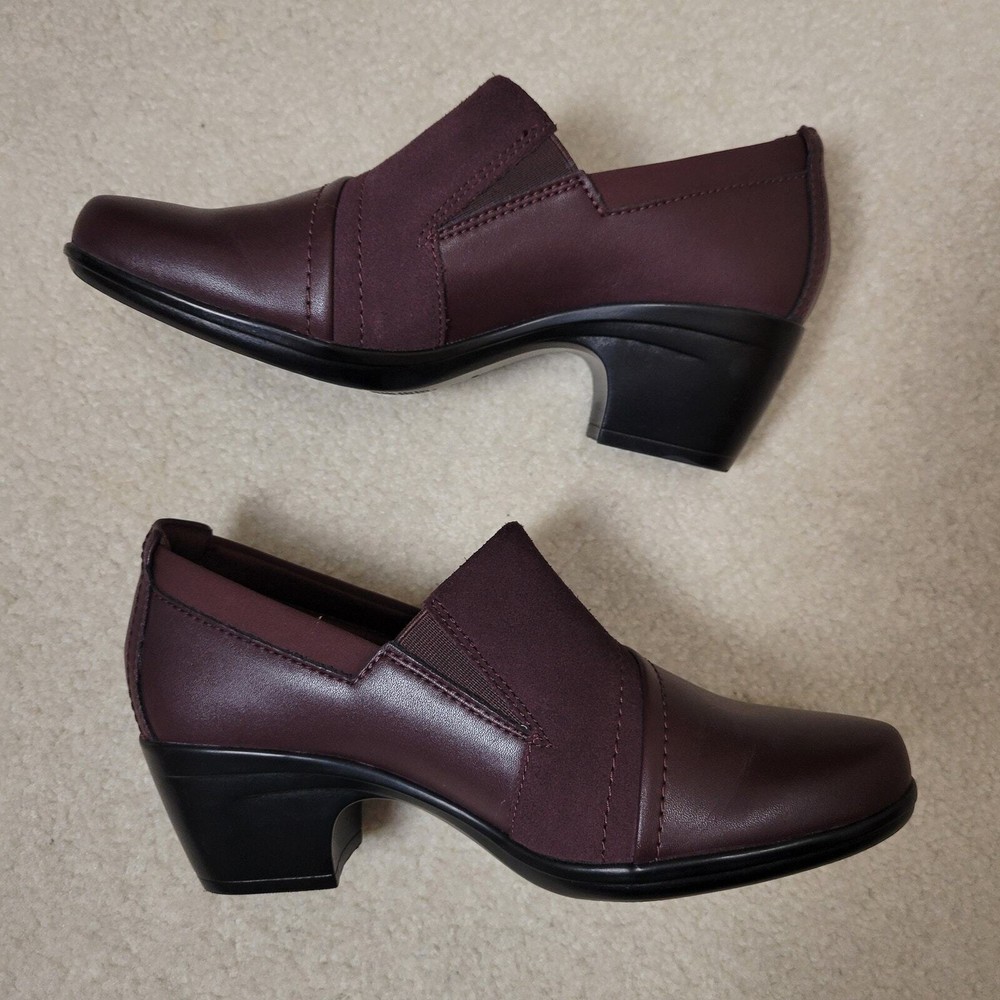 NWOT Clarks Emily Step Loafer Bootie Heels Size 6.5 Slip On Ultimate Comfort Leather Cushion Insole Synthetic Rubber Outsole Color-Dark Burgundy Heel Height-2" NEW WITHOUT TAG OR BOX Every Effort Has Been Made To Accurately Describe & Photograph This Item. Some Colors May Vary Depending On Lighting & Device Used To View. Please Reach Out If You Have Questions Prior To Purchase. I Am Happy To Help. Shipping From A Smoke & Pet Free Facility. USPS Ground Advantage