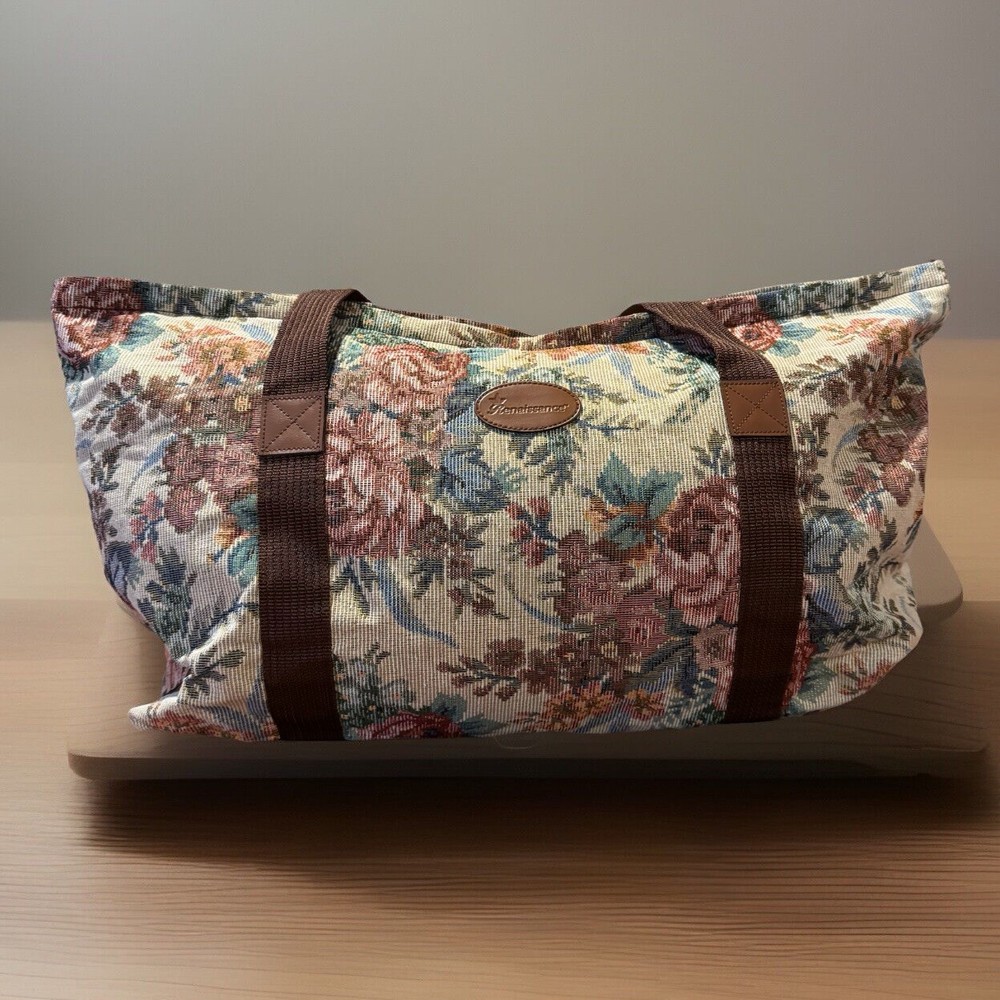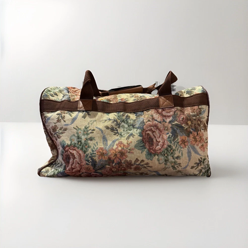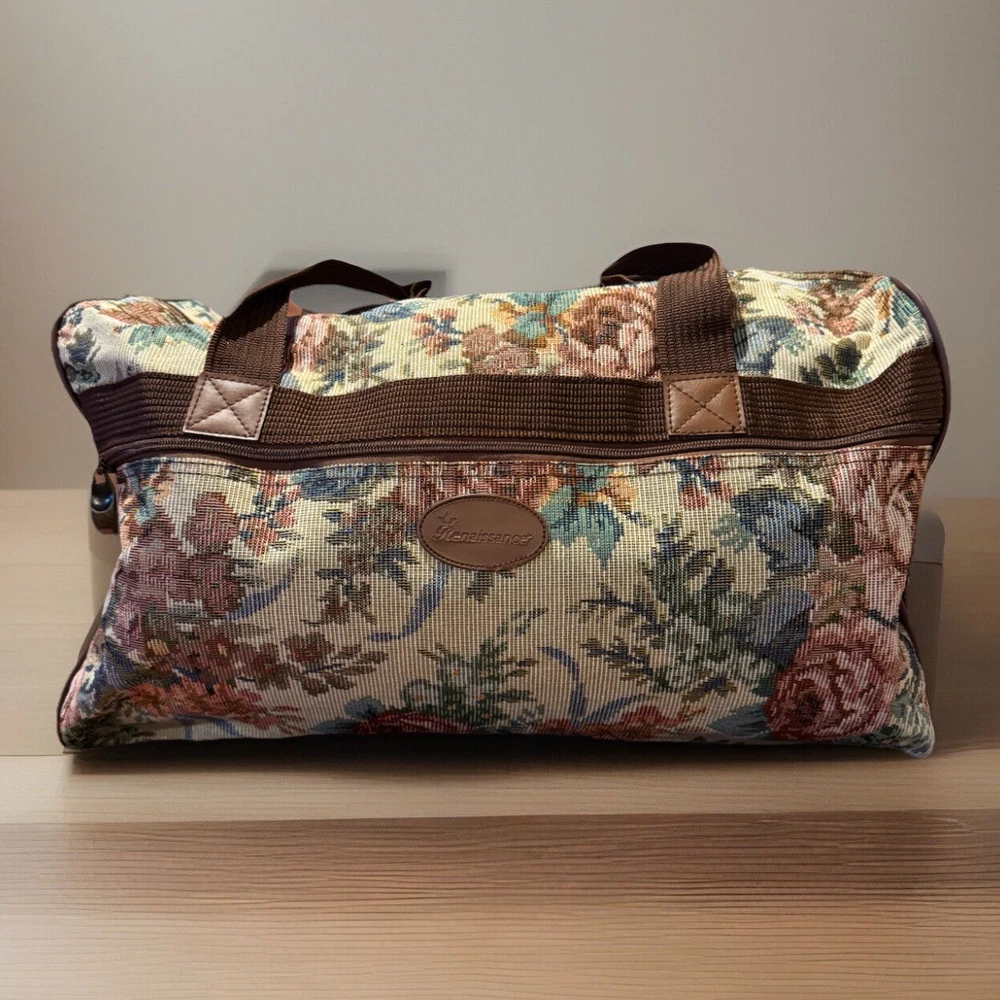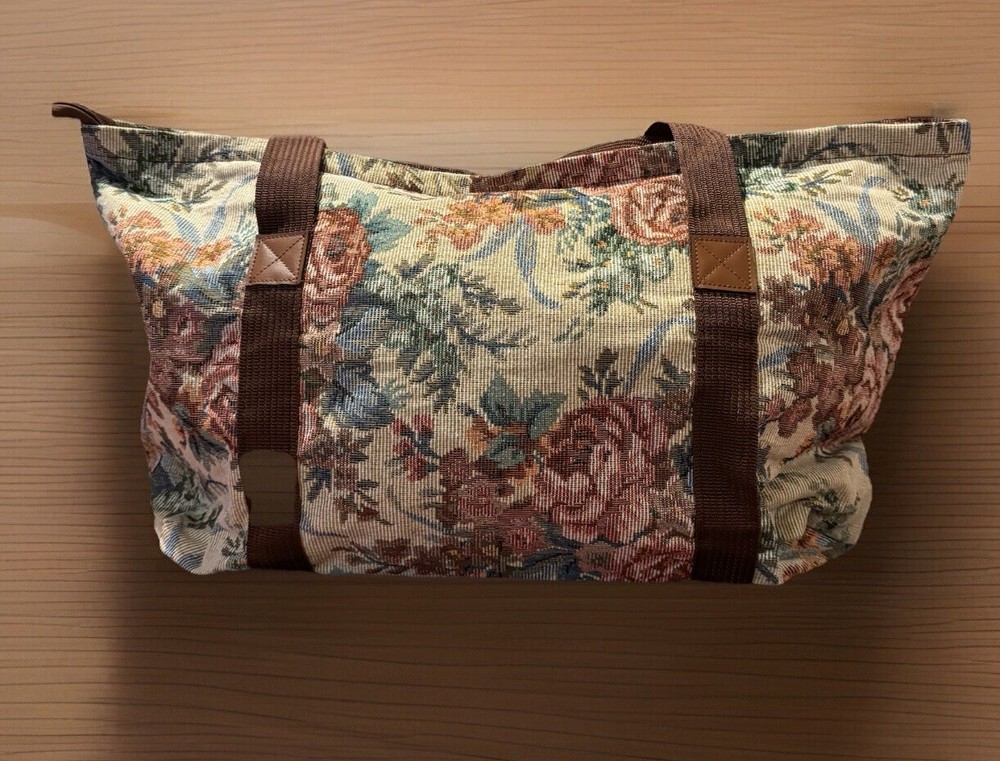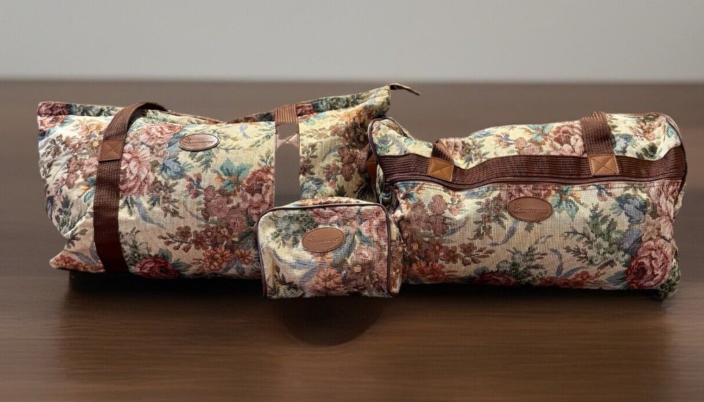 NWOT 3 Pc Set Floral Tapestry Large Duffel/Tote/Costmetic Bag 19x12”, 24x14,8x6” Never used. Lightweight, nylon double handles on Tote and Duffel. Duffle has cover on handles. Also has D ring to add a shoulder strap. Cotton interior. Duffel has exterior pocket/compartment. Cosmetic/small bag has wristlet handle. Waterproof interior. All bags have nylon zippers.