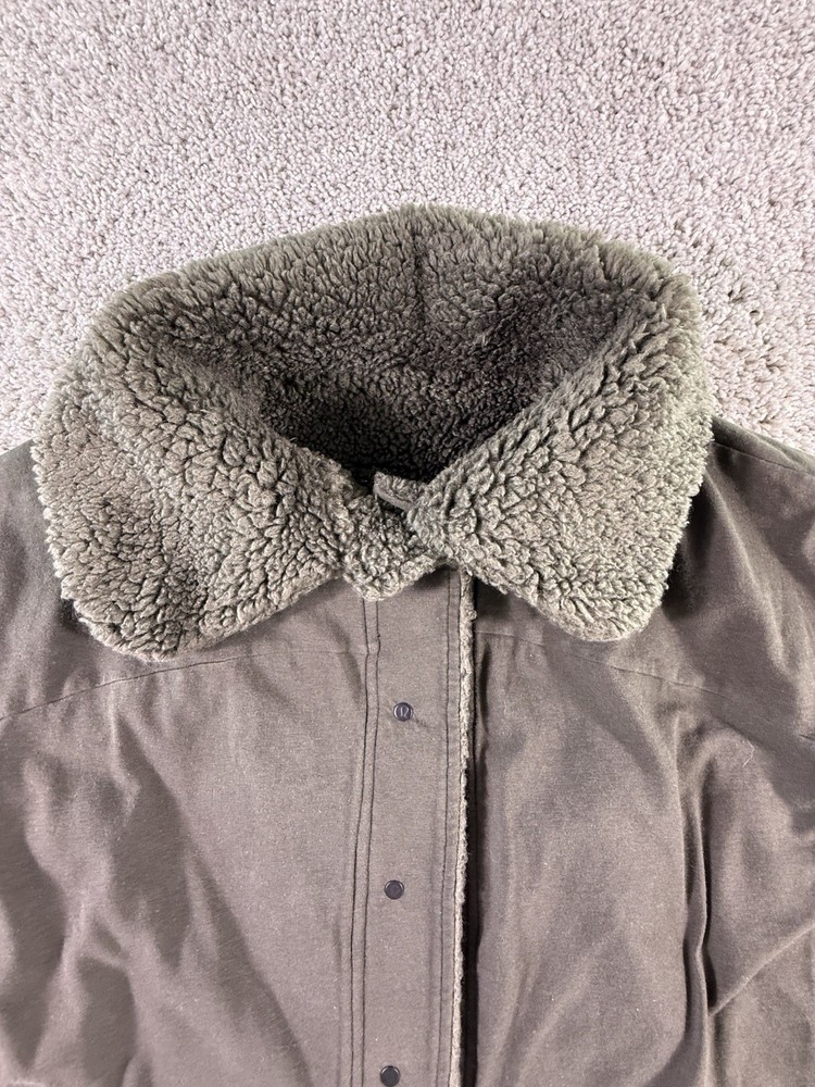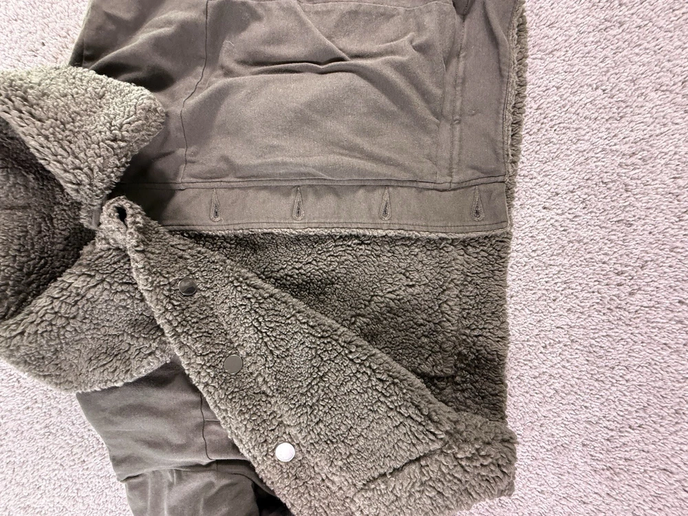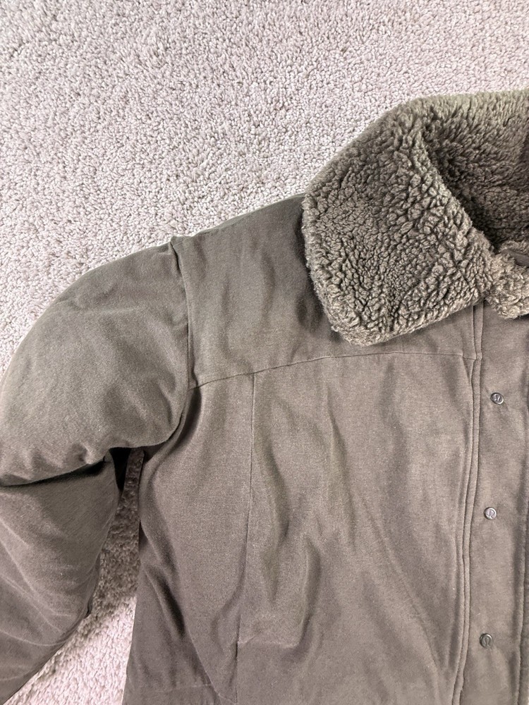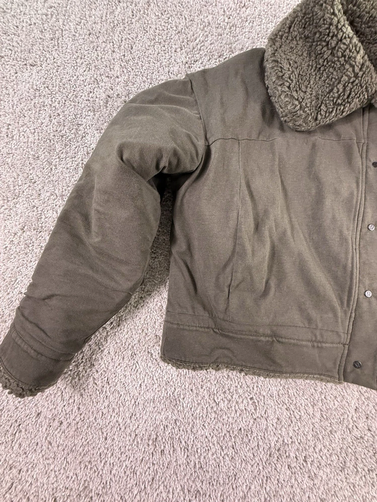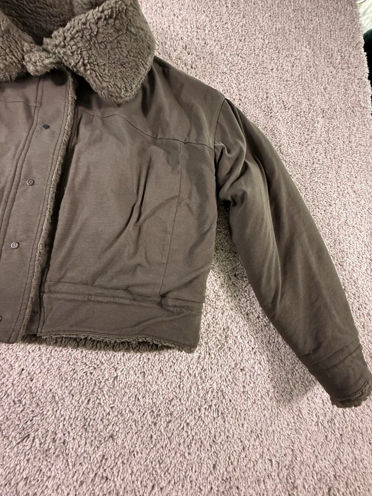 This NWOT Lululemon Cropped Reversible Sherpa Quilted Jacket in green, size 6, is a stylish and versatile activewear piece perfect for women on the go. Made from polyester with a fleece lining, this jacket features long sleeves, a button closure, and a regular fit for comfort. The reversible design adds a unique twist to the basic jacket style, making it a fashionable choice for outdoor activities. Easy to care for with machine washable instructions, this jacket is a practical and high-quality addition to any wardrobe. 5469