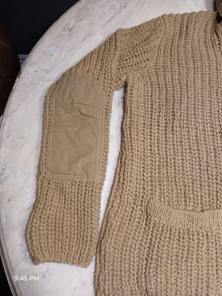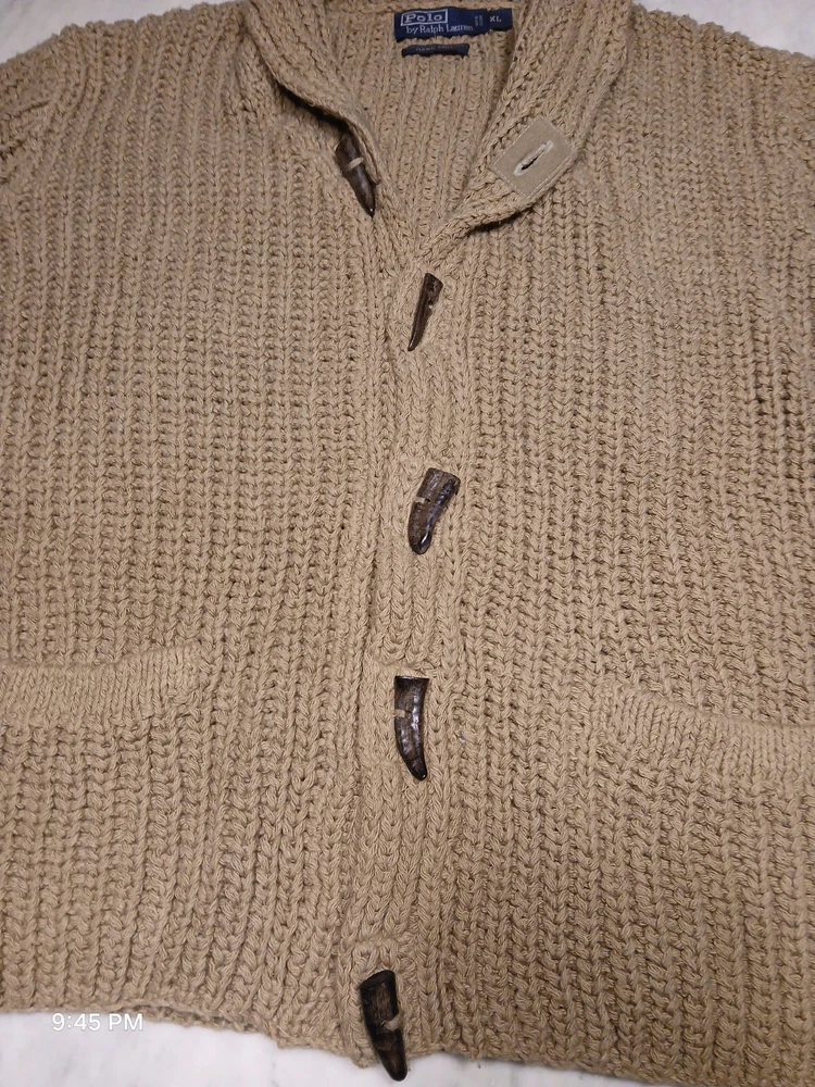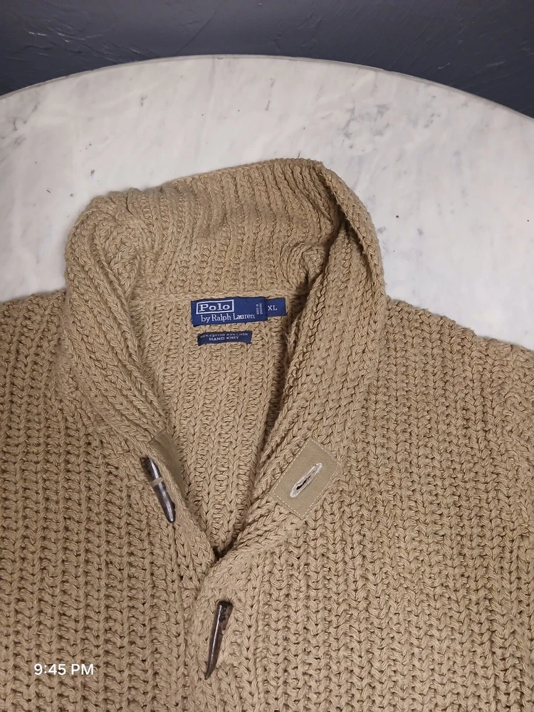 This is a vintage Polo Ralph Lauren cardigan sweater for men in size XL. It features a shawl collar, a solid beige color, and is hand knitted with a tight-knit pattern. Made of a blend of linen and cotton, this heavyweight sweater has long sleeves and button accents. Suitable for various occasions such as travel, weddings, parties, casual wear, work, or formal events. The style is described as athletic fit with a classic, preppy theme, perfect for winter, fall, and spring seasons.
