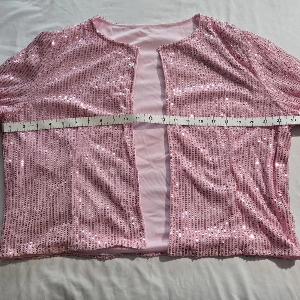 Elevate your style with this dazzling pink sequined cardigan jacket! Perfect for a night out or a festive occasion, it features an open front design adorned with shimmering sequins, offering a chic and glamorous look. The long sleeves provide added elegance, while the lightweight fabric ensures comfort. This statement piece is ideal for layering over a simple top or dress to add a touch of sparkle. Stand out in any crowd with this eye-catching jacket! - Open front design for easy wear - Long sleeves and relaxed fit - Perfect for parties or special events - Lightweight and comfortable - Adds a glamorous touch to any outfit