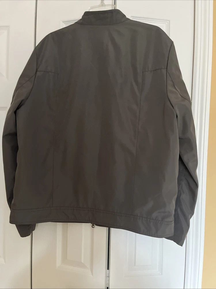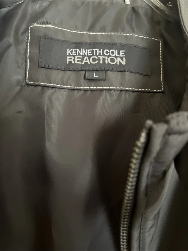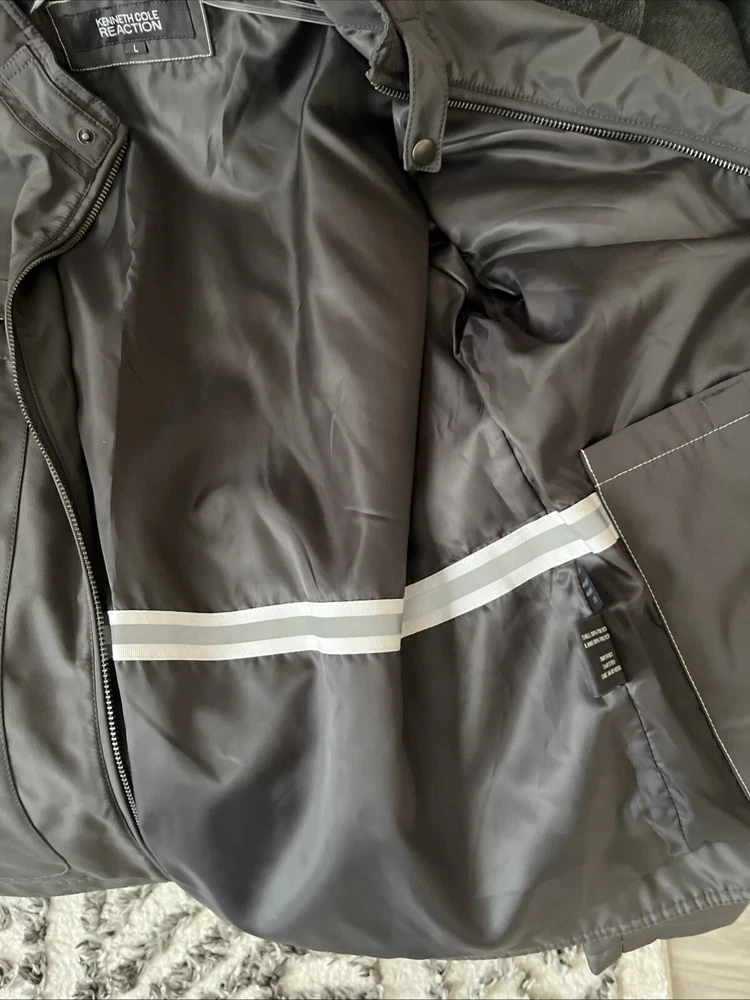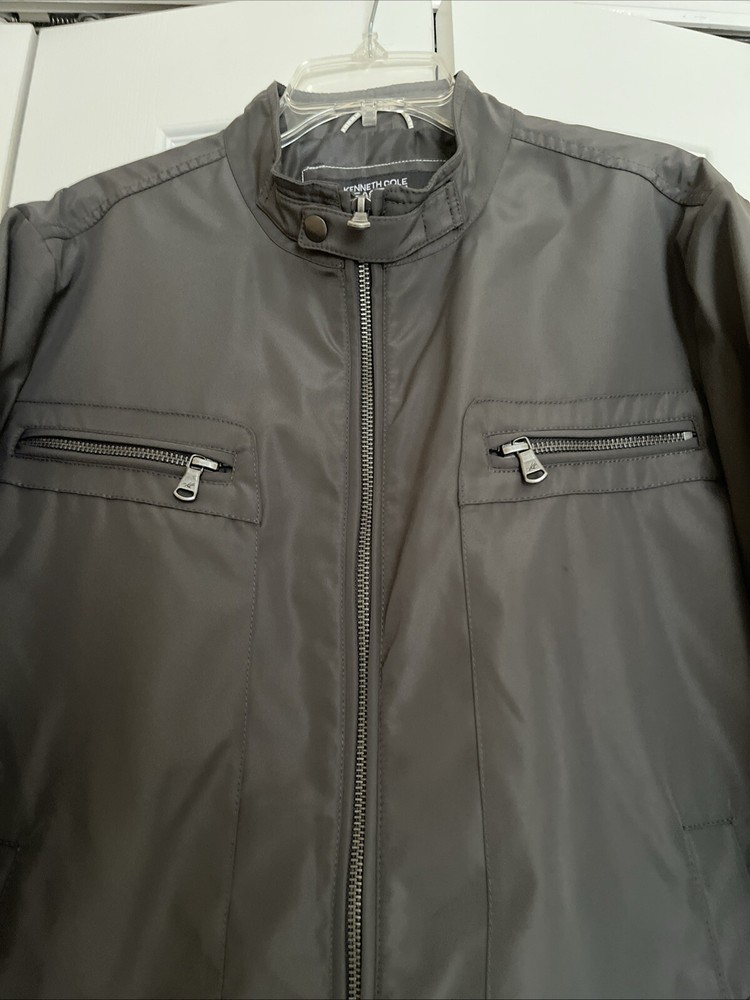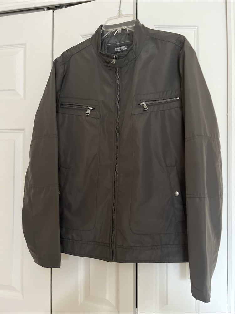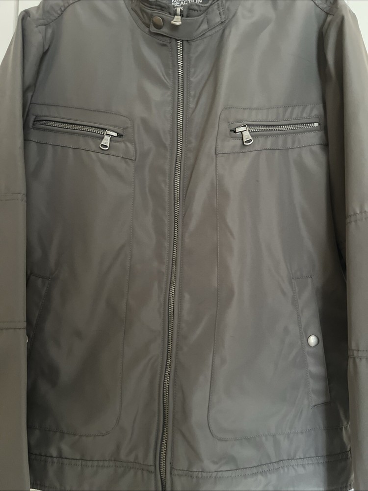 Stay warm and stylish with this Kenneth Cole Reaction windbreaker jacket. The gray jacket features a stand-up collar, full zip closure, and softshell fabric type. It has a mid-length coat with a chest size of 44 inches armpit to armpit across-22", back length-27" and is available in size L. The jacket is perfect for travel and casual occasions and is machine washable for easy care. The jacket has four pockets outside and two inside pockets, with a regular fit and size type. The lining material is made of polyester, and the insulation material is also polyester. The jacket is suitable for winter, fall, and spring seasons and is accented with a zipper. This jacket is a great addition to any wardrobe. PLEASE SEE THE PICTURES!