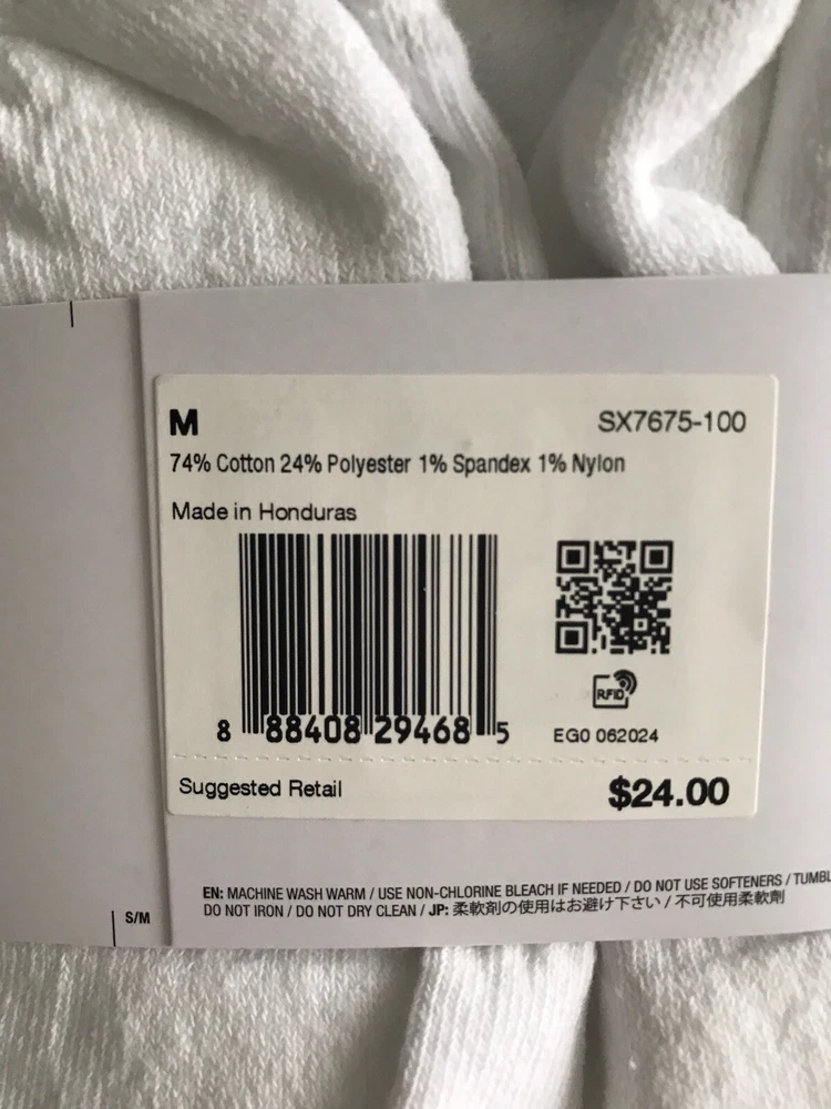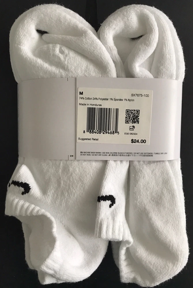 MPN: SX7675-100 Character: n/a Department: Women Opacity: Opaque Pattern: Solid Brand: Nike Number in Pack: 6 Pairs Theme: Logo, Sports Season: All Seasons, Fall, Spring, Summer, Winter Style: No-Show Socks Material: Cotton, Cotton Blend, Polyester, 74% Cotton, 24% Polyester, 1% Spandex, 1% Nylon Handmade: No Type: Socks Country/Region of Manufacture: Honduras Features: Breathable, Cushioned, Lightweight Sock Length: No-Show Performance/Activity: Basketball, Bodybuilding, CrossFit, Cross Training, Cycling, Golf, Gym & Training, Hiking, Hunting, Running & Jogging, Skateboarding, Soccer, Tennis, Volleyball, Walking, Weightlifting, Yoga gtin13: 888408294685 Garment Care: Machine Washable Occasion: Activewear, Casual, Everyday, Travel Character Family: N/A Toe Style: Full Toe Color: White Personalize: No Size: M UPC: 888408294685