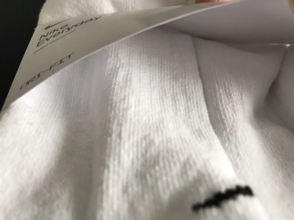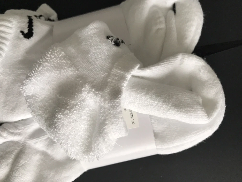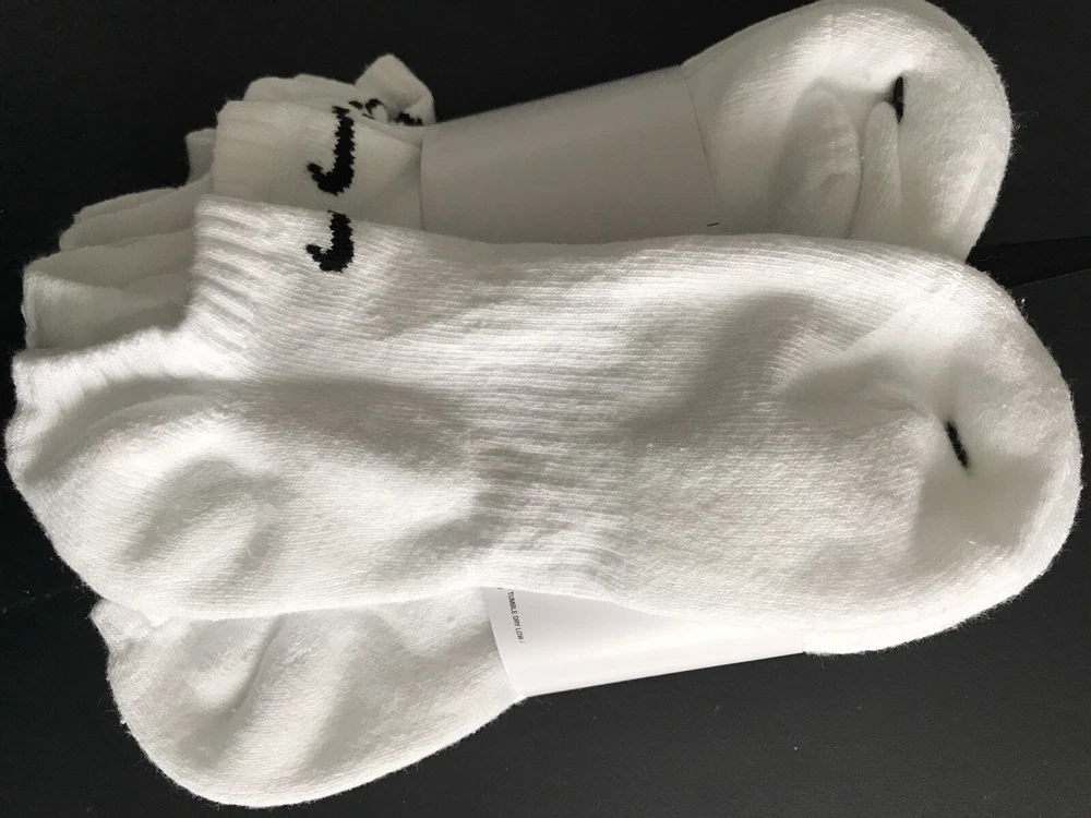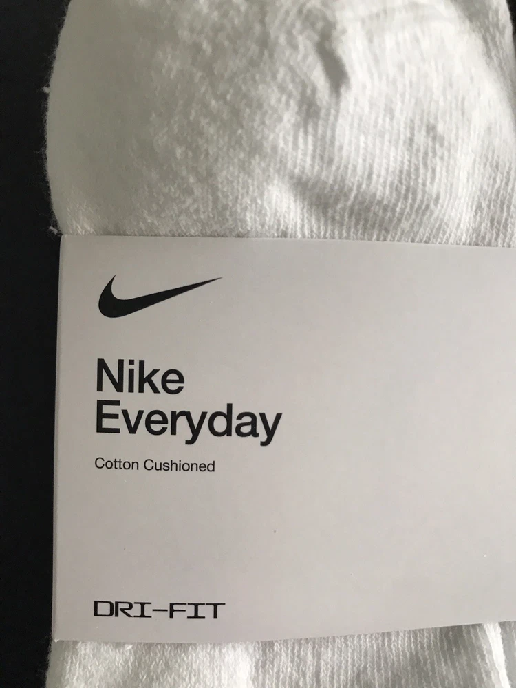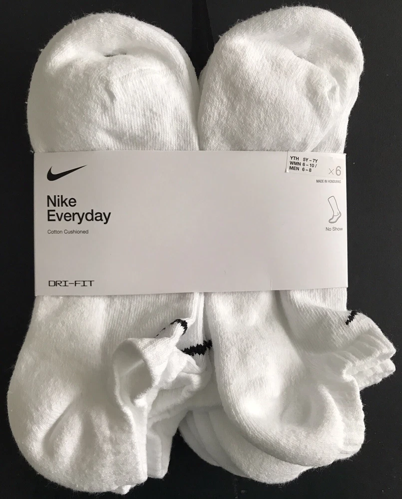 NWT Nike Everyday Cushioned Dri-Fit No Show Socks 6 Pairs White with Black Nike Swoosh Logo Style#SX7675-100 Men's Shoe Size US 6-8, Women's Shoe Size US 6-10, Youth Shoe Size US 5y - 7y Dri-Fit No Show 74% cotton, 24% polyester, 1% spandex, 1% nylon