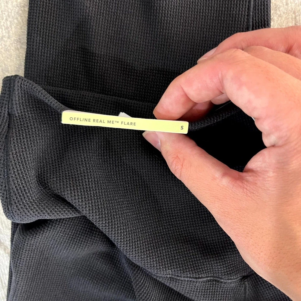Upgrade your athleisure collection with these brand new with tags (NWT) OFFLINE by Aerie Real Me Flare Leggings. These leggings feature a stylish waffle texture and a hi-rise waistband for a secure and flattering fit. The flare leg design adds a retro-inspired touch, perfect for making a fashion statement during workouts or casual outings. Key Features: Brand new with tags (NWT) Hi-rise waistband for support and a flattering fit Flare leg design for a trendy, retro look Waffle texture for added style Real Me fabric for a second-skin feel Size Small Classic black color These leggings are ideal for yoga, gym sessions, or everyday wear, offering flexibility and comfort. Pair them with a sports bra or an oversized hoodie for a complete athleisure look. Don’t miss out on these essential leggings from OFFLINE by Aerie. Grab them now and experience the perfect blend of fashion and function! Materials: 89% Nylon, 11% Elastane Retail Price : $65