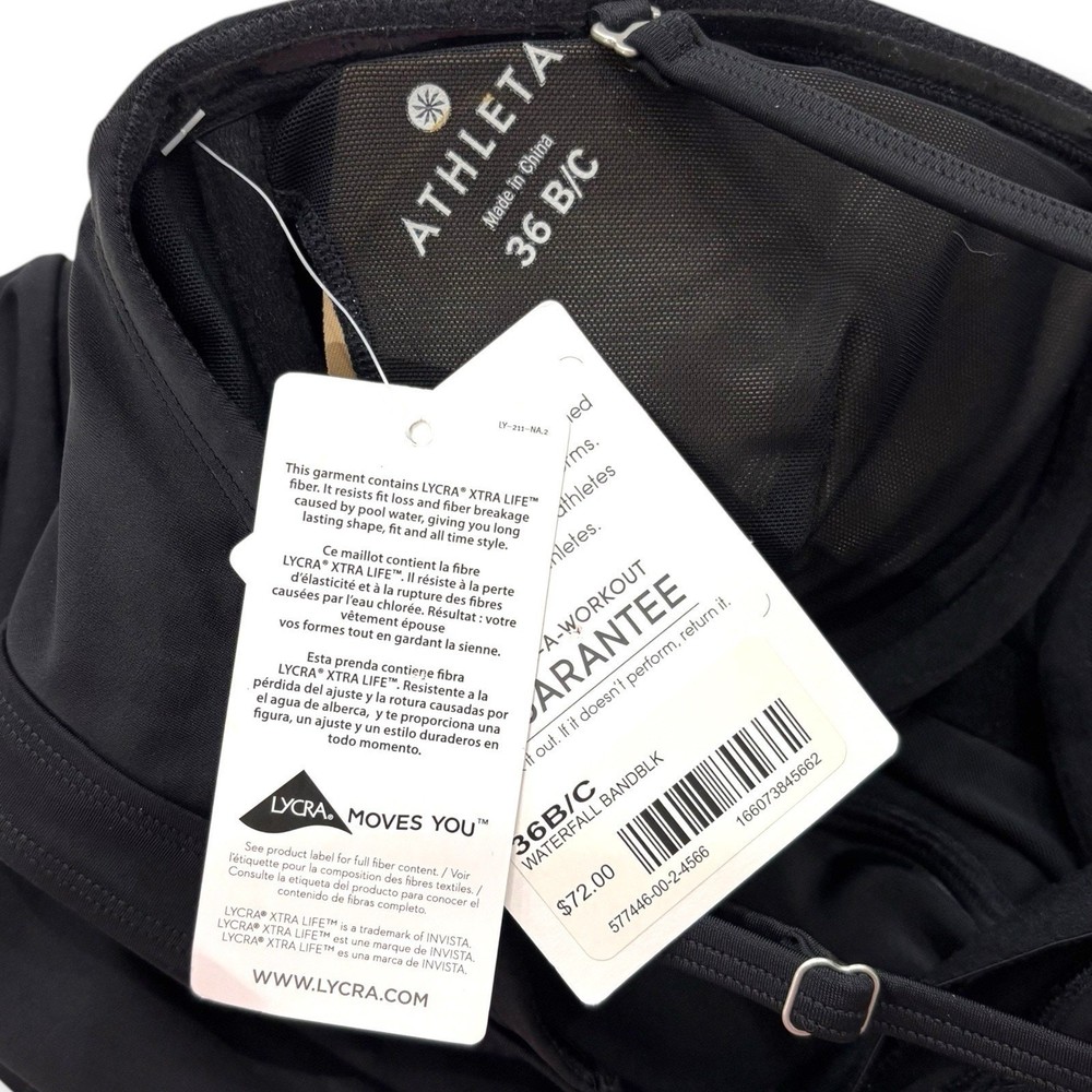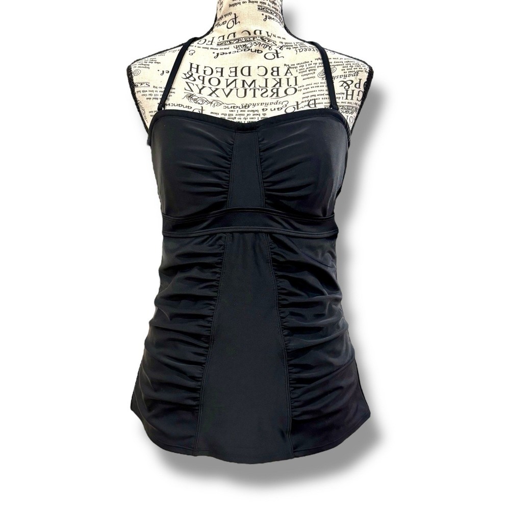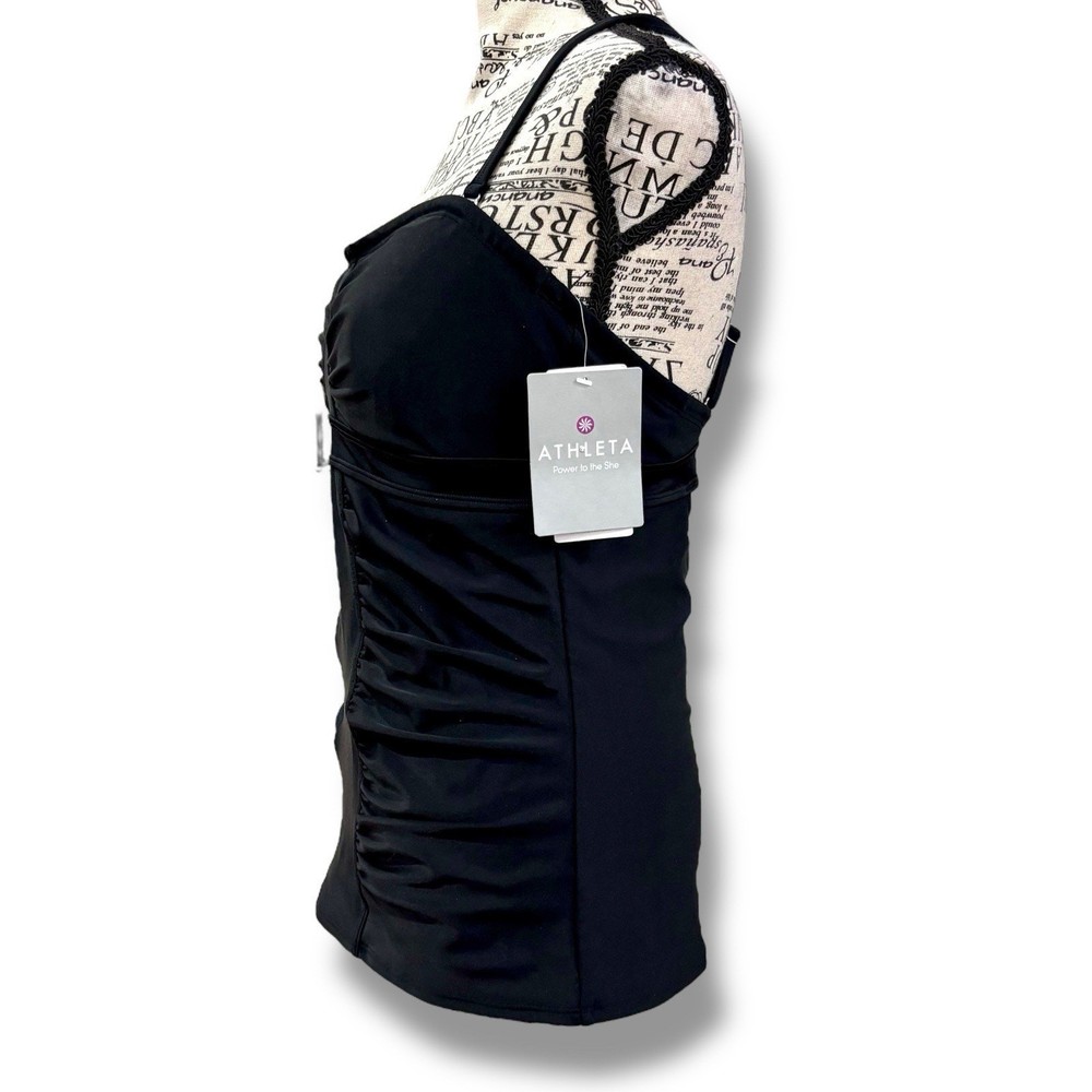 Elevate your beach day style with this Athleta tankini swim top. The black solid color and waterfall bandeau style offer a sleek and trendy look, perfect for a day at the pool or a trip to the beach. This swim top features adjustable straps, removable pads, and a built-in bra for added support and comfort. Crafted for women who desire both style and function, this Athleta swim top is a must-have addition to your swimwear collection.