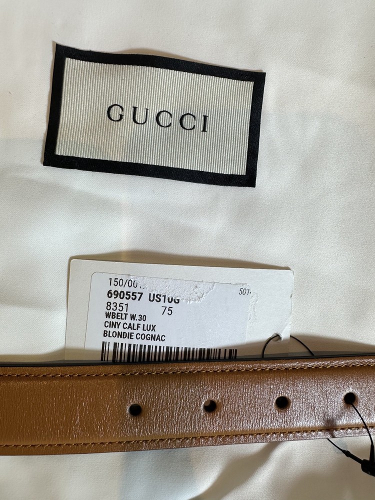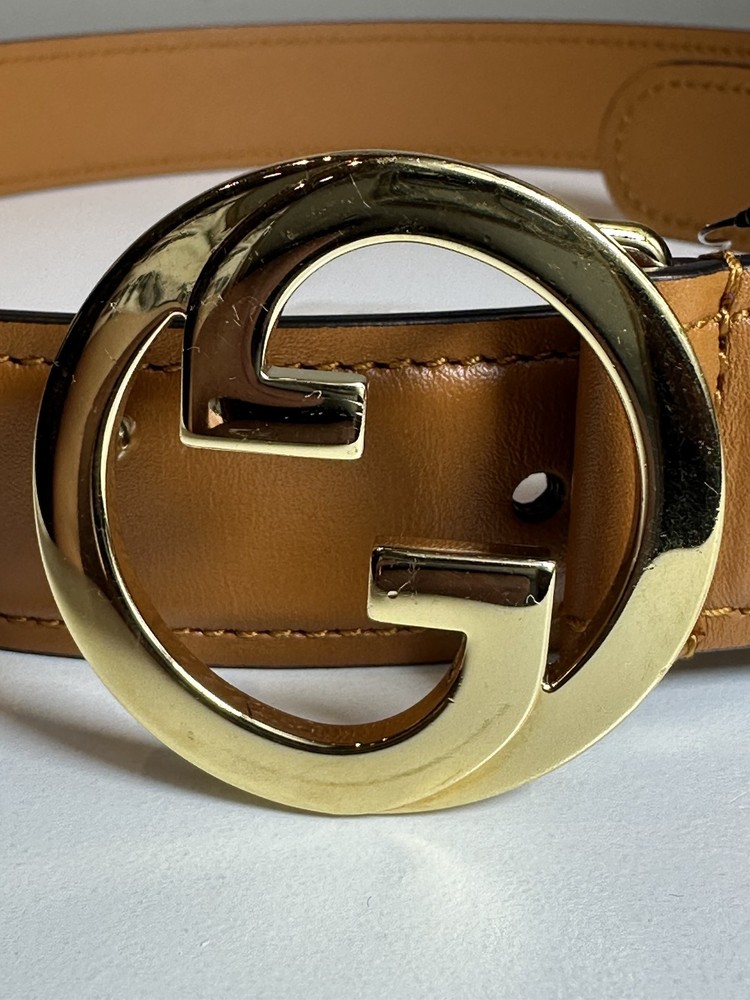 New with tags Authentic Gucci Brown Leather Belt with Interlocking GG Buckle *small scratches on the buckle: please see the second photo for details* Size: 75 cm / 30 inch Width: 1.2 inches Color: Brown Material: Smooth calfskin leather Buckle: Gold-tone interlocking GG Made in Italy Condition: Authentic, new with tags Includes: dustbag