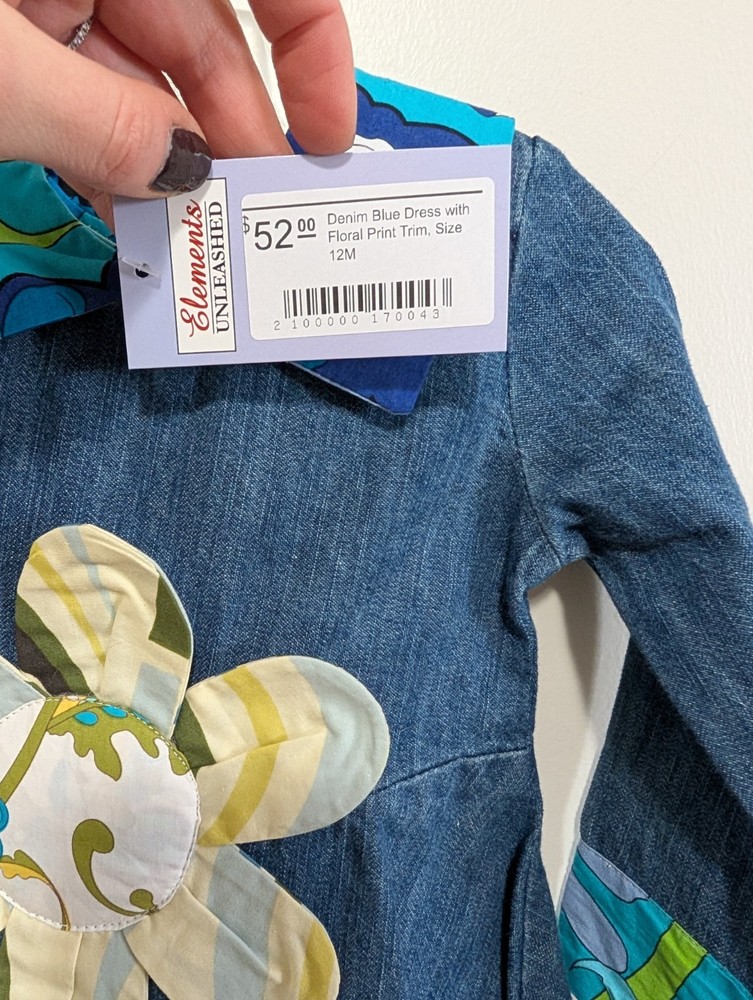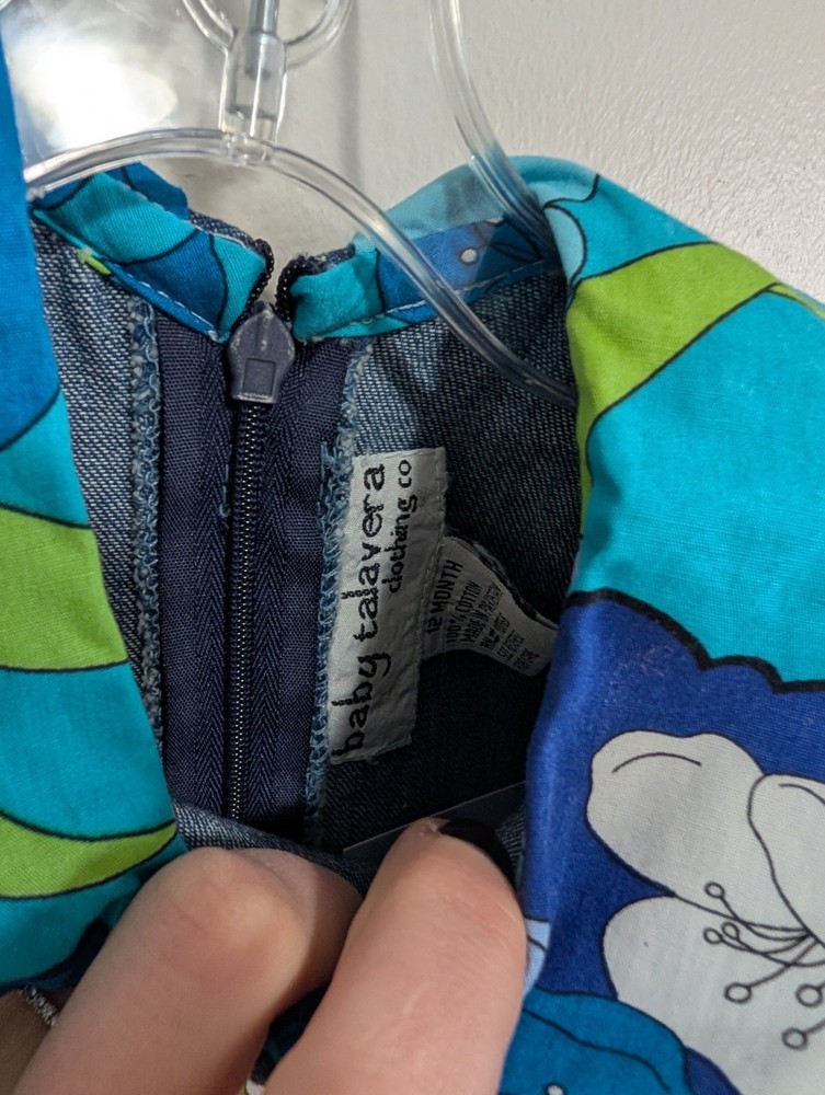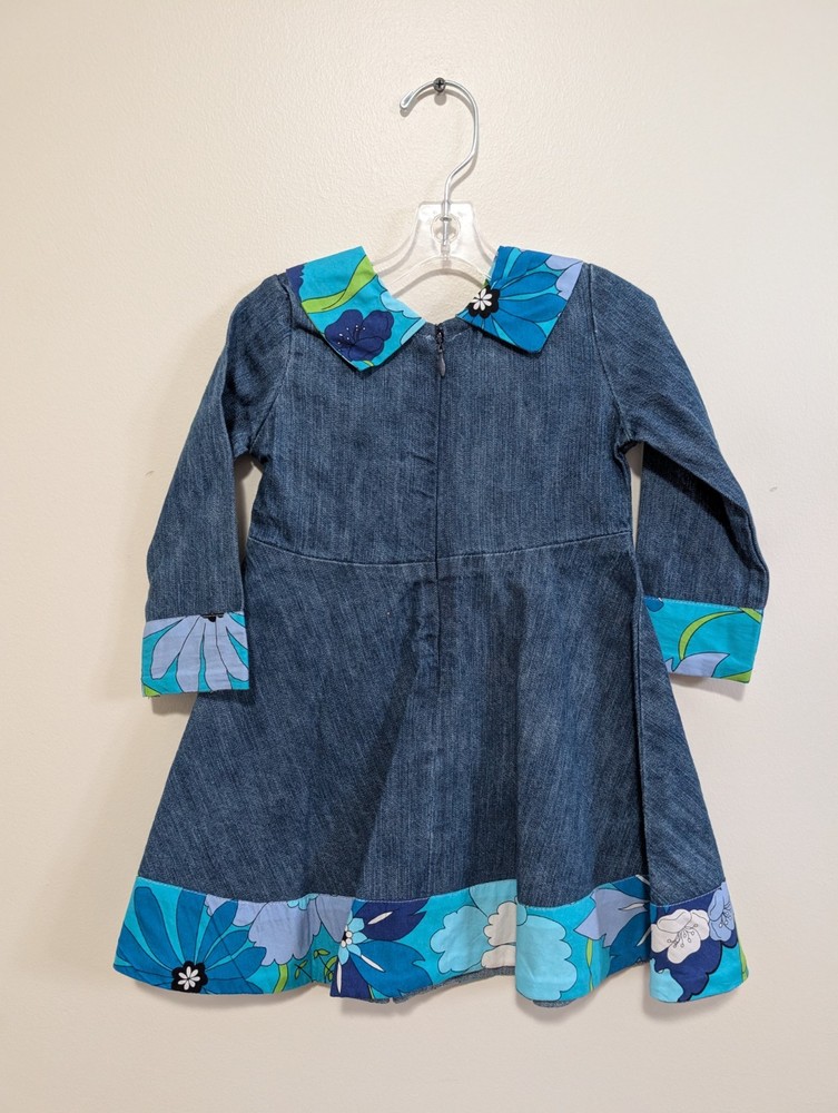This NWT baby girl denim dress features pieced floral fabric details, making it perfect for a party or casual occasion. The dress has long sleeves, a knee-length hem, and is machine washable for easy care. The cute A-Line style and blue color make it suitable for the seasons of summer, fall, and spring, adding a touch of flowers to your little one's wardrobe. Made by Baby Talavera, this stylish dress is sure to stand out.