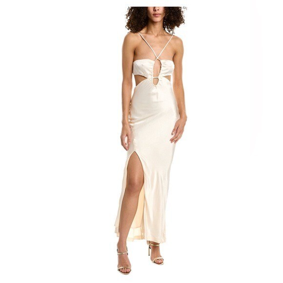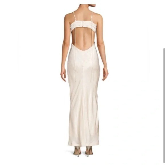 NWT Bardot Revolve Daring Satin Maxi Dress Ivory SZ 10 US β¨π₯π₯π₯ V-neck β’ Sleeveless β’ Back zipper closure β’ Spaghetti shoulder straps β’ Front keyhole cutout β’ Front slit β’ Open back β’ Lined β’ Viscose β’ Hand wash SIZE & FIT β’ About 58" from shoulder to hem