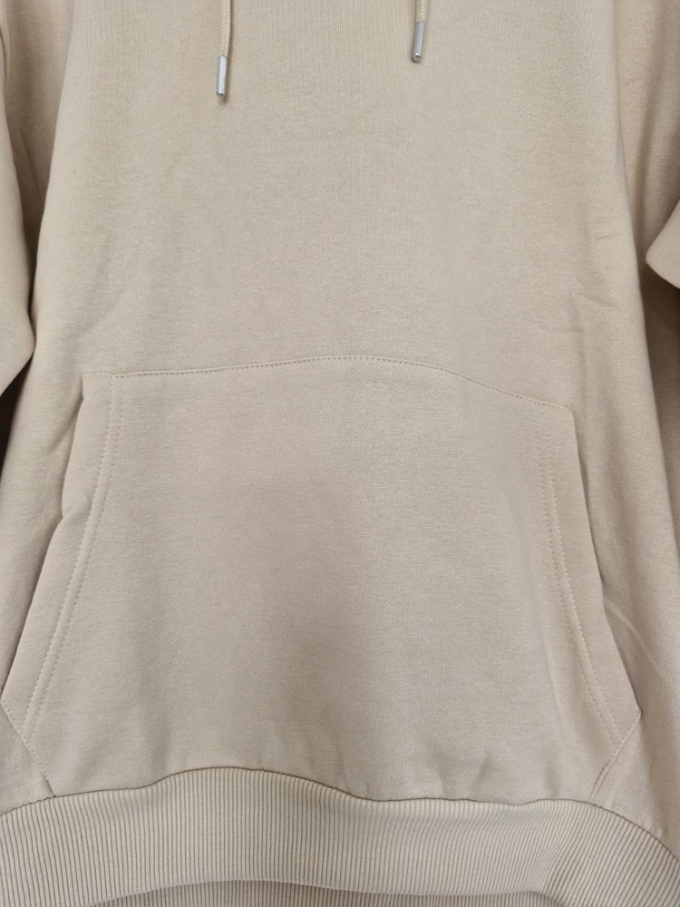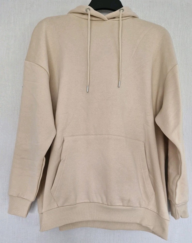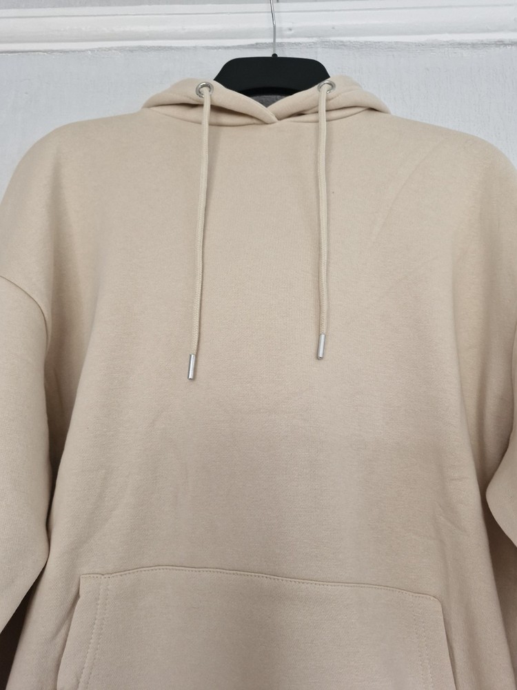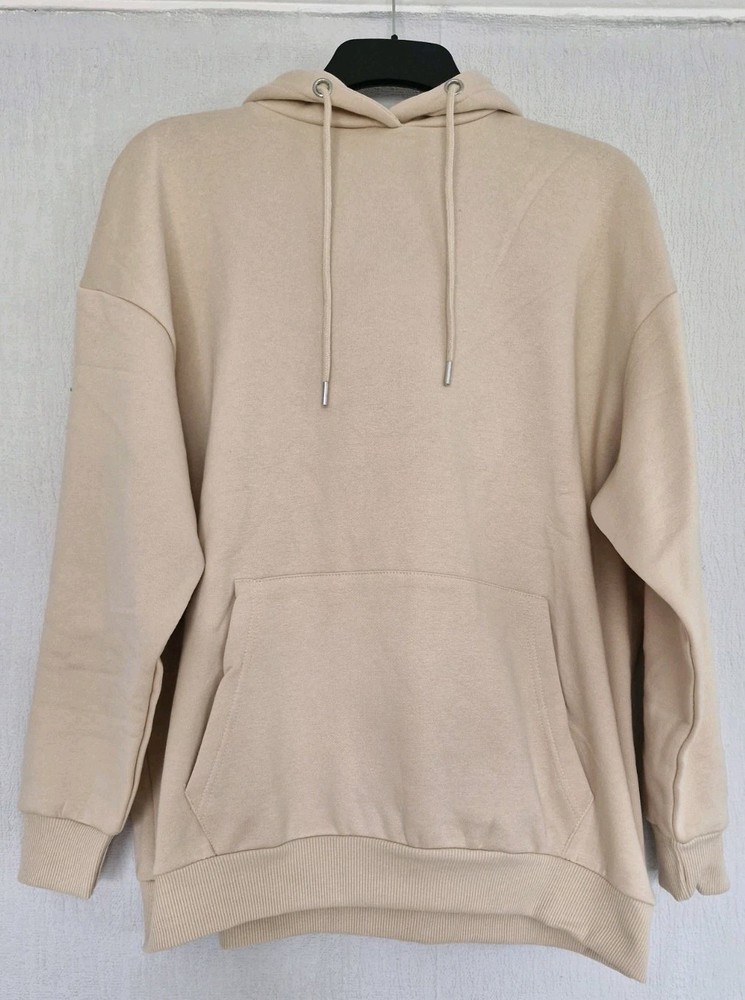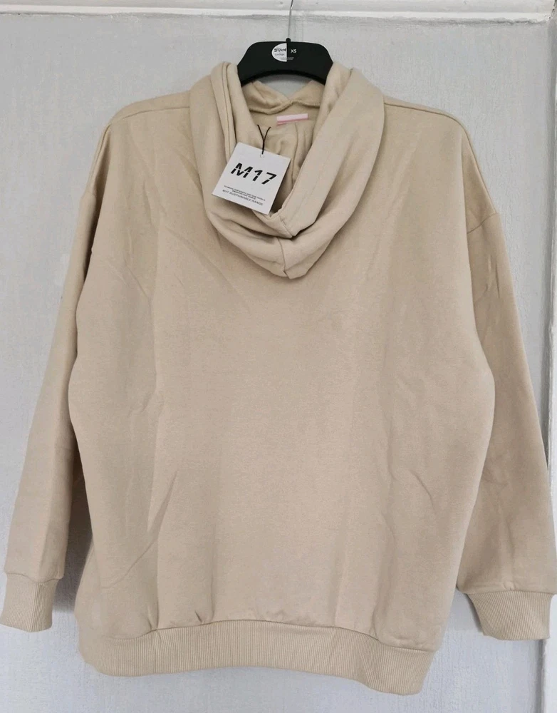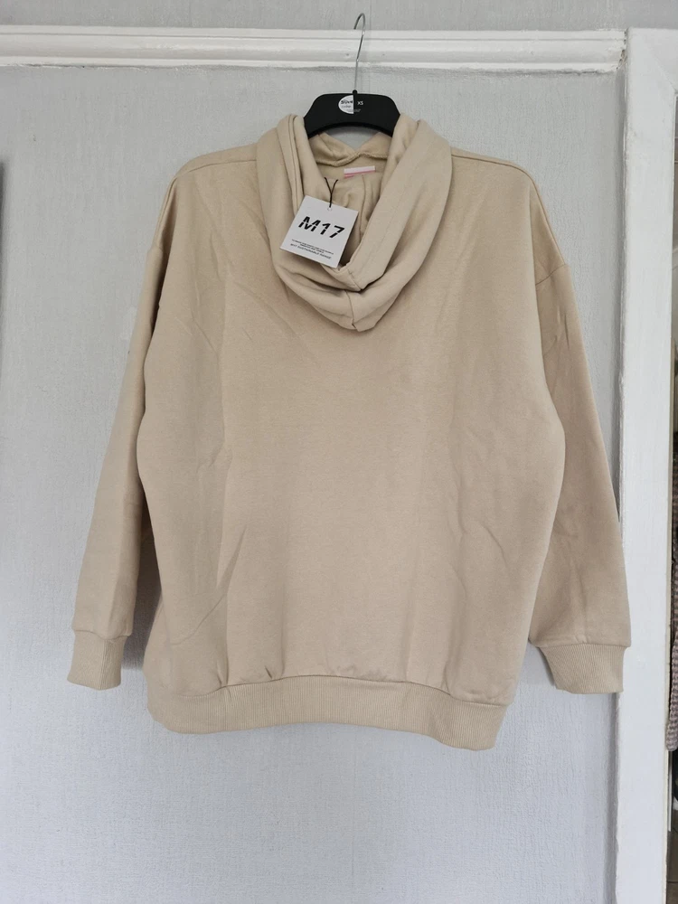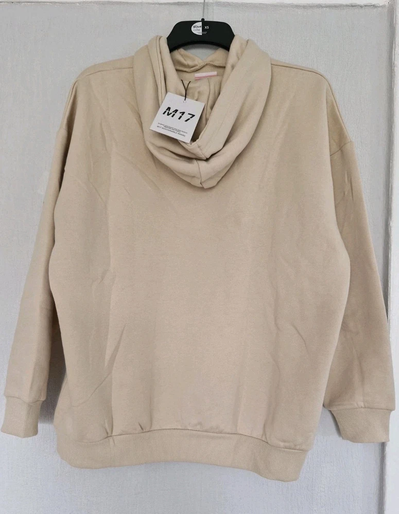 This is a new beige oversized pullover hoodie in size small from the brand M17. It features a high neck with an asymmetrical sleeve design and a fleece lining for added warmth. The hoodie is made of a cotton blend fabric, making it suitable for winter, autumn, and summer seasons. With a chest size of 56 inches and a pocket accent, this pullover is ideal for activewear or casual occasions, providing both comfort and style for women looking for a relaxed fit. Length is 28" chest laid flat measures 56" as it is oversized