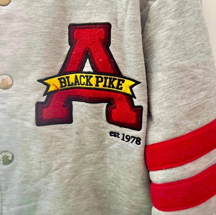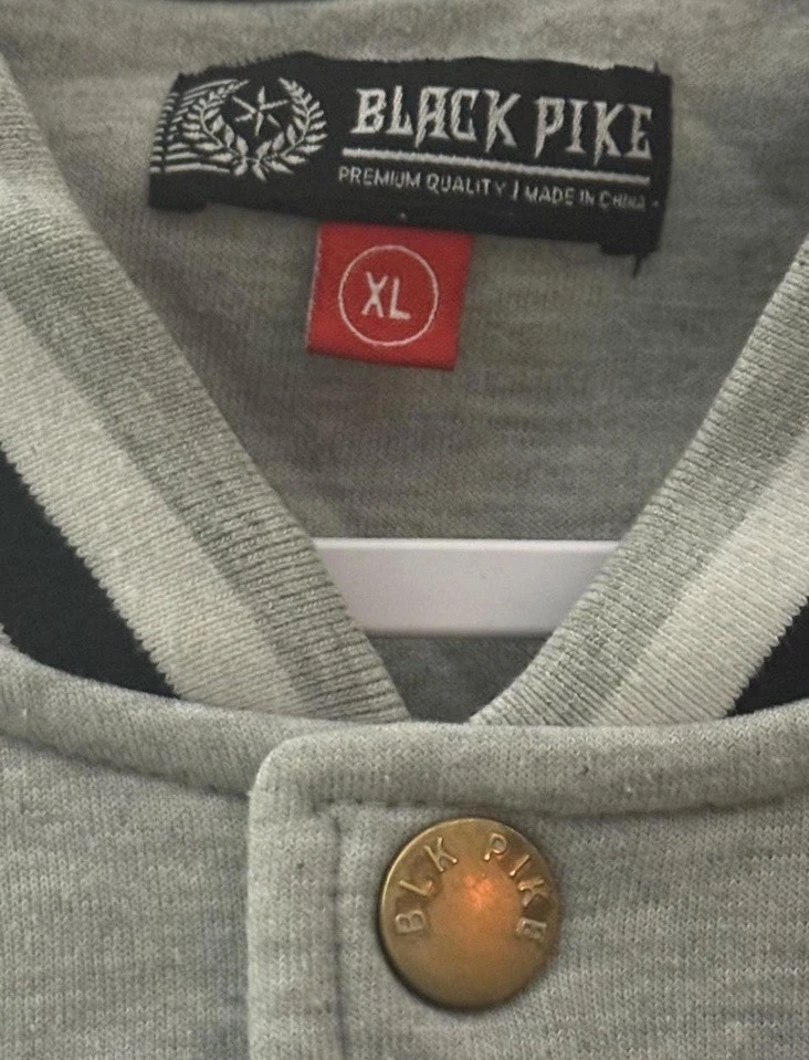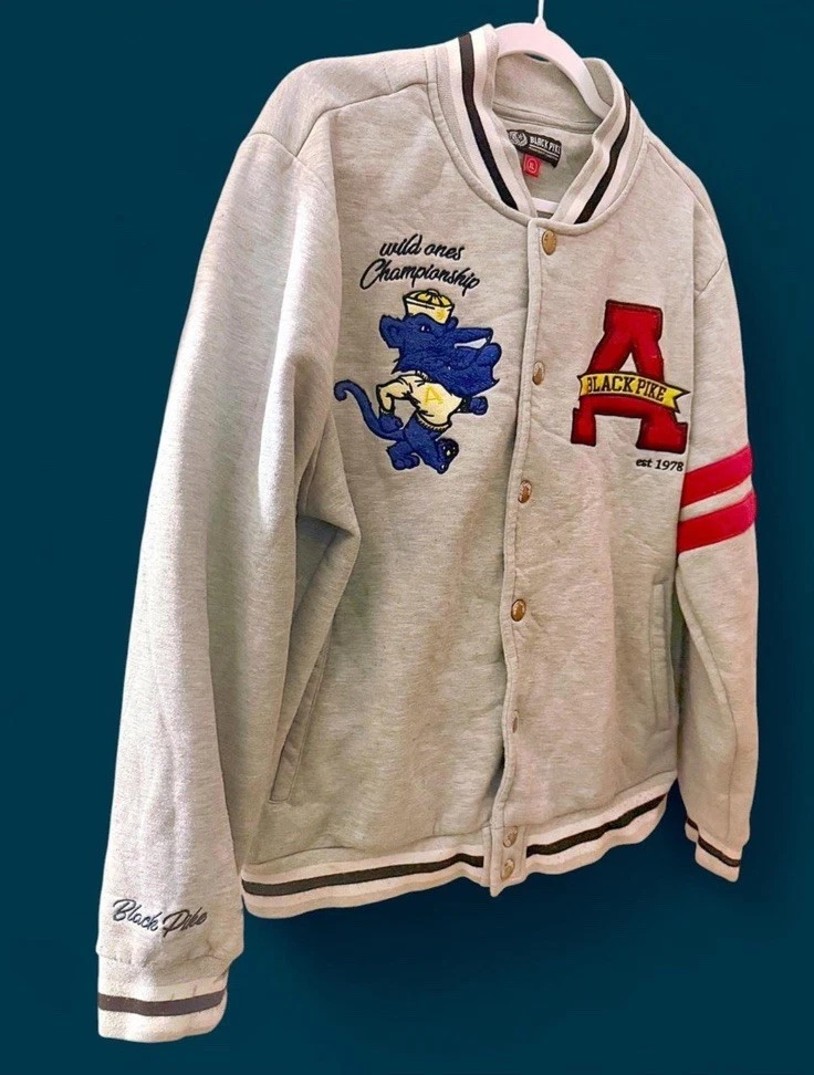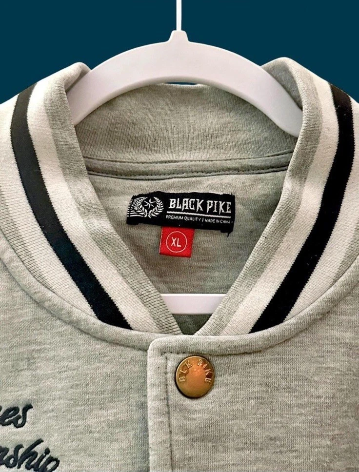 The NWT Black Pike State Champions Varsity Jacket in size M features a stylish striped pattern, snap closure, and side pockets. Made from a comfortable cotton blend, this mid-length jacket has a classic fit and is suitable for various occasions such as travel, parties, casual wear, and business events. With a vintage look and featuring the collar style of a band collar, this jacket is perfect for the winter, summer, fall, and spring seasons. The jacket is designed for sports enthusiasts who enjoy activities like track and field, rugby, walking, volleyball, soccer, or skateboarding.