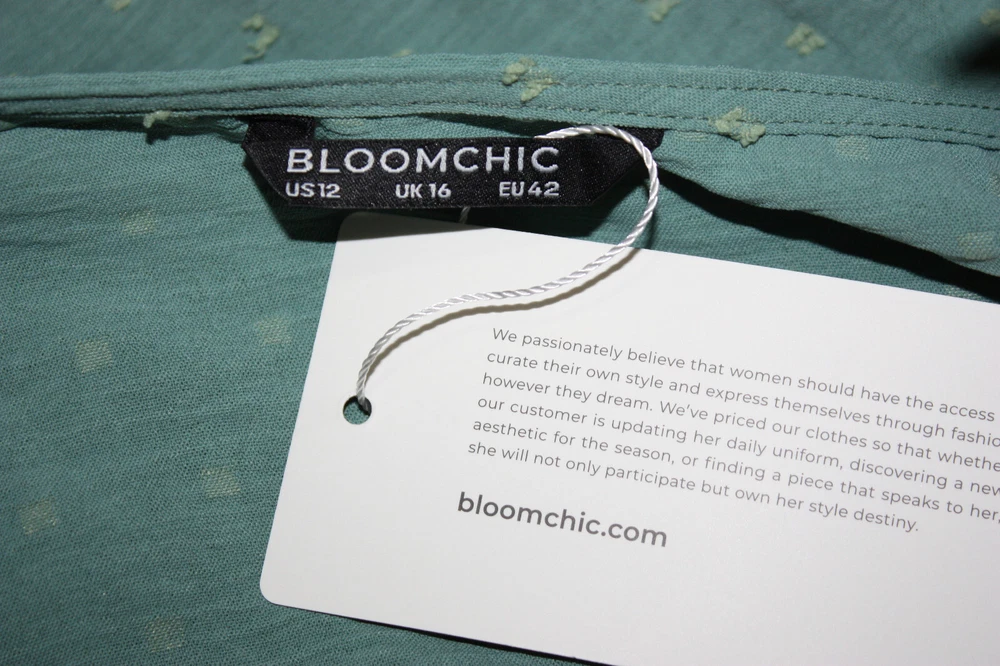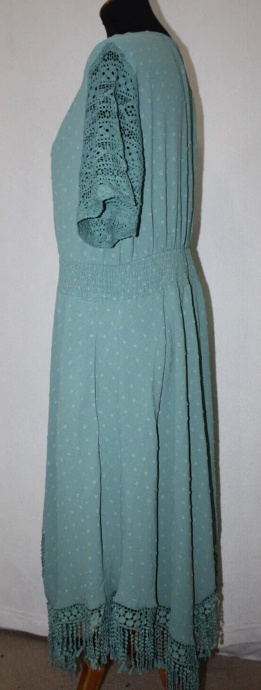 Welcome to Pim's clothing sales Mint green dress with Swiss dot designs. Pullover. Elastic Empire waist. Crochet lace short sleeves and fringed hem. Brand: Bloomchic Material: 100% Polyester body, Cotton and Nylon lace Size: 12 US tagged - see measurements below Shoulders: 17 Bust: 22 armpit to armpit Waist: 16 measured across Length: 49 shoulder to hem (Ask if you need more measurements) Please Remember all Clothing Items may fit differently depending on Brand, Fit, Use or Prior customization. We strongly urge our customers to check measurements first to guarantee proper fitting. Please be sure to check out our listings frequently for more high quality Designer Brand clothing items at a fraction of the price. We are getting new inventory all the time! You never know what amazing deals you may find :) Shipping discounts will be provided for multiple purchases - Please contact us after multiple purchases for an updated invoice.