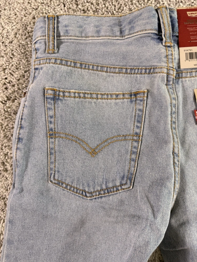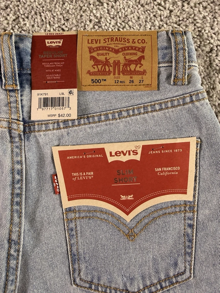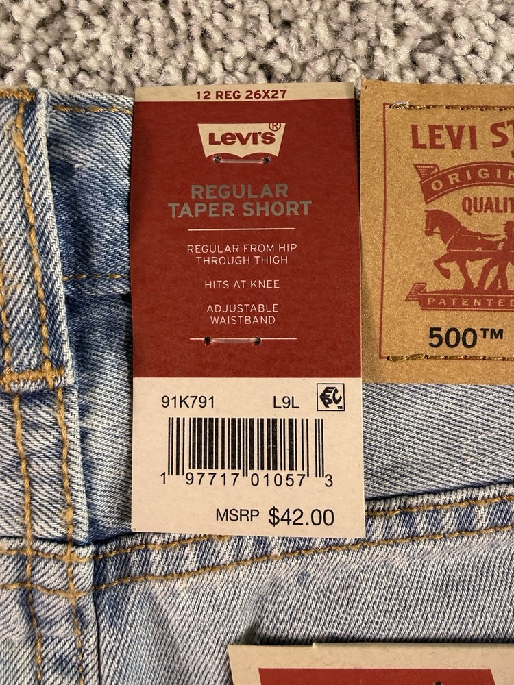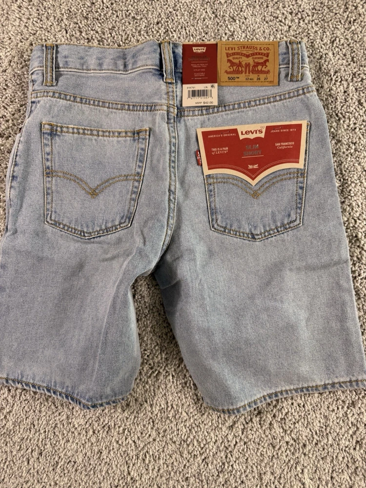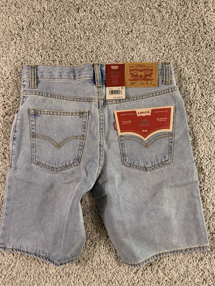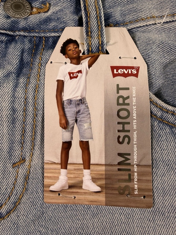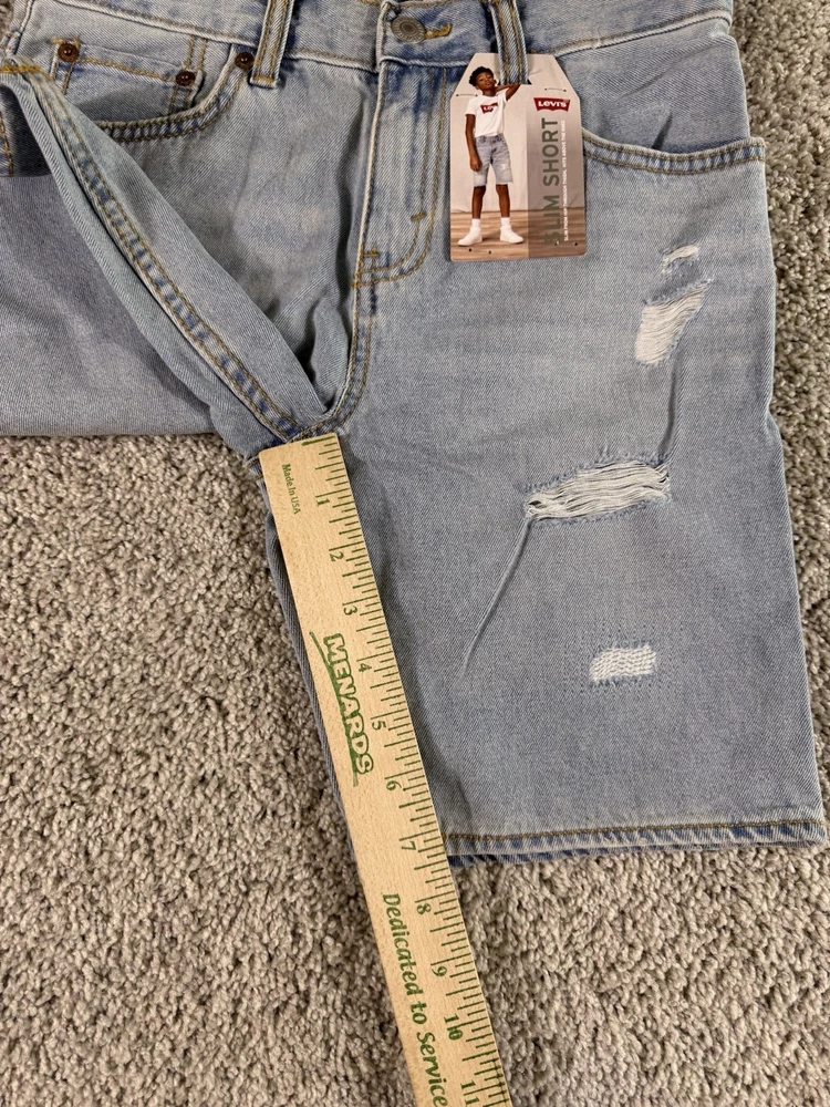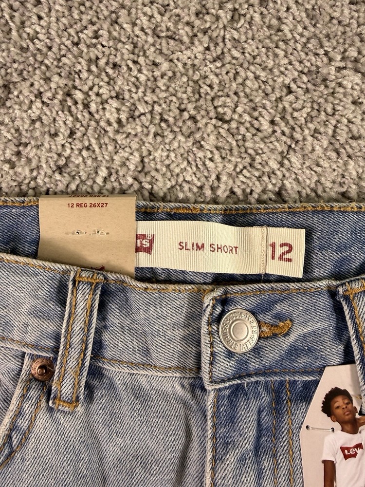 This product is a pair of NWT Boys Levi’s Jean Shorts in size 12 regular, featuring a solid blue color and made of cotton denim fabric with a light wash. The shorts have a zip closure and are machine washable. They have a regular fit and are part of the Levi's brand, designed for boys in a chino style. These shorts are from Vietnam and are ideal for everyday wear for young boys. 4760