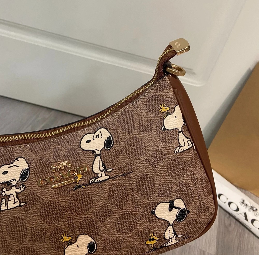 NWT COACH x PEANUTS CBJ88 Teri Shoulder Bag Tan Brown Snoopy Print Signature New