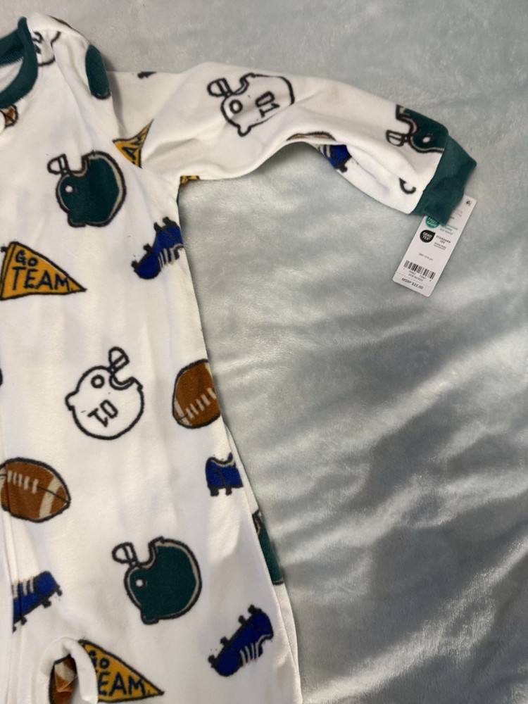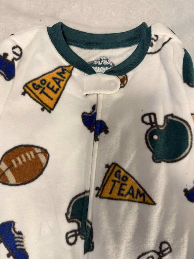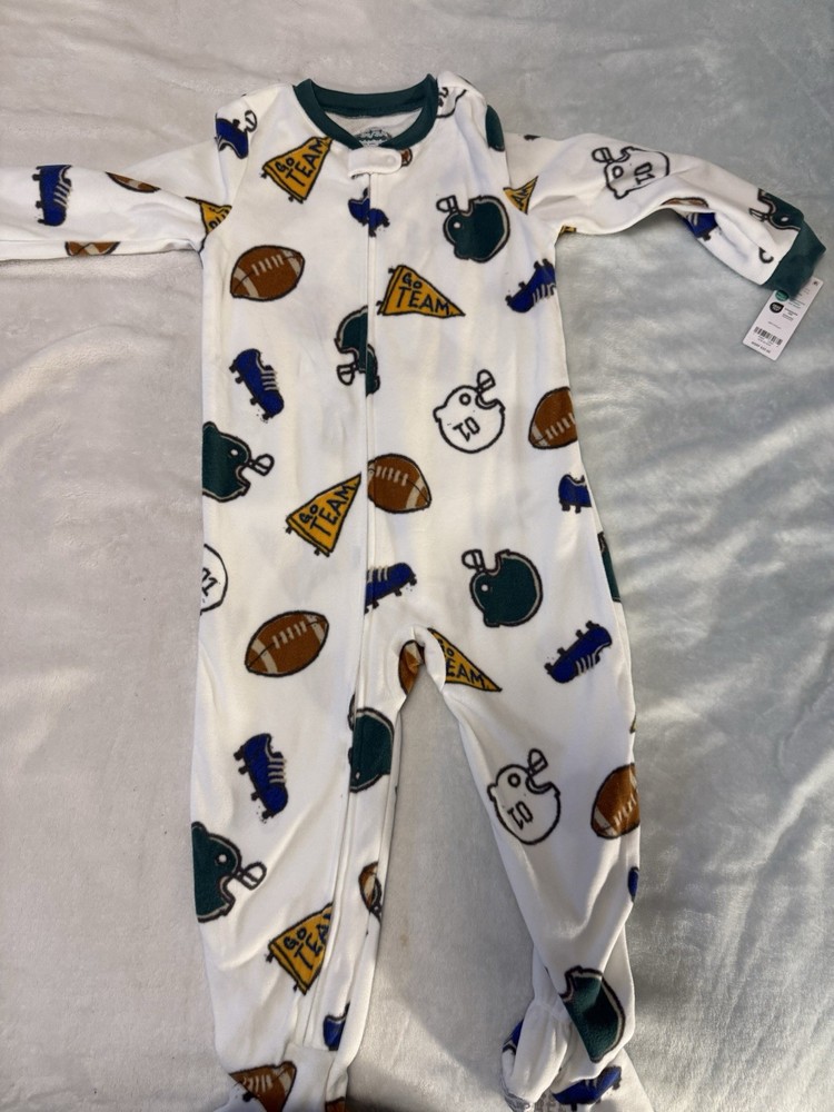 The NWT Carter’s Fleece Football Footed Sleeper in size 3T is a cozy and fun toddler pajama featuring a football theme. Made of polyester fleece in a white color, this full-zip pajama sleeper has long sleeves and is adorned with helmet, flag, cleat, and ball patterns, perfect for little football players and fans. The one-piece design includes a zipper closure for easy dressing and is suitable for all seasons, making it a versatile and stylish addition to any toddler's wardrobe.