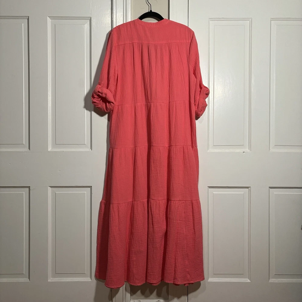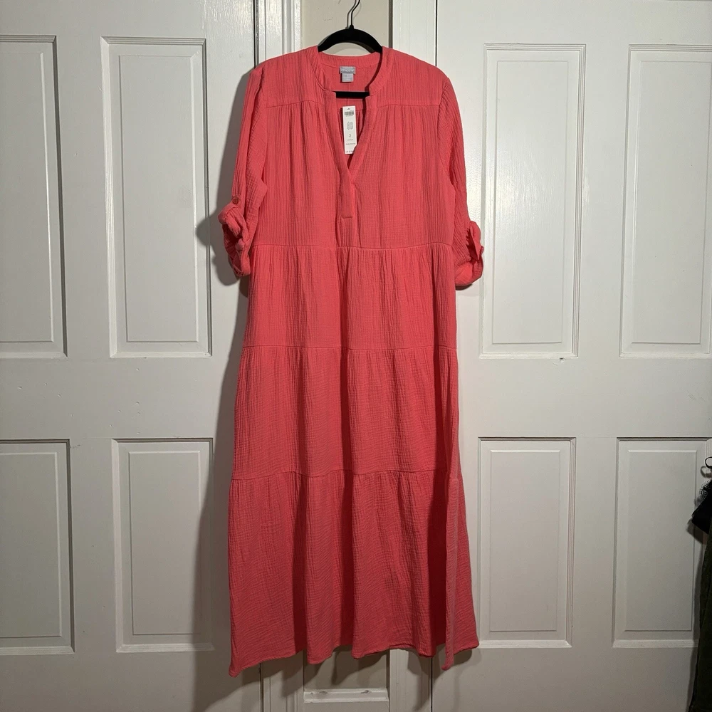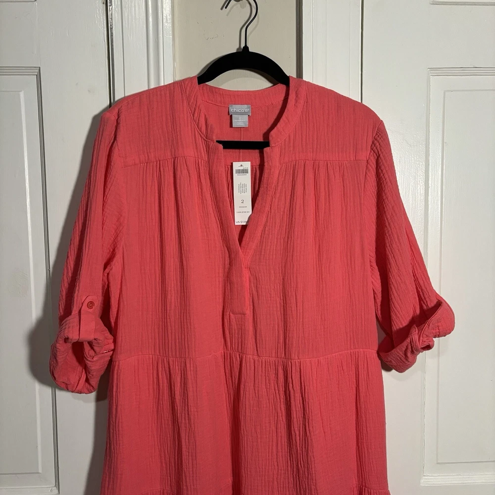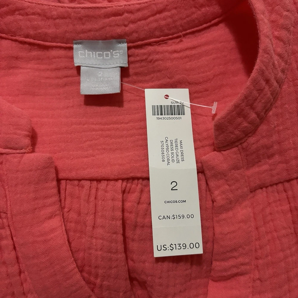 New with tags Chico’s Tiered Gauze Maxi Dress in Calypso Coral Pink. Flawless Chicos Size 2 (Large) 22” across chest 22” across waist 30” across hips 52” long 7.5” sleeve inseam * STYLE: 570308308 * The Fabric: Lightweight gauze fabric. * 100% cotton * Machine wash * Relaxed fit * 3/4 sleeves * Slant pockets * V-neck * A-line A4