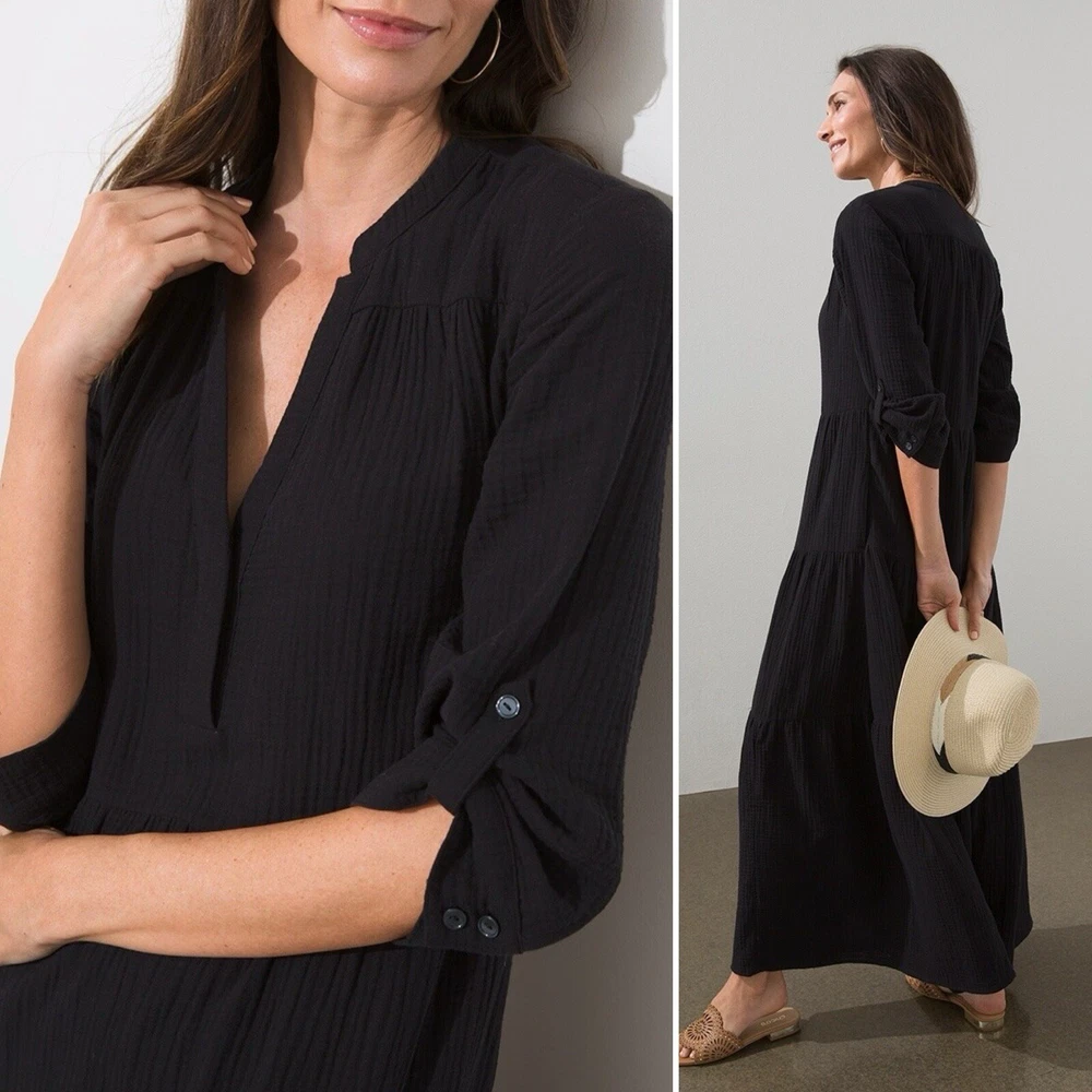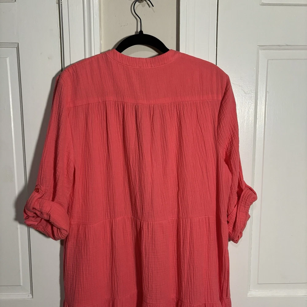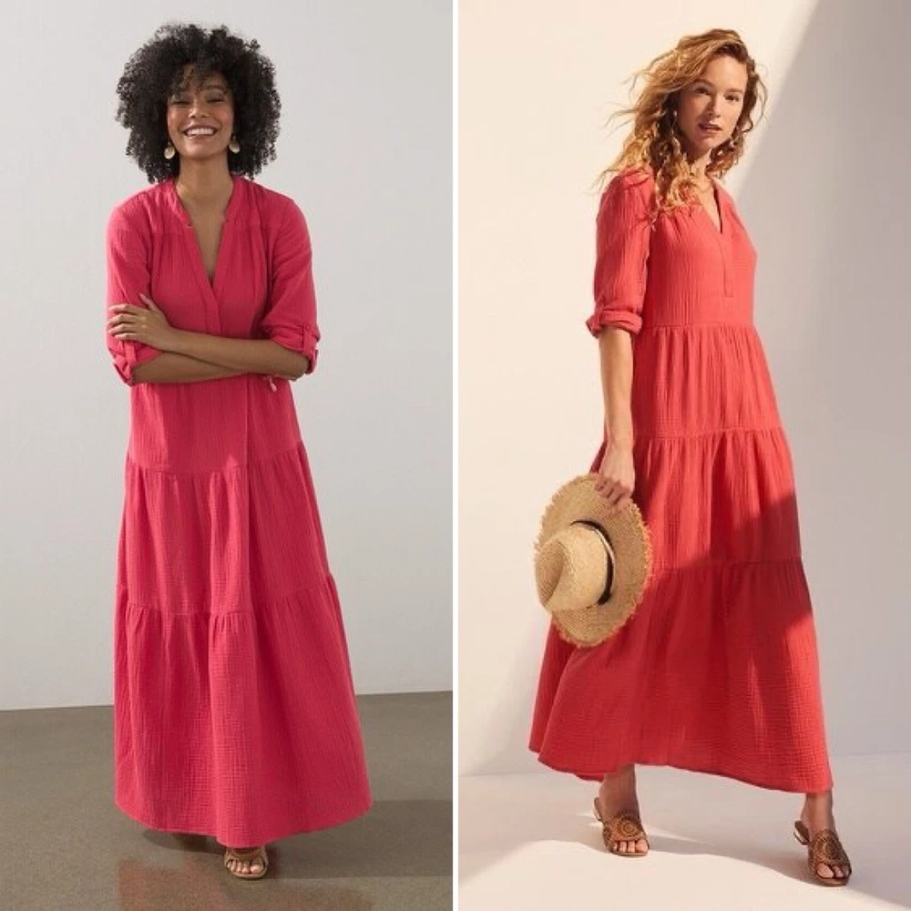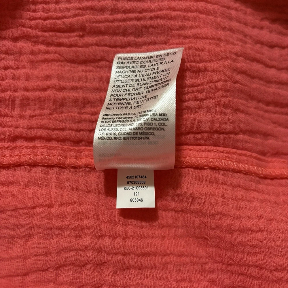 New with tags Chico’s Tiered Gauze Maxi Dress in Calypso Coral Pink. Flawless Chicos Size 2 (Large) 22” across chest 22” across waist 30” across hips 52” long 7.5” sleeve inseam * STYLE: 570308308 * The Fabric: Lightweight gauze fabric. * 100% cotton * Machine wash * Relaxed fit * 3/4 sleeves * Slant pockets * V-neck * A-line A4