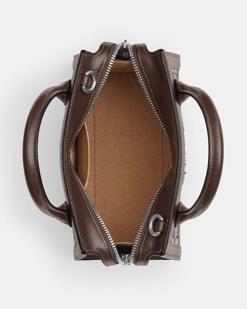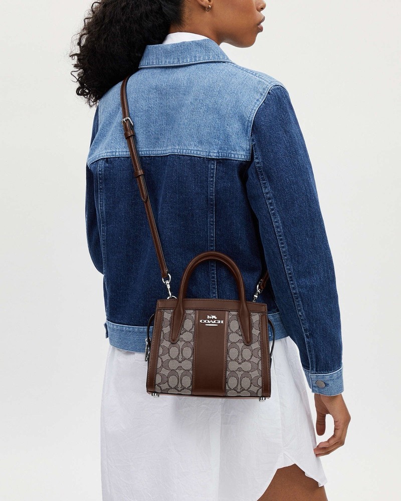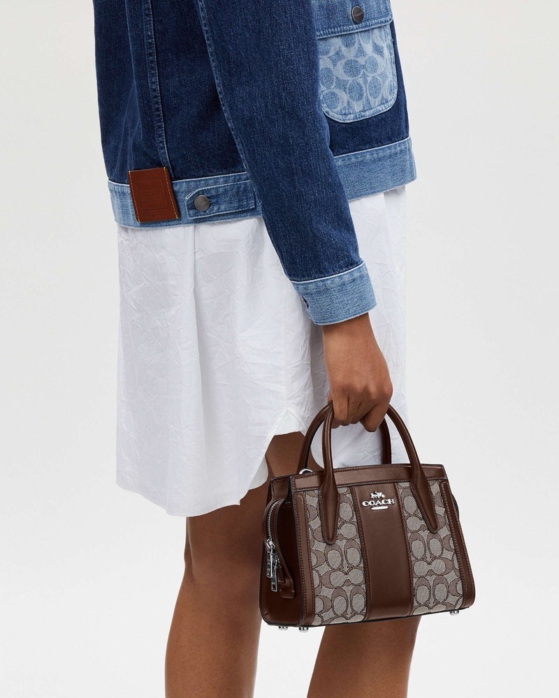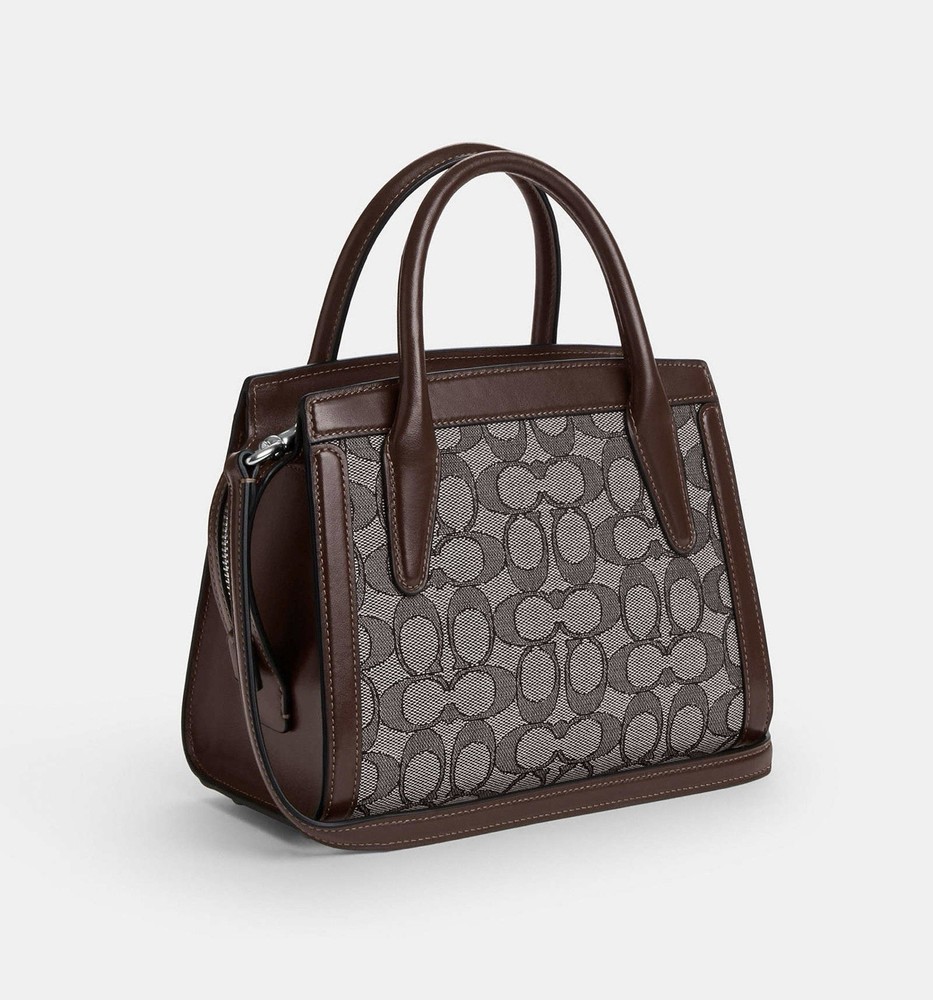 Coach Andrea Carryall Bag In Signature Jacquard Brand new with tags 100% Authentic Style Number CT766 Measurements Length: 8.75" Height: 6.5" Width: 4.5" Materials Signature jacquard and refined calf leather Fabric lining Handle Handles with 3.25" drop Strap Detachable strap with 21.75" drop for shoulder or crossbody wear Features Inside multifunction pocket Zip closure Four protective feet at base Additional Details Exclusive of trim, this Coach piece is crafted of our Signature jacquard made from a blend of organic cotton and recycled polyester"
