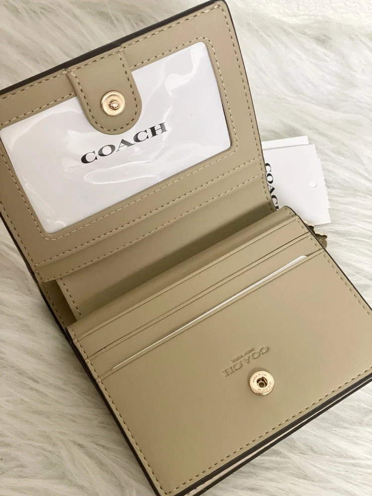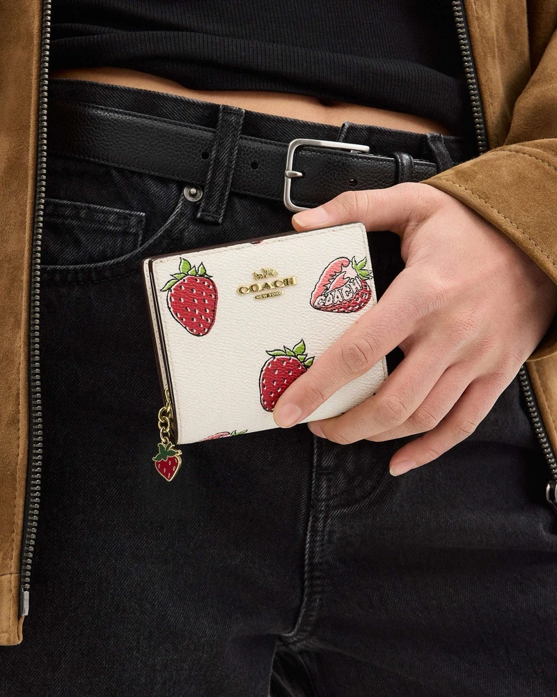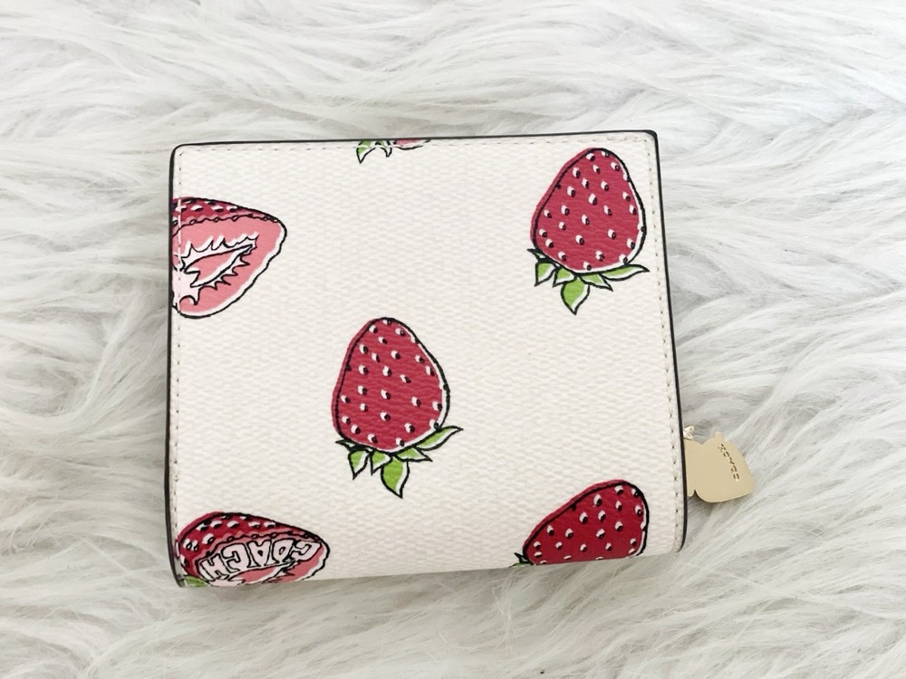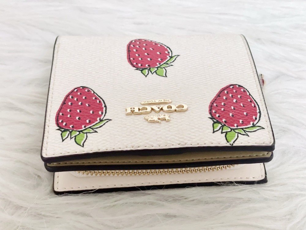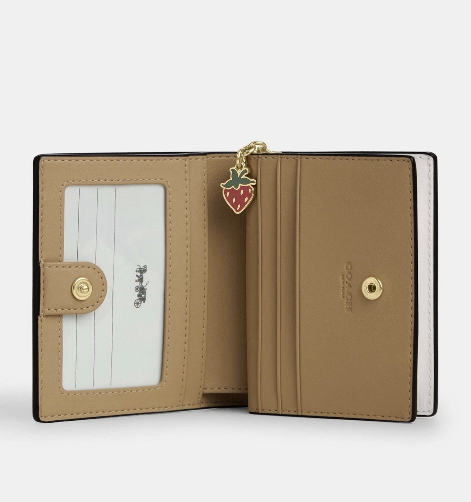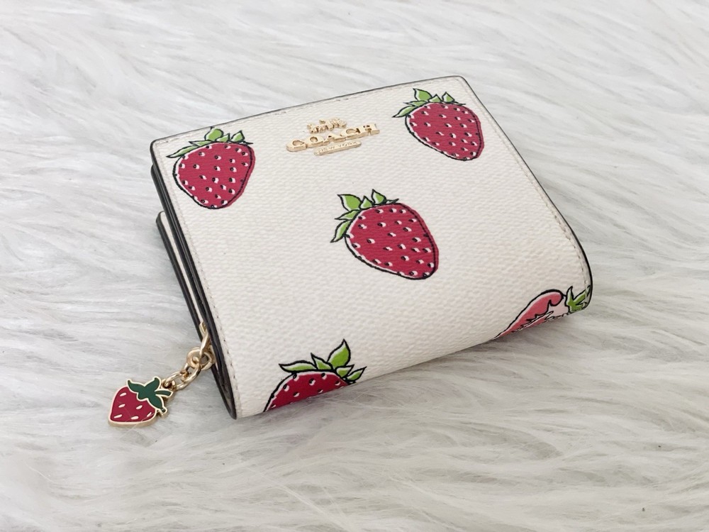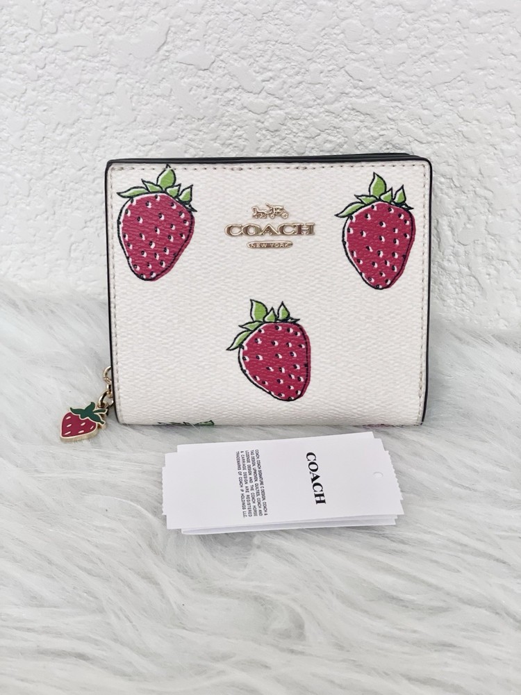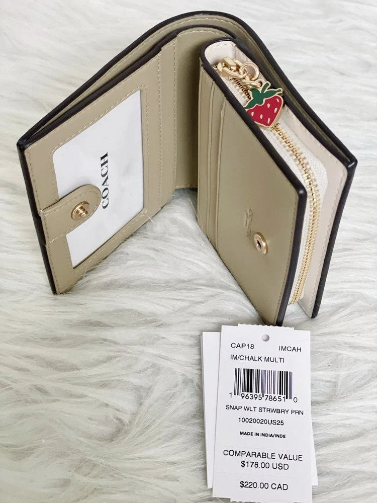 NWT Coach CAP18 Snap Wallet With Strawberry Print In Gold/Chalk Multi 100% Authentic Limited Edition Style Number: CAP18 Measurements Length: 4.25" Height: 3.5" Width: 1.0" Materials Printed coated canvas Features Outside zip coin pocket Three credit card slots Snap closure Full-length bill compartment Additional Details ID window Note: The strawberry patterns were randomly arranged