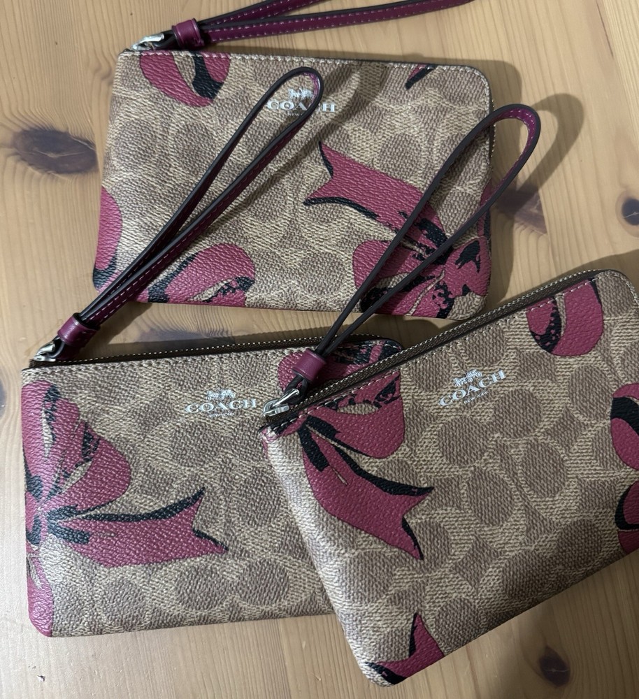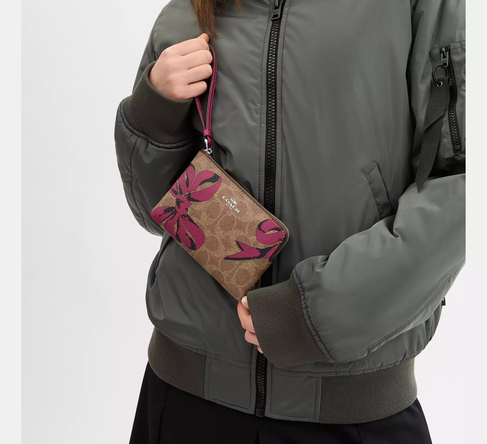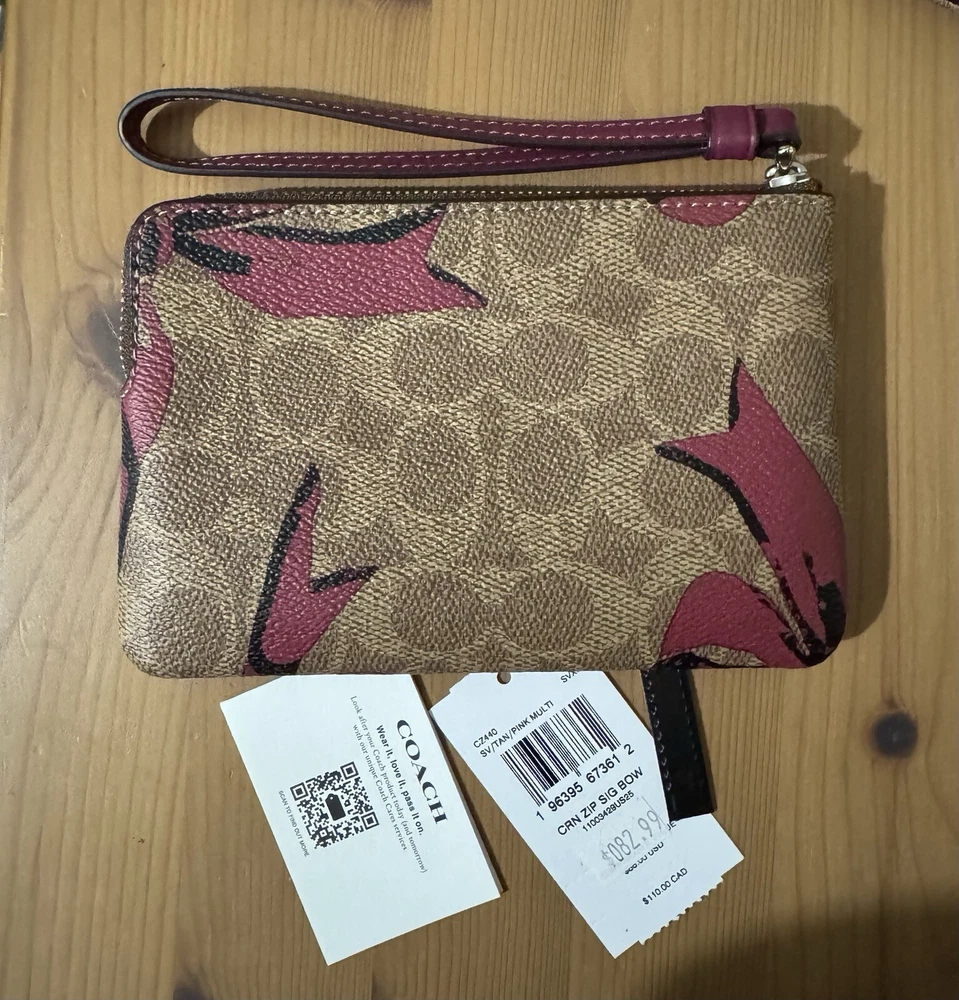 Signature canvas/Silver/Tan/Pink Multi CZ440 Length: 6.25", Height: 4.0", Width: 0.5" Signature coated canvas. Fabric lining Wrist strap attached Two credit card slots, Zip-top closure Packaging may vary Placement of the ribbon prints may vary
