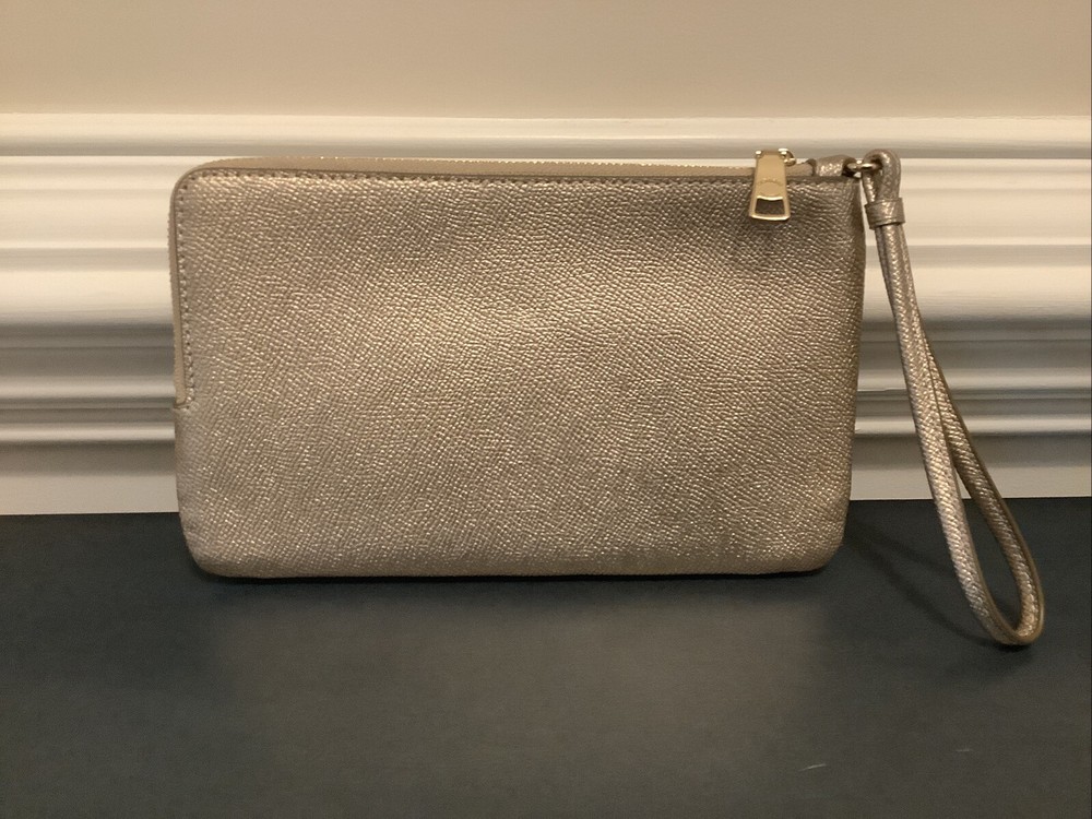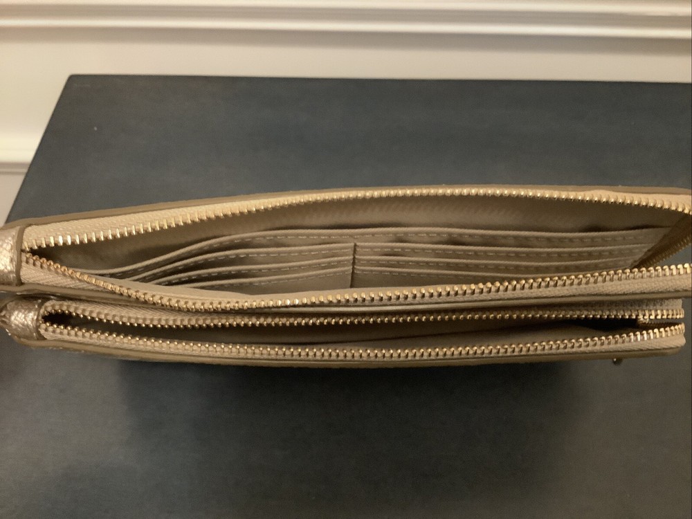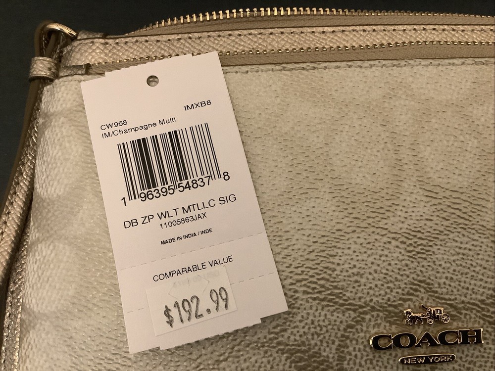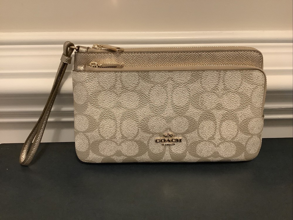 NWT Coach Double Zip Wallet In Signature Canvas Color Gold/Champagne Multi CW968 Measurements Length: 8.0" Height: 4.75" Width: 1.0" Materials Pearlized Signature coated canvas and metallic crossgrain leather Fabric lining Strap Wrist strap attached Features Eight credit card slots Double zip closure Fits all phone sizes up to an iPhone X and Samsung S7 Edge Please note that the color in pictures might different slightly due to lighting, flash and screen resolution. All items are from smoke free environment.