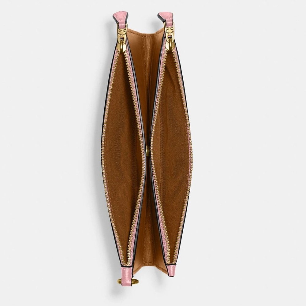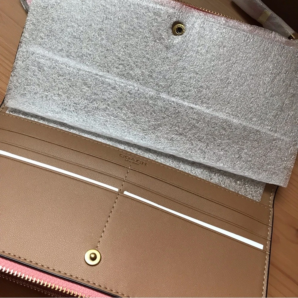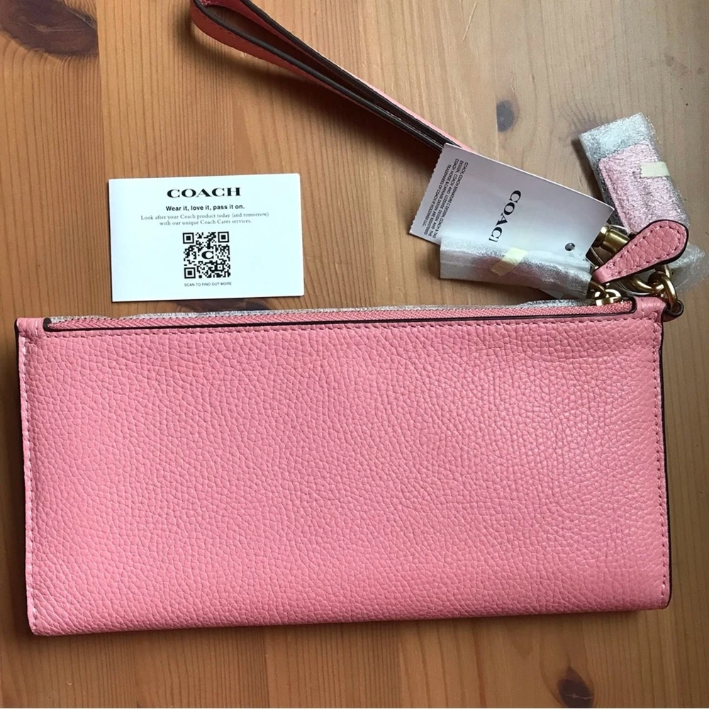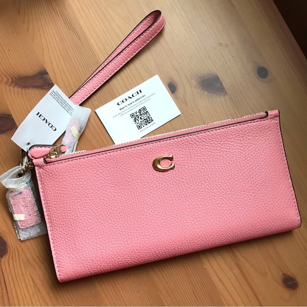 Brass/Bubblegum Polished pebble leather Twelve credit card slots Inside multifunction pockets Snap closure Two zip pockets Detachable wrist strap 8 1/4" (L) x 4" (H) x 1/2" (W) Style No. CC553