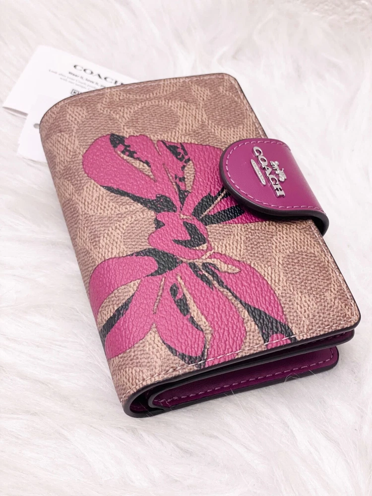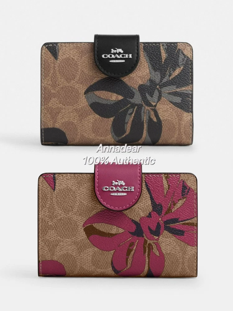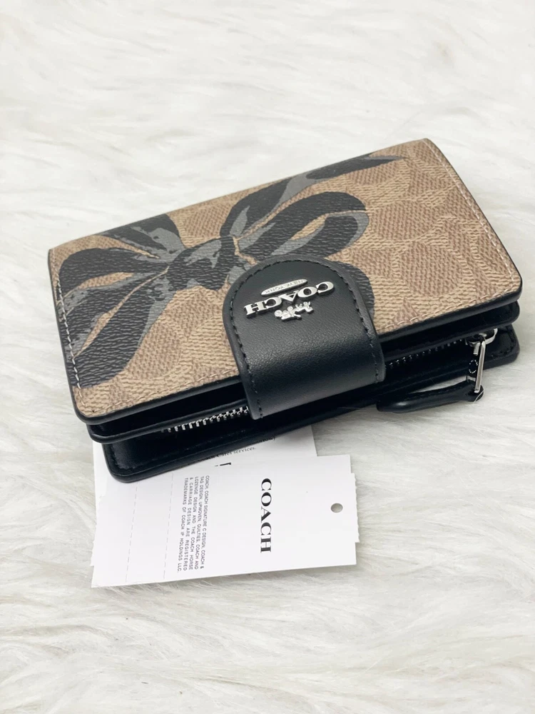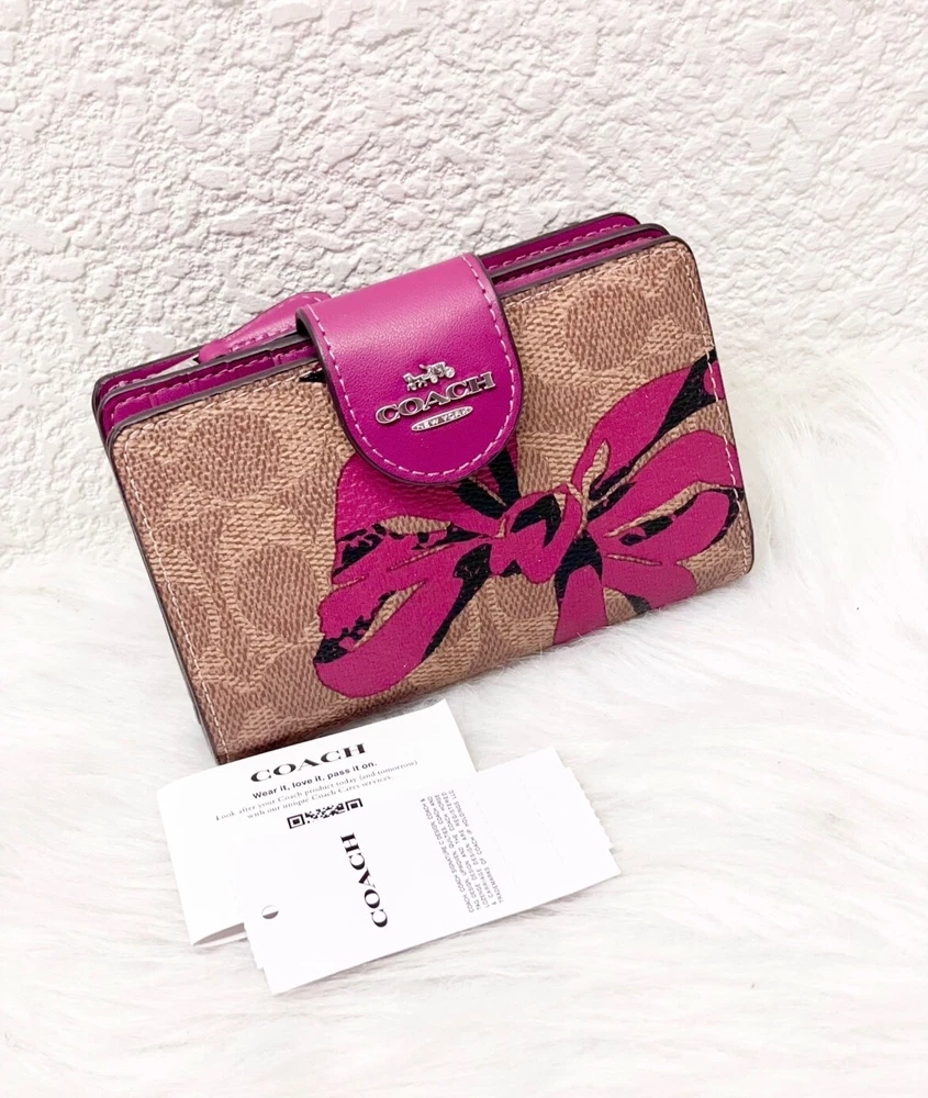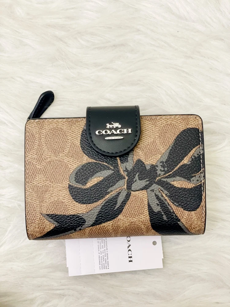 NWT COACH SIGNATURE BOW CORNER ZIP MEDIUM WALLET Fast shipping Brand new with tags 100% Authentic Style Number CZ340 Measurements Length: 5.0" Height: 3.5" Width: 0.5" Materials Signature coated canvas Features Zip coin pocket Seven credit card slots Snap closure Bill compartment Additional Details ID window Price is firm *NOTE: Bow print is randomly arranged, so each wallets may look slightly different m