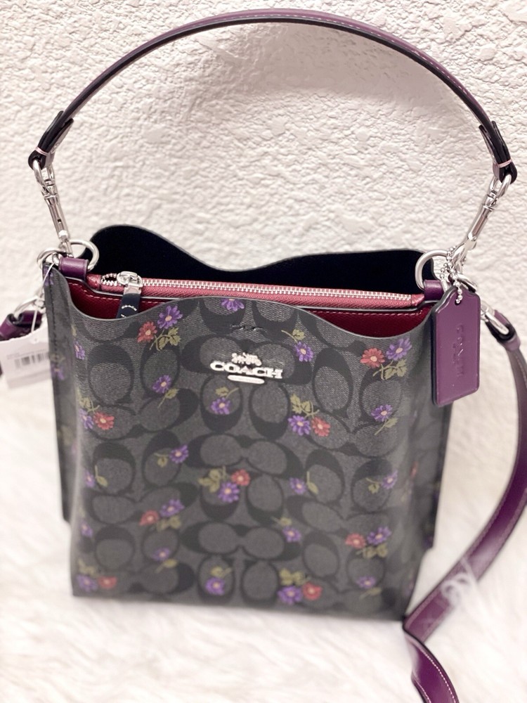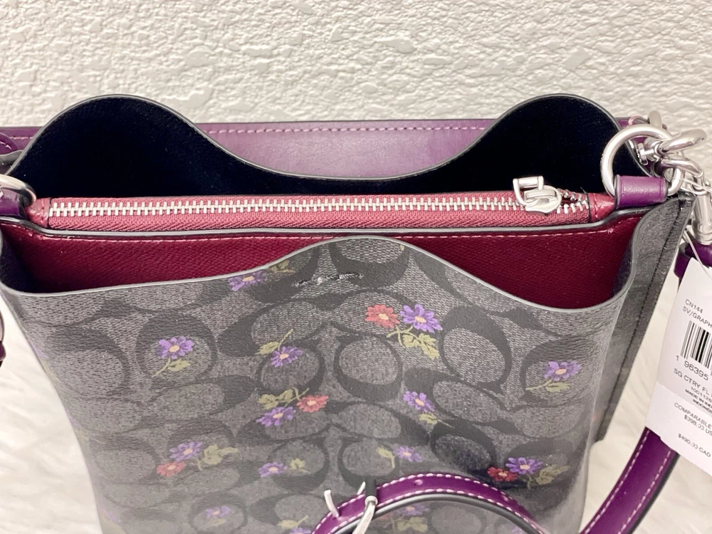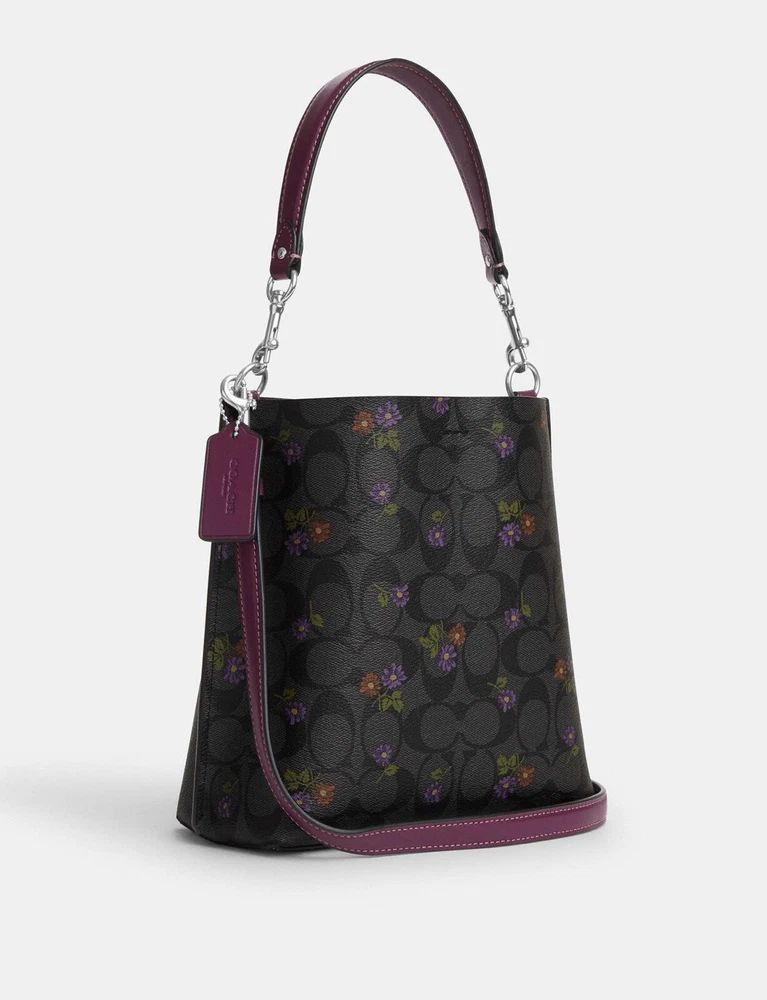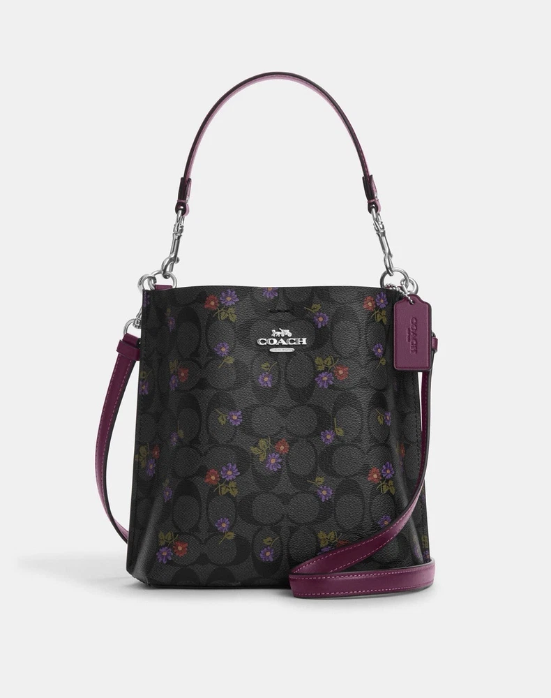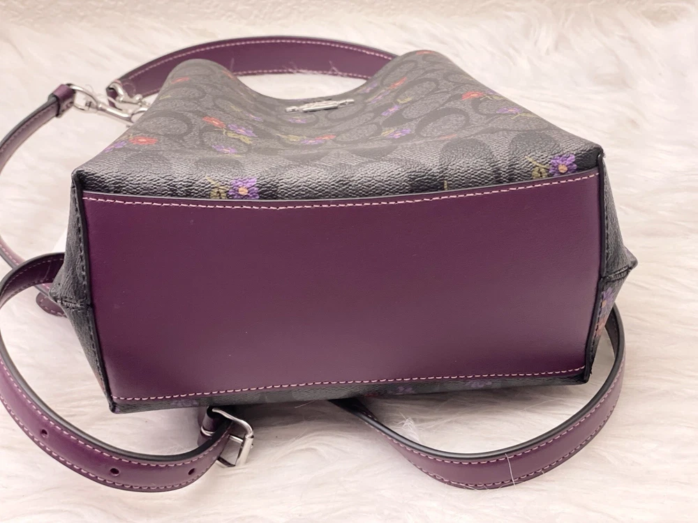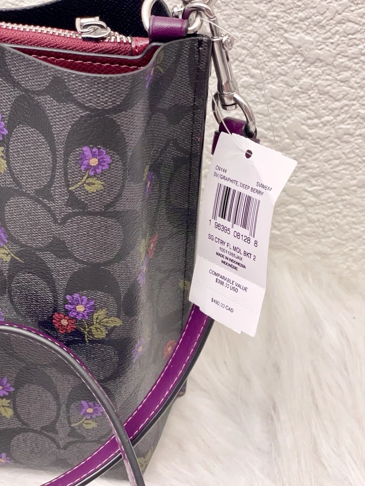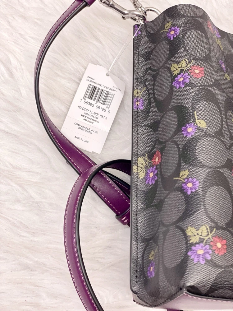 Coach Mollie Bucket Bag 22 In Signature Canvas With Country Floral Print Brand new with tags 100% Authentic Limited Edition Color:Silver/Graphite/Deep Berry Product Details Signature coated canvas and smooth leather Center zip compartment Snap closure Detachable handle with 6 3/4" drop Detachable strap with 22" drop for shoulder or crossbody wear 8" (L) x 8 1/2" (H) x 4" (W) Style No. CN144 Price is firm