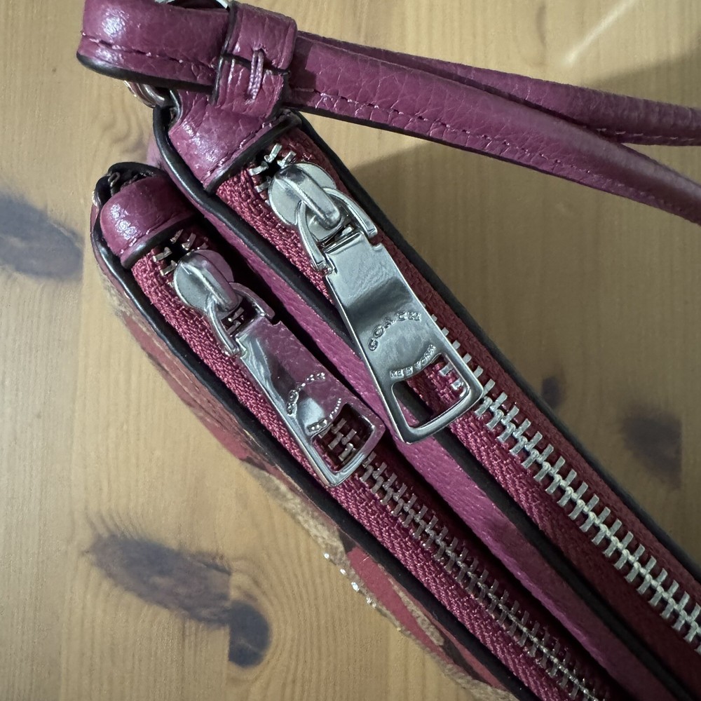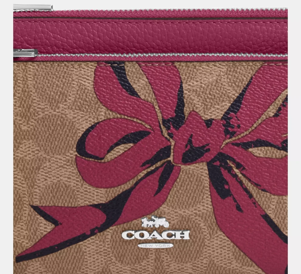 Silver/Tan/Pink Multi Product Details Style Number CAA84 Measurements Length: 8.0" Height: 4.75" Width: 1.0" Materials Signature coated canvas and refined pebble leather Fabric lining Strap Wrist strap attached Features Eight credit card slots Double zip closure Fits all phone sizes up to an iPhone X and Samsung S7 Edge The placement of the bow prints may vary